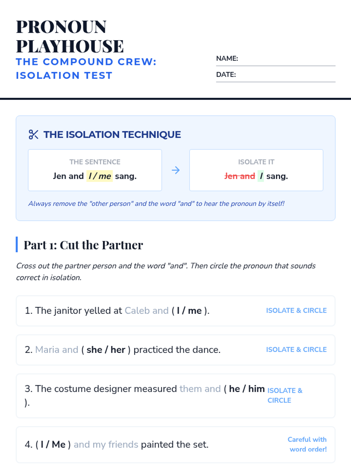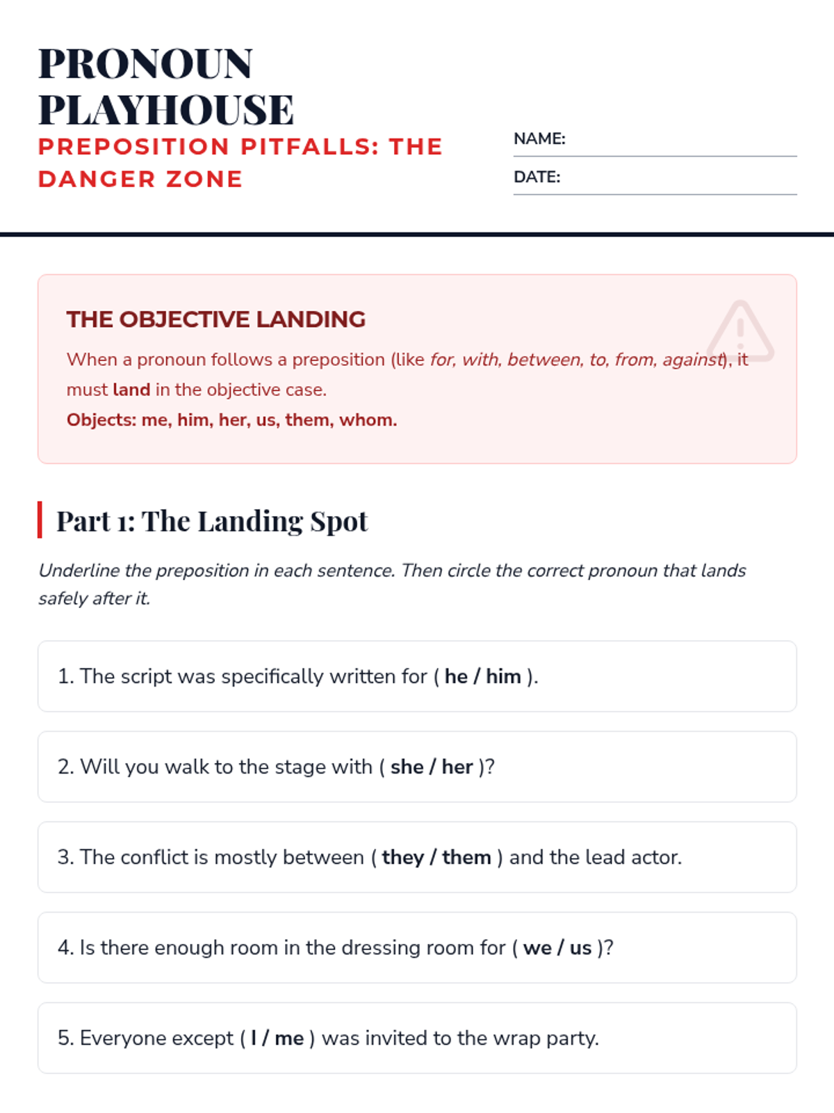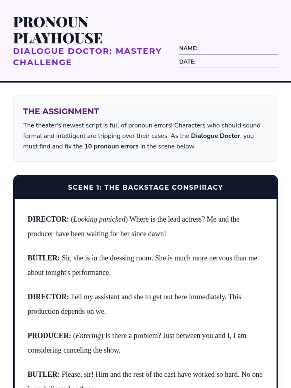 A comprehensive workshop-style sequence for 8th graders focusing on pronoun case (subjective, objective, possessive) and common usage pitfalls. Students learn to treat pronouns as actors and receivers through the metaphor of a theatrical production.