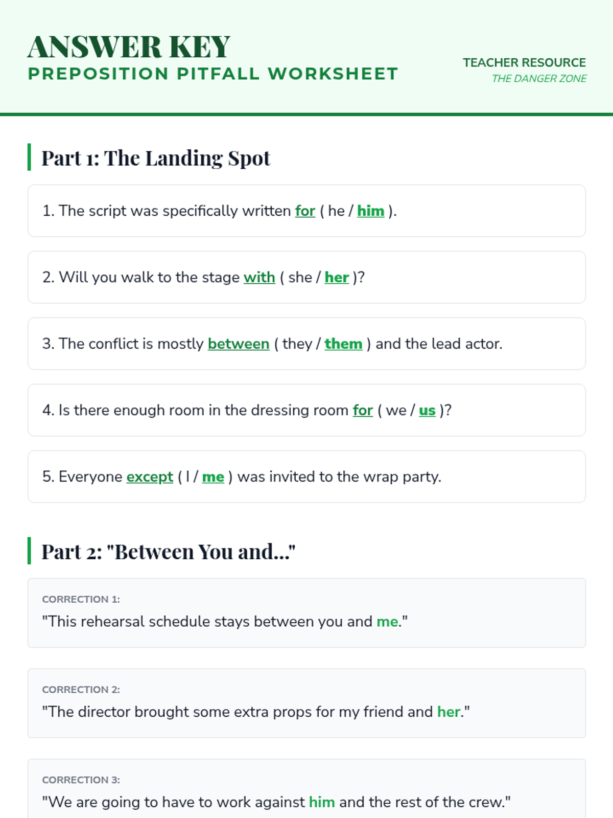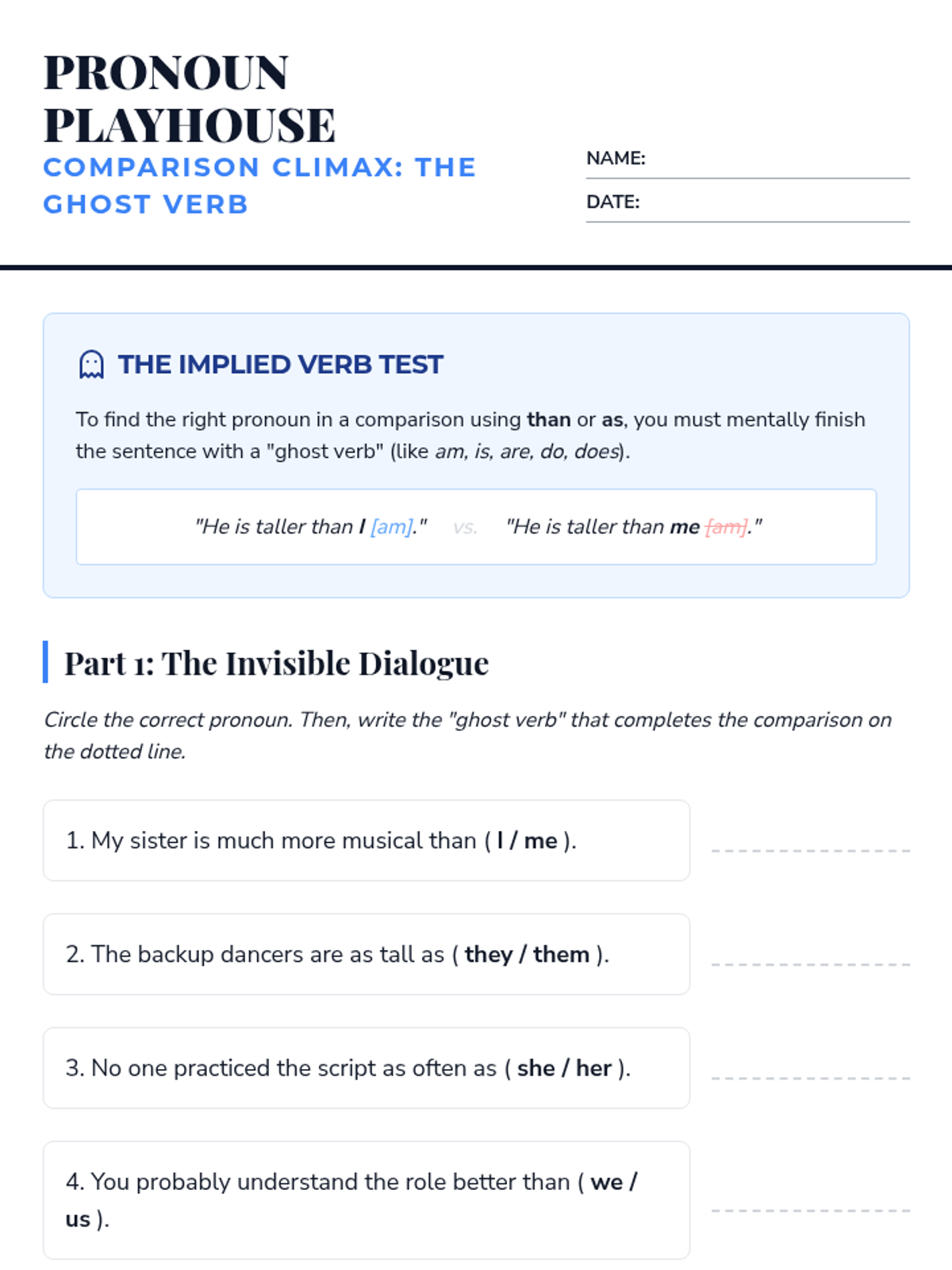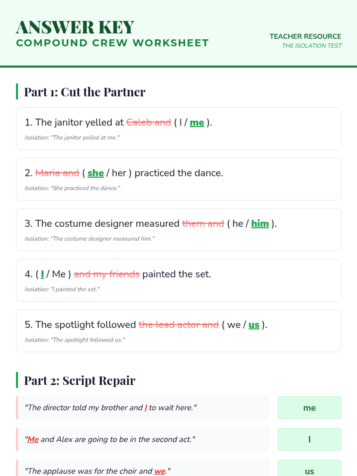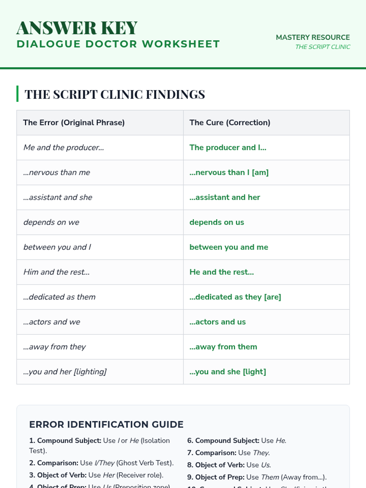 A comprehensive workshop-style sequence for 8th graders focusing on pronoun case (subjective, objective, possessive) and common usage pitfalls. Students learn to treat pronouns as actors and receivers through the metaphor of a theatrical production.