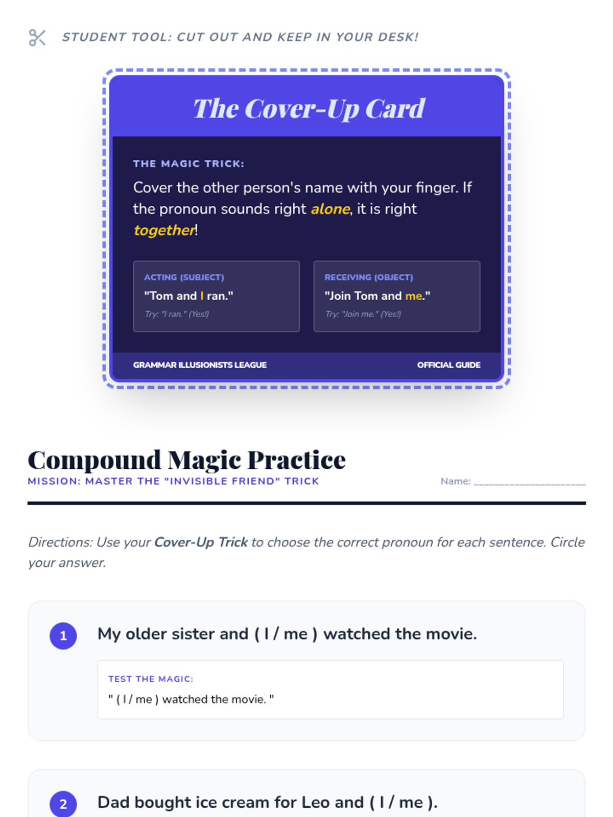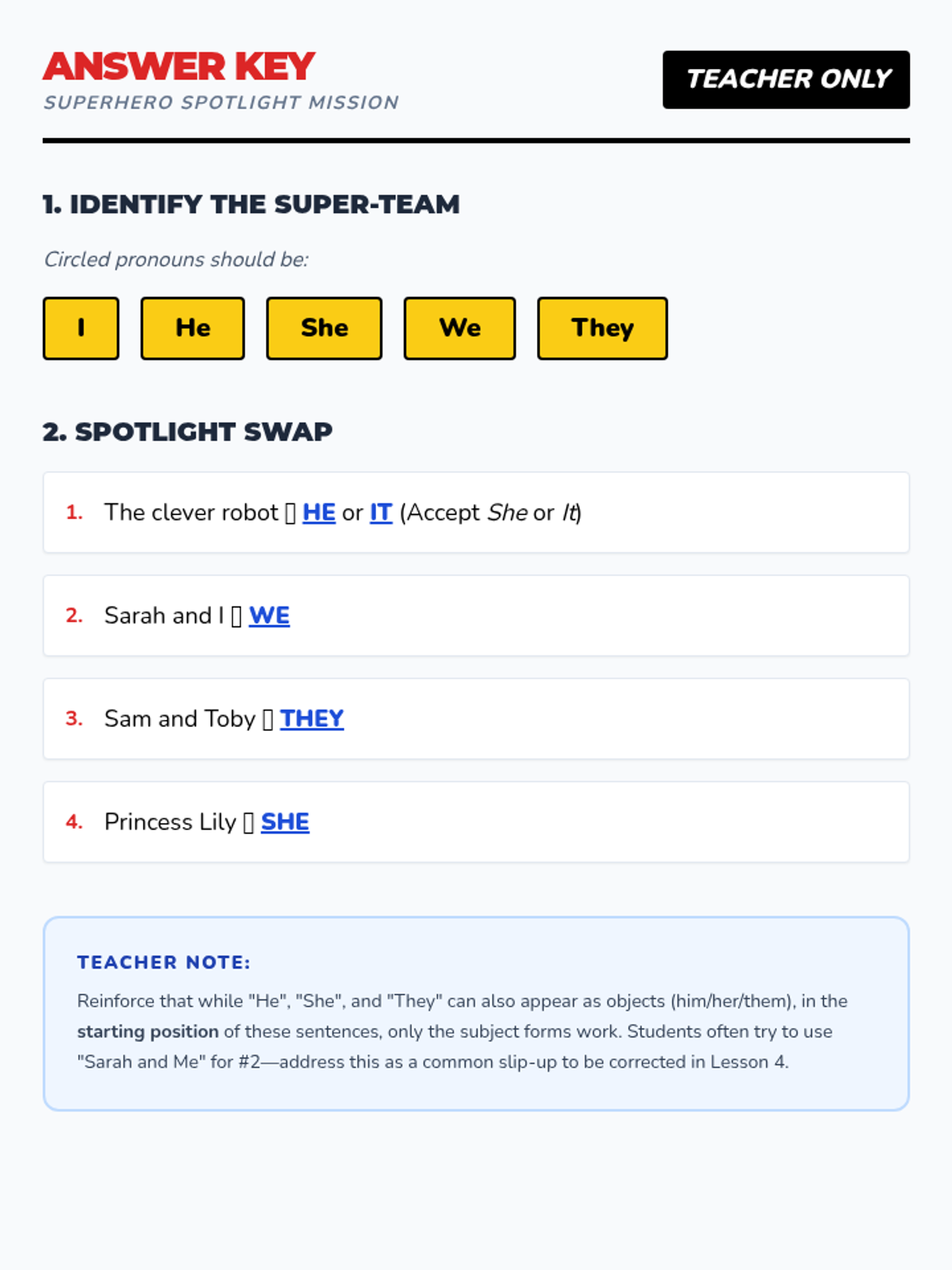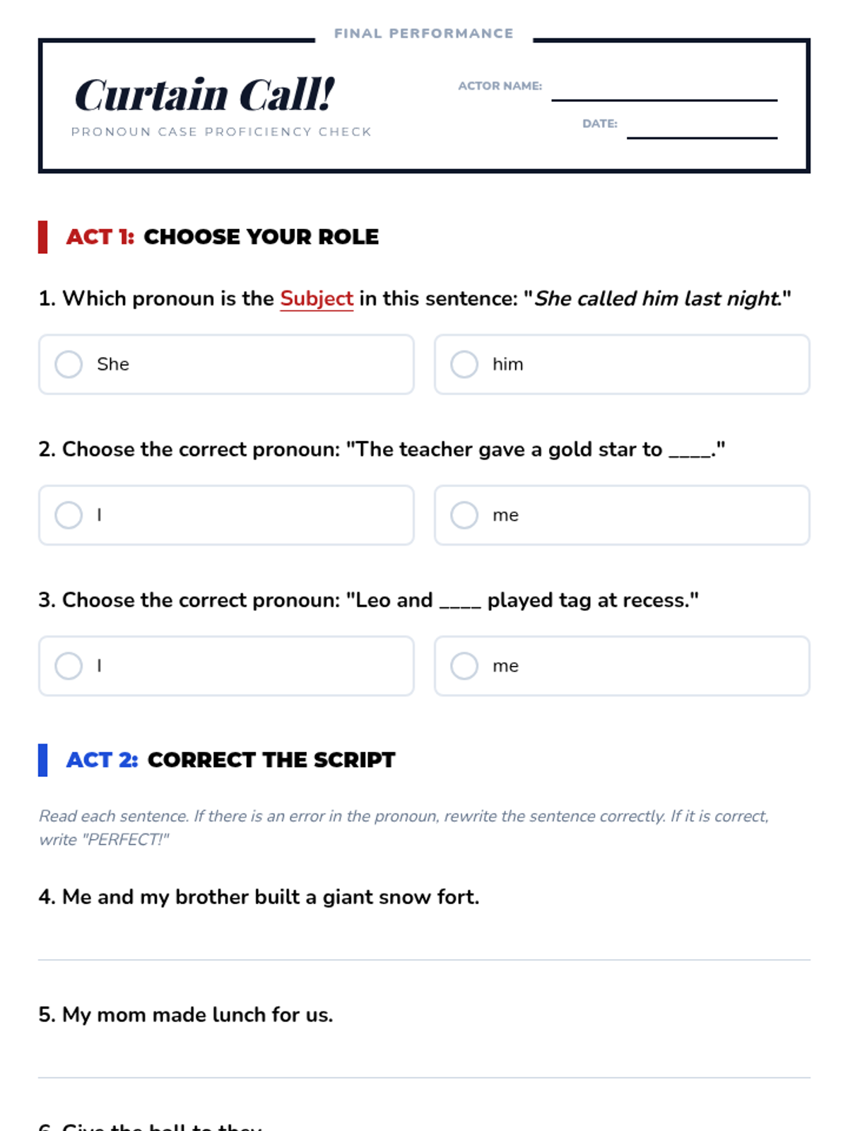 A 5-lesson sequence for 3rd graders focused on distinguishing between subject and object pronouns through a theater-inspired 'Actors vs. Receivers' framework. Students move from physical role-playing to mastering complex compound subjects and case proficiency.