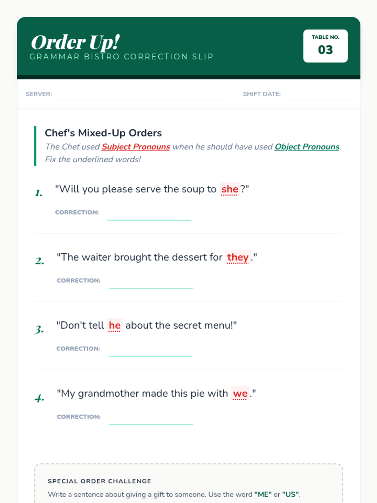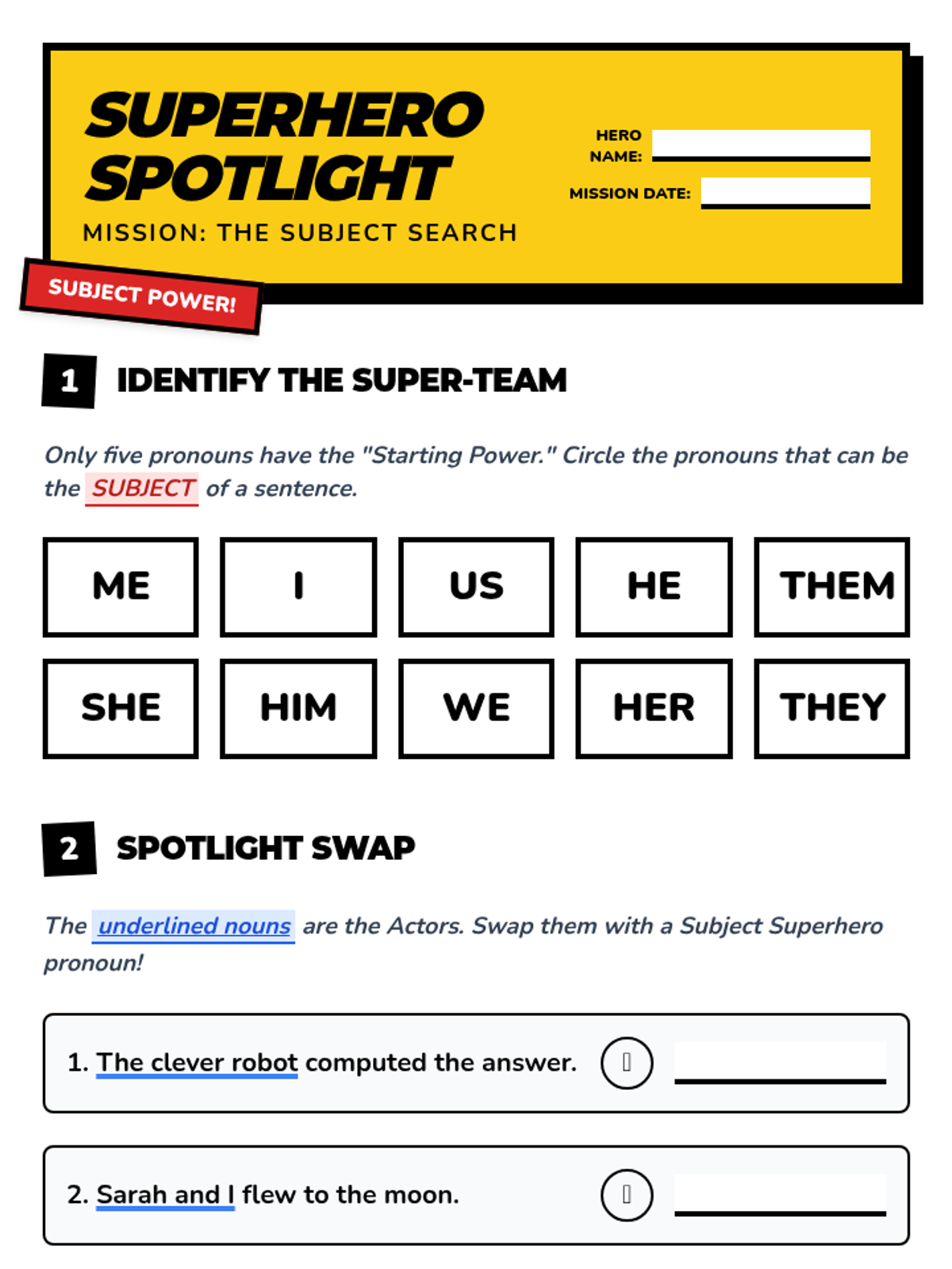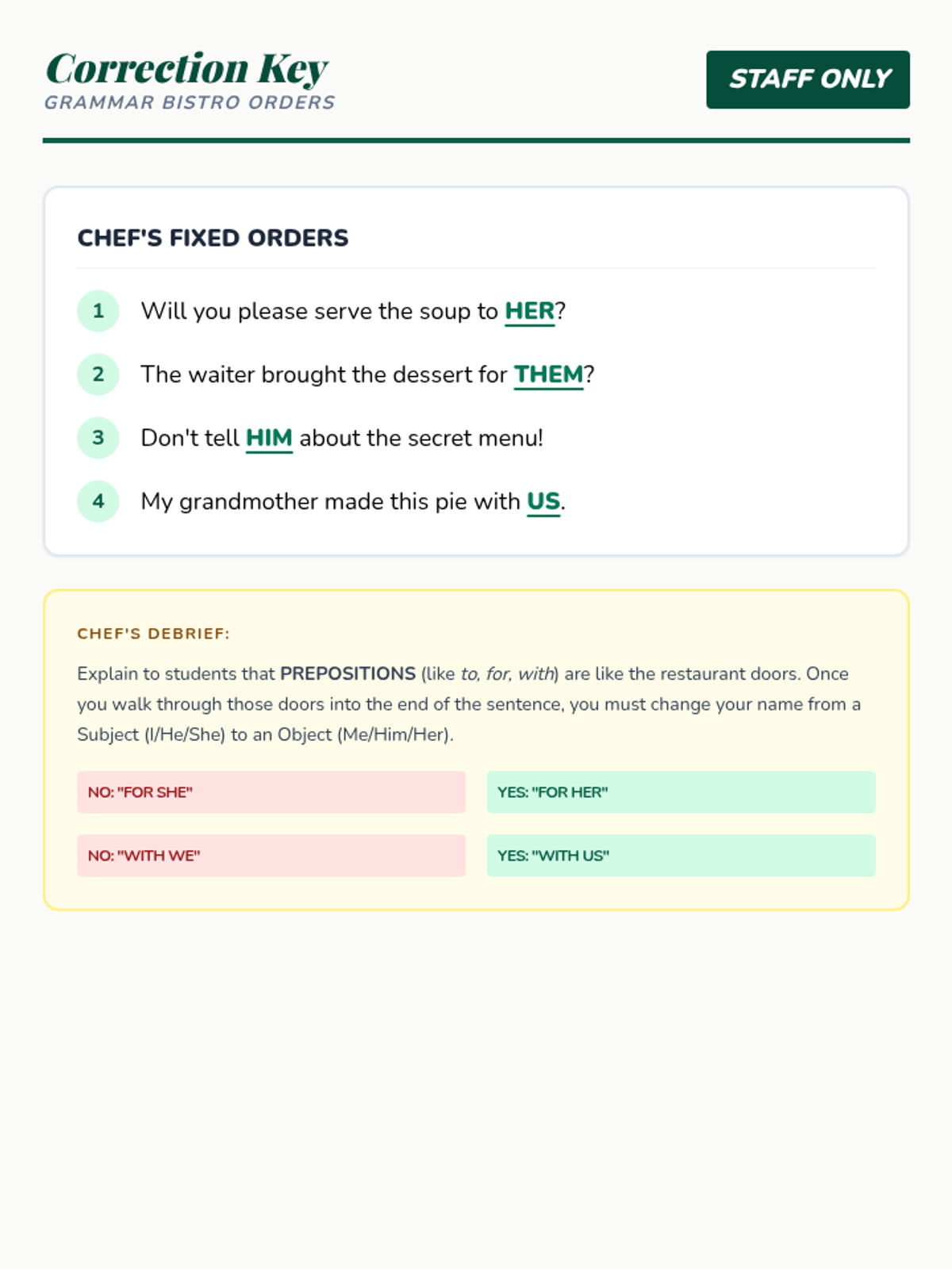 A 5-lesson sequence for 3rd graders focused on distinguishing between subject and object pronouns through a theater-inspired 'Actors vs. Receivers' framework. Students move from physical role-playing to mastering complex compound subjects and case proficiency.