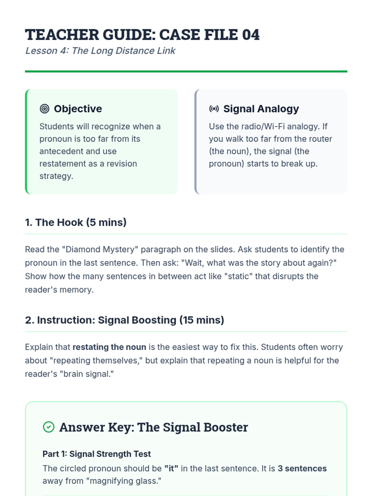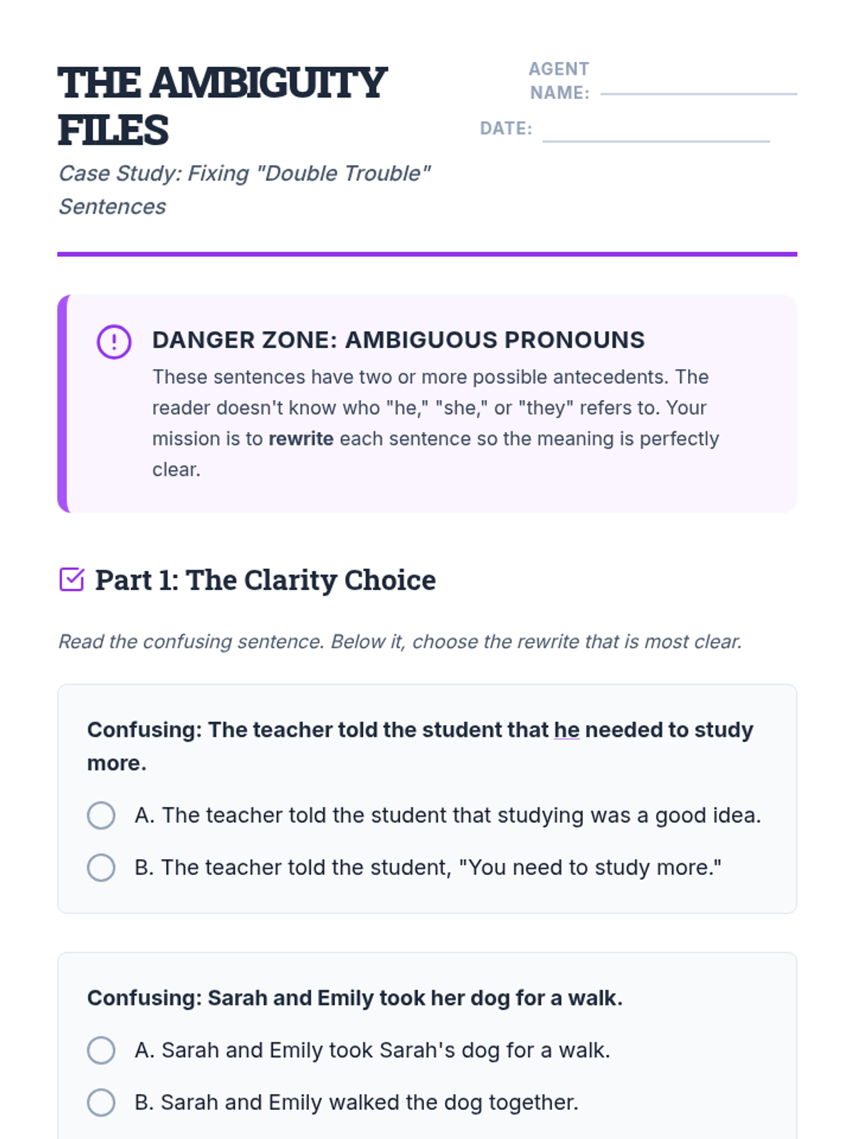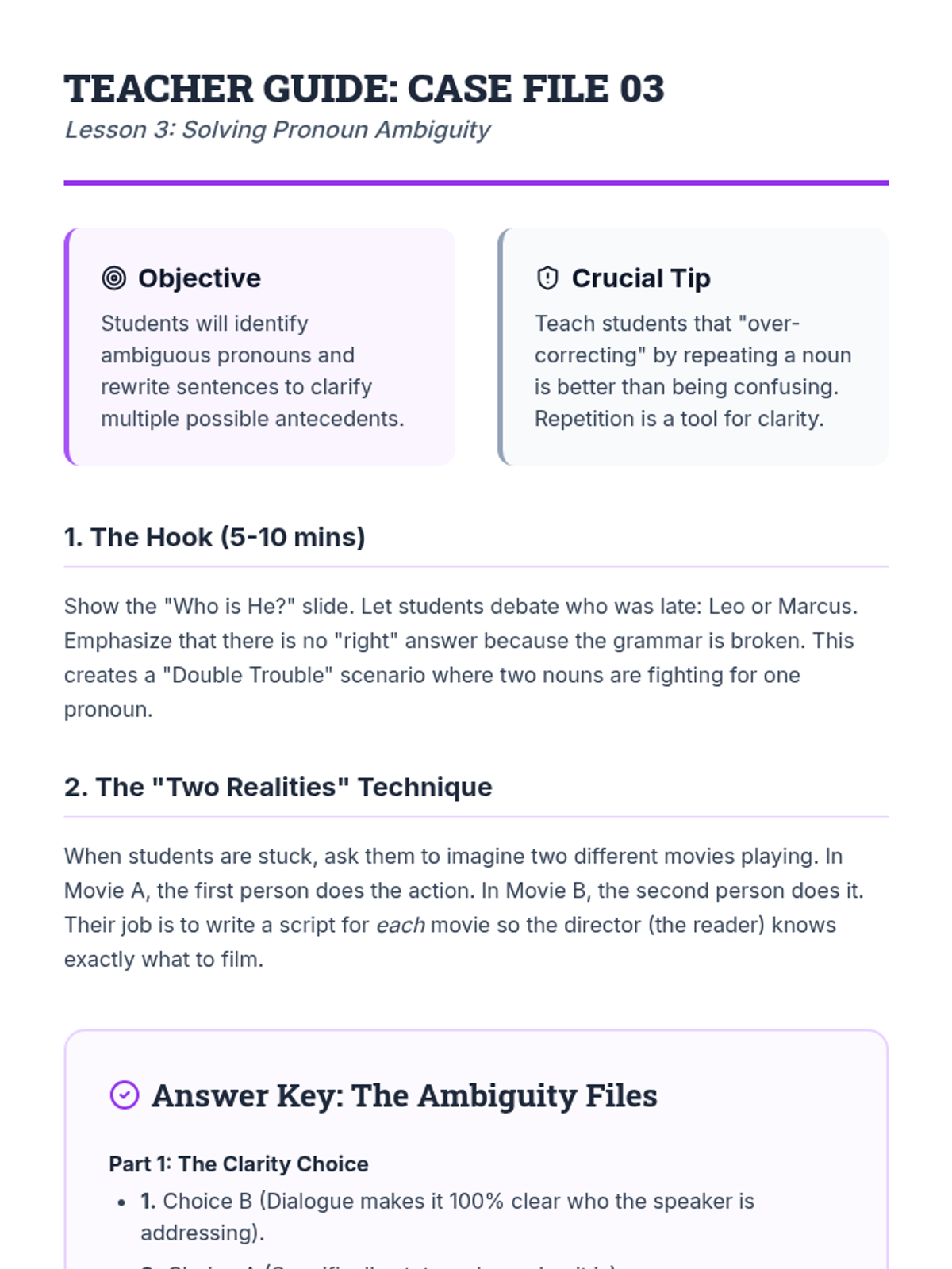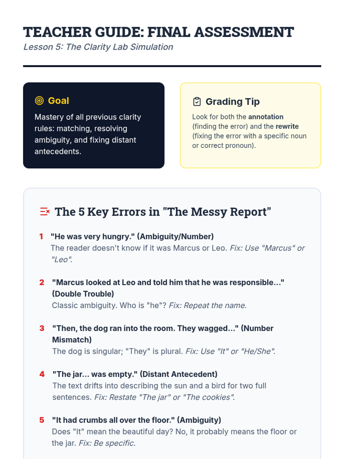 This workshop-style sequence focuses on the logical relationship between pronouns and their antecedents to ensure clarity in writing. Students move from simple identification to solving complex ambiguity and distant antecedent problems, culminating in a professional editing simulation.