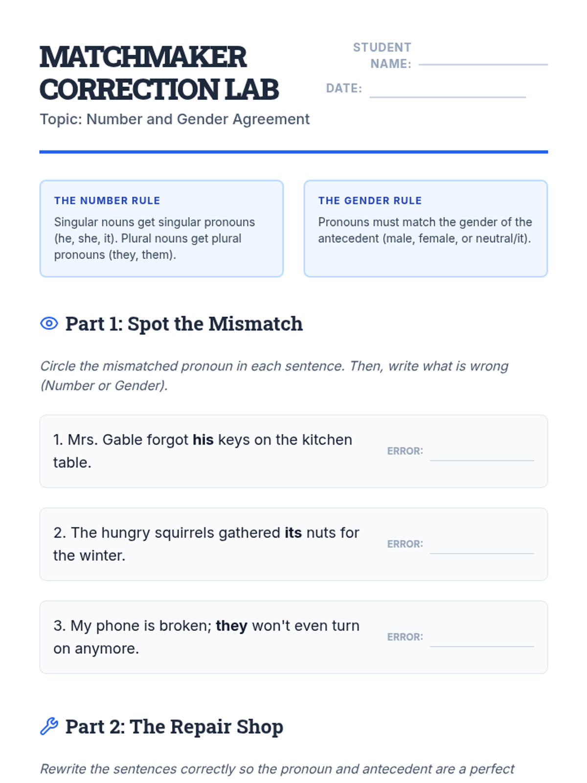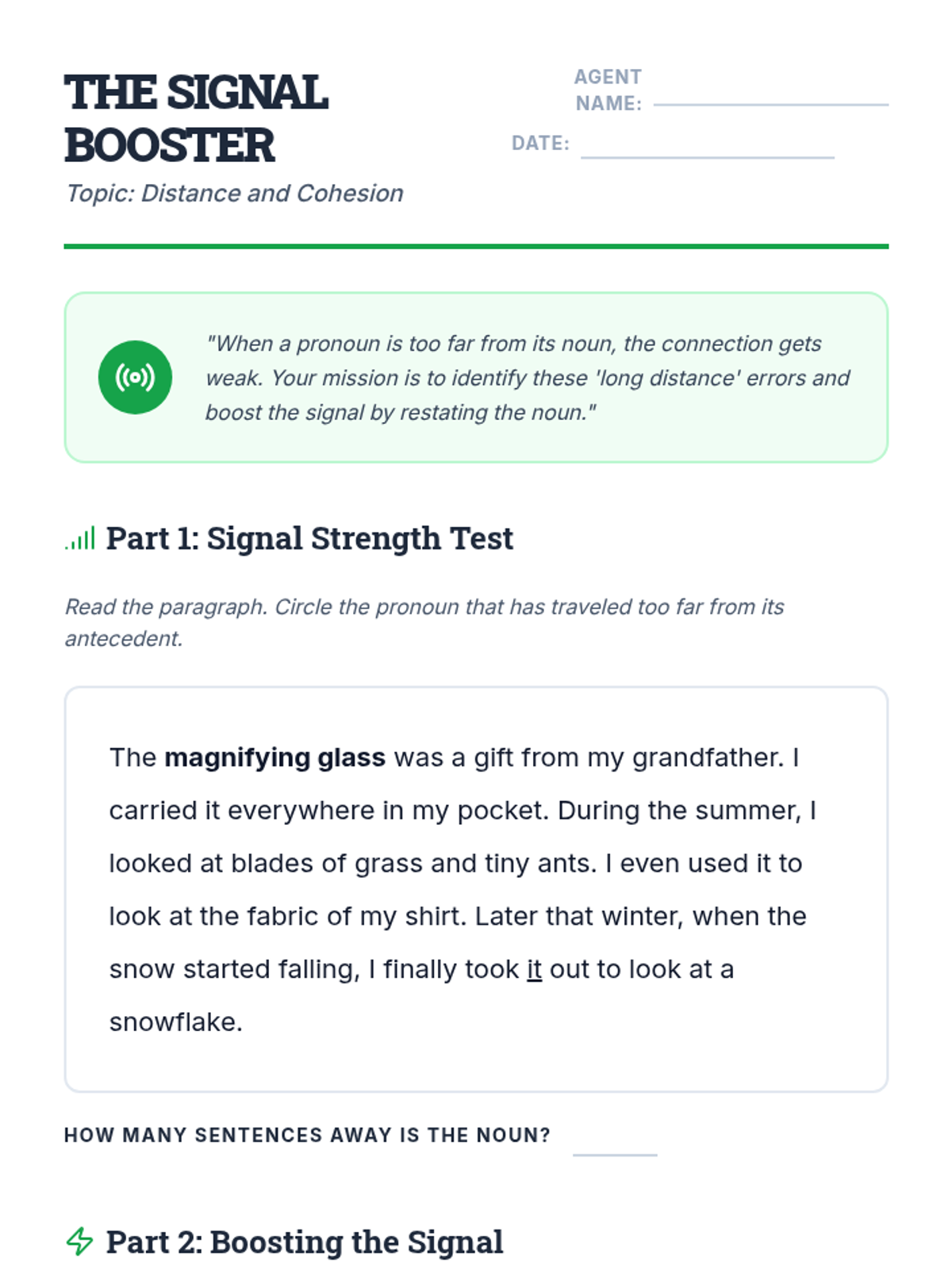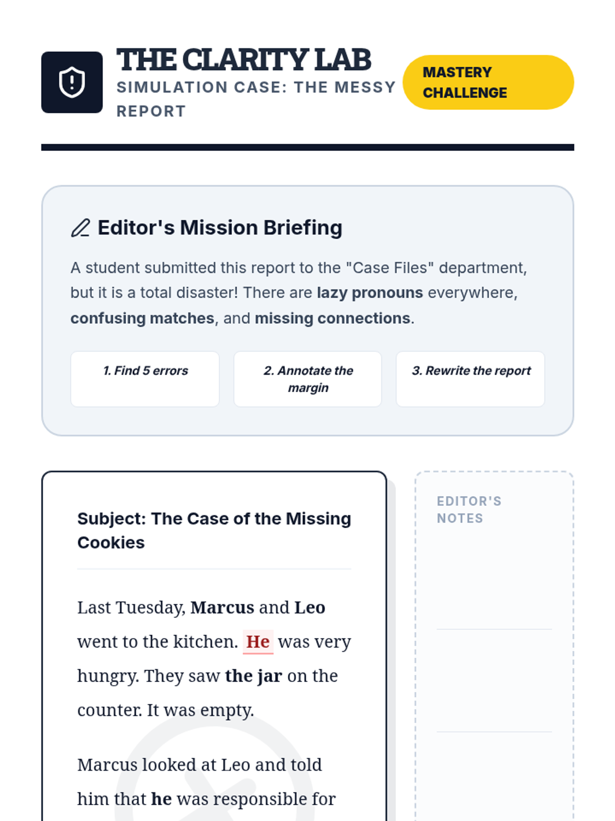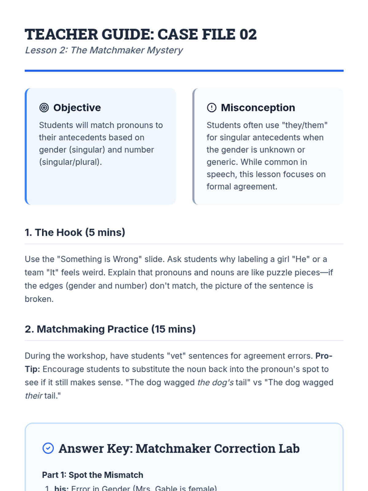 This workshop-style sequence focuses on the logical relationship between pronouns and their antecedents to ensure clarity in writing. Students move from simple identification to solving complex ambiguity and distant antecedent problems, culminating in a professional editing simulation.