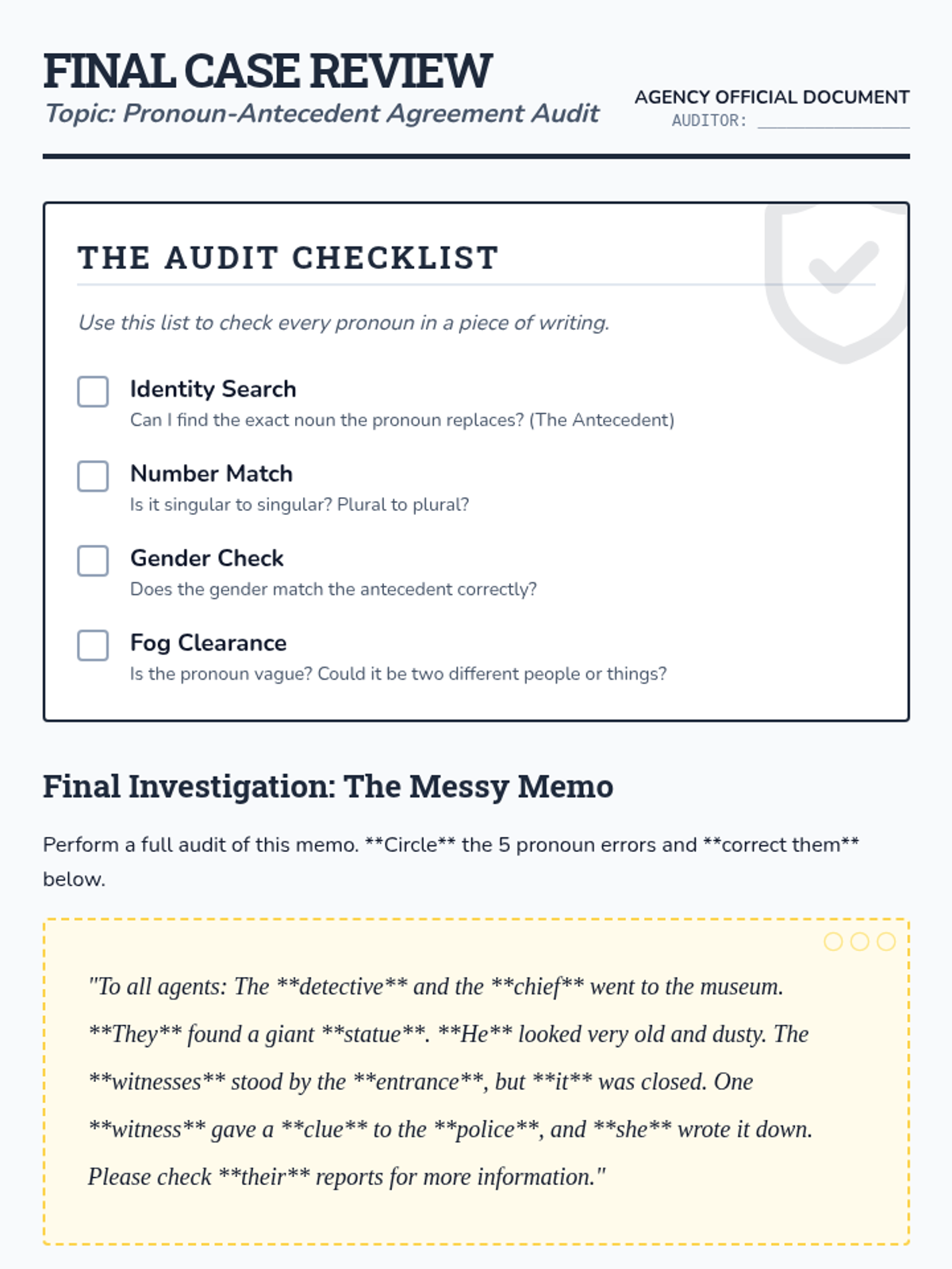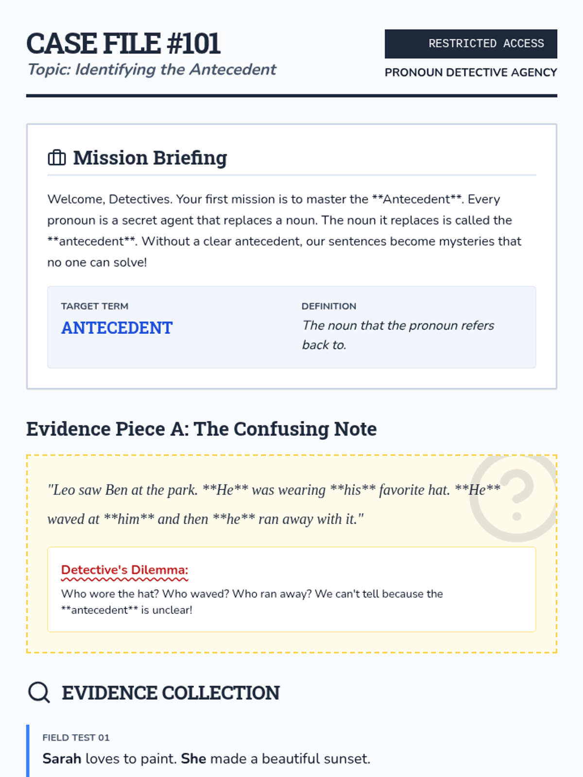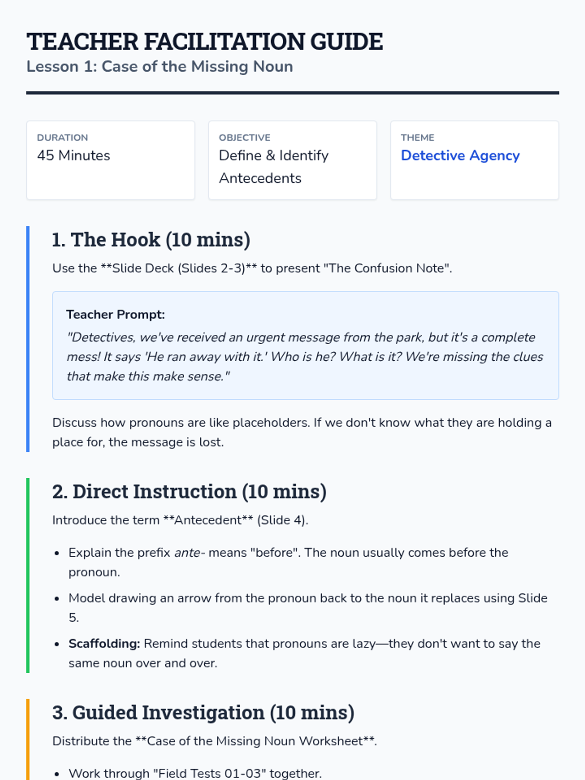 A 5-lesson inquiry-based unit where 3rd-grade students act as 'Grammar Detectives' to investigate the relationship between pronouns and their antecedents, ensuring clarity and precision in writing.