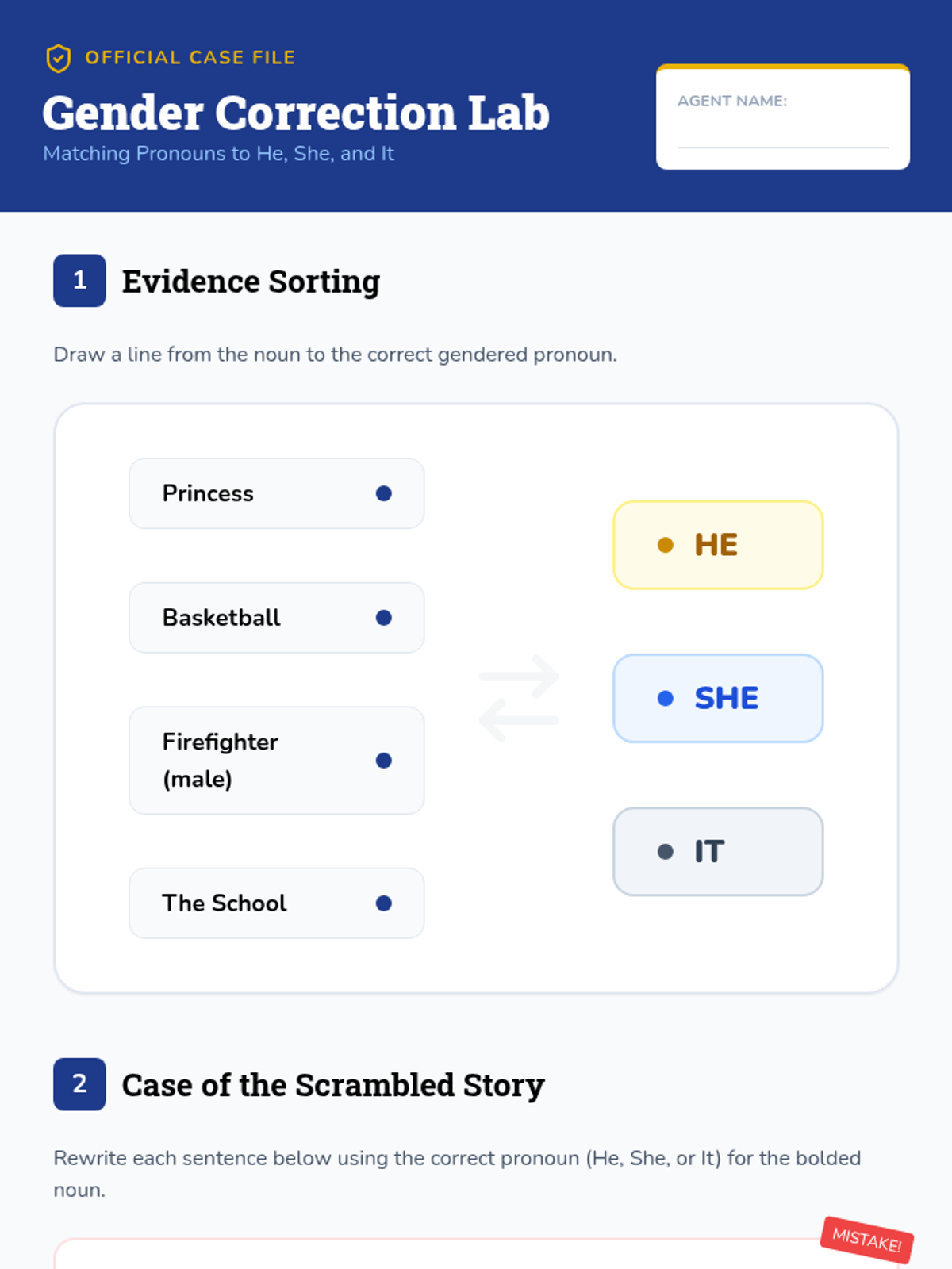 A detective-themed sequence for 2nd graders to master pronoun-antecedent agreement. Students learn to match number and gender, identify missing antecedents, and ensure clarity in writing through proofreading.