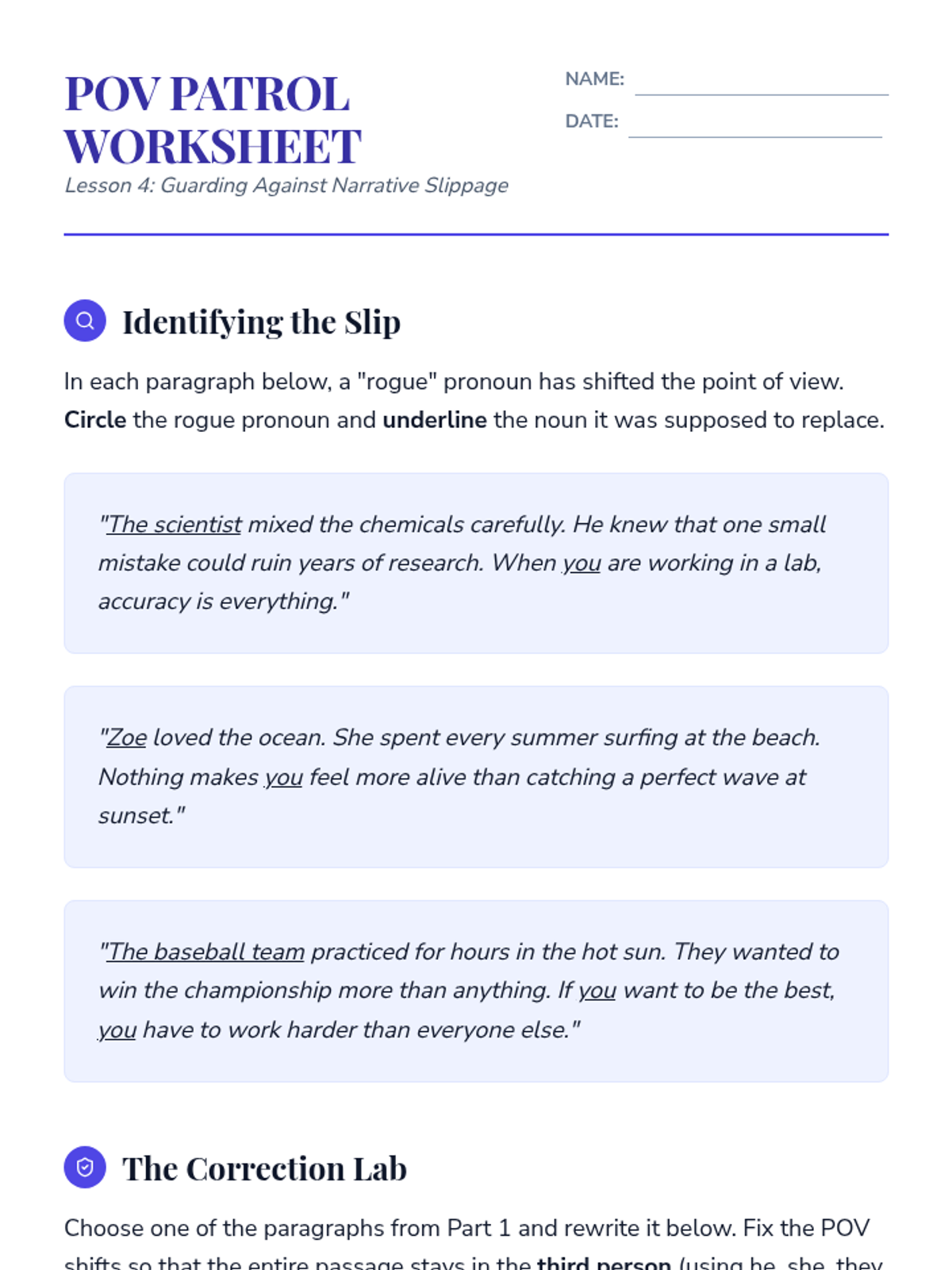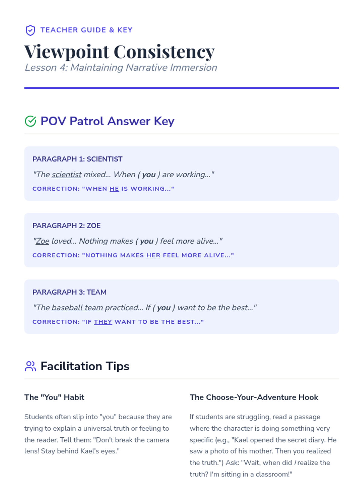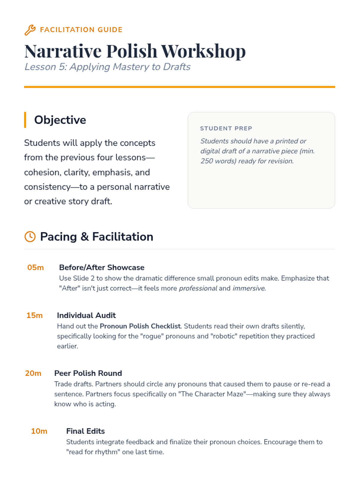 A 5-lesson sequence for 7th-grade students focusing on the strategic use of pronouns to enhance narrative flow, clarify dialogue, and maintain consistency in point of view. Students move from basic mechanics to sophisticated narrative application.