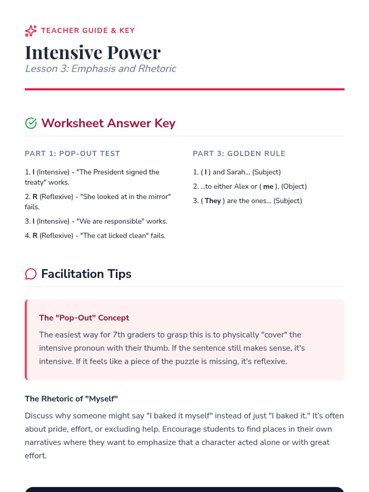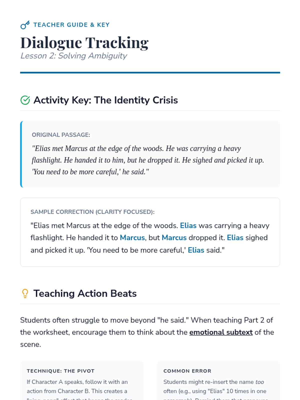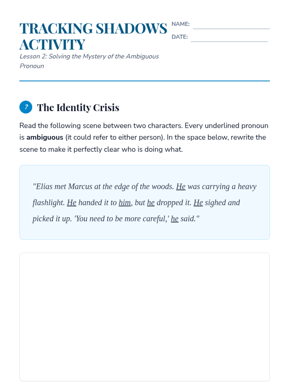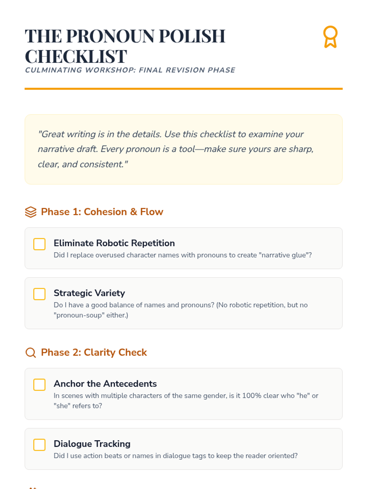 A 5-lesson sequence for 7th-grade students focusing on the strategic use of pronouns to enhance narrative flow, clarify dialogue, and maintain consistency in point of view. Students move from basic mechanics to sophisticated narrative application.