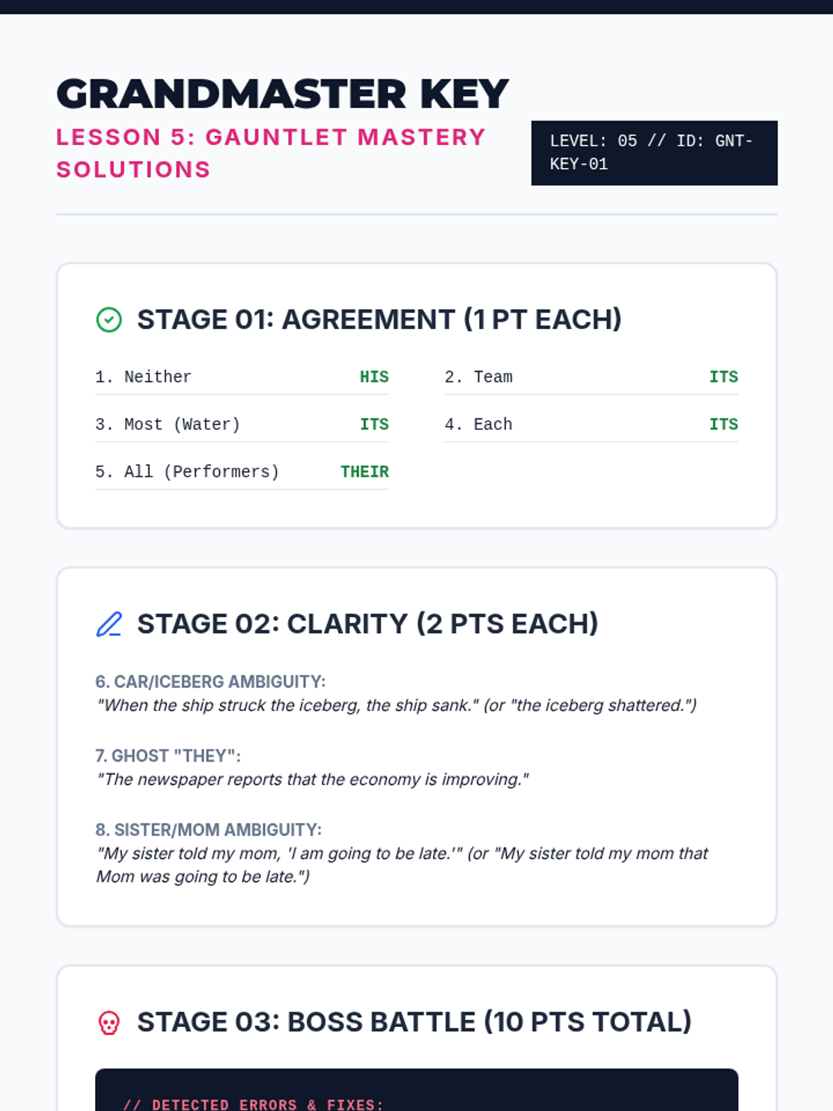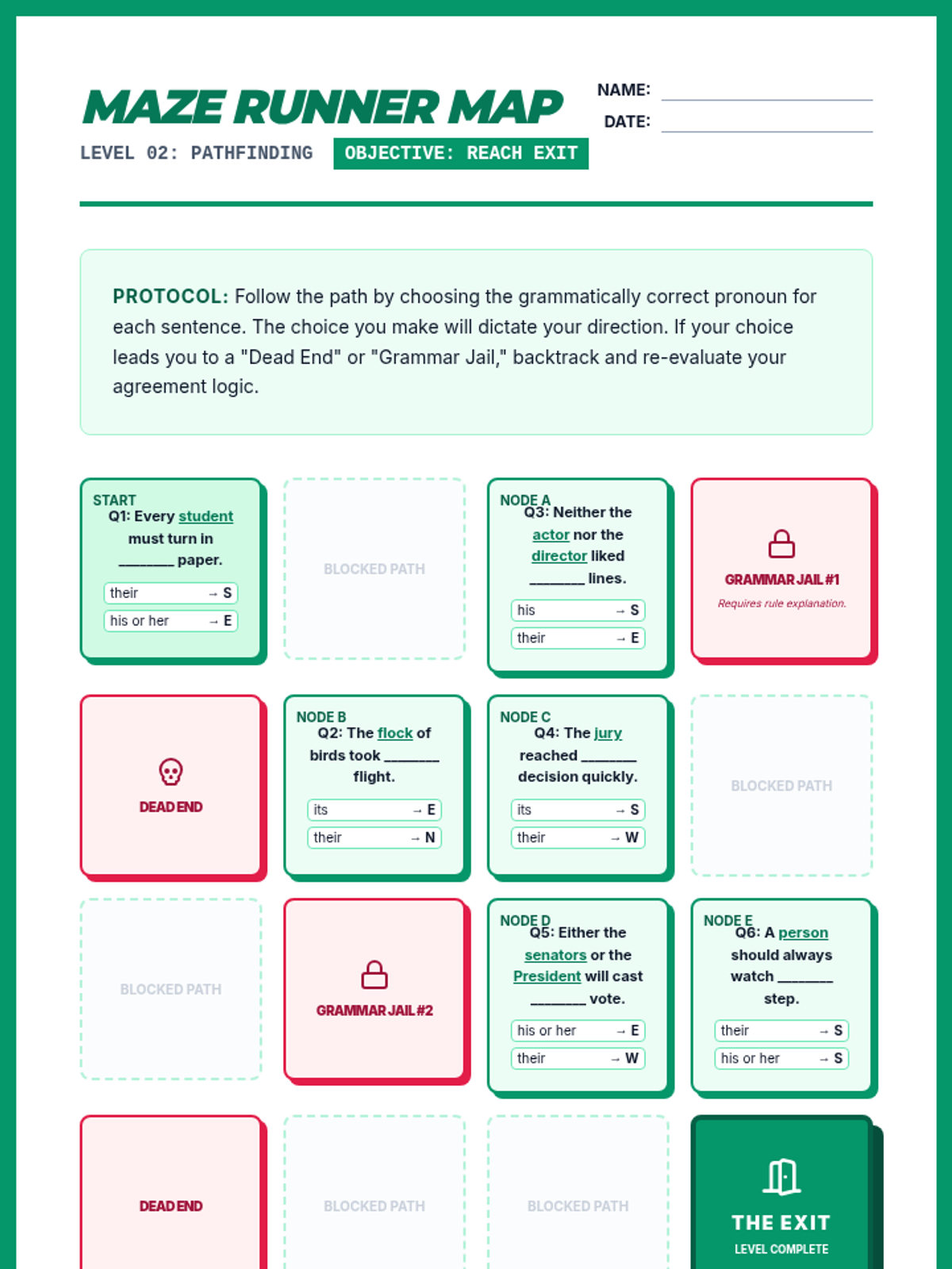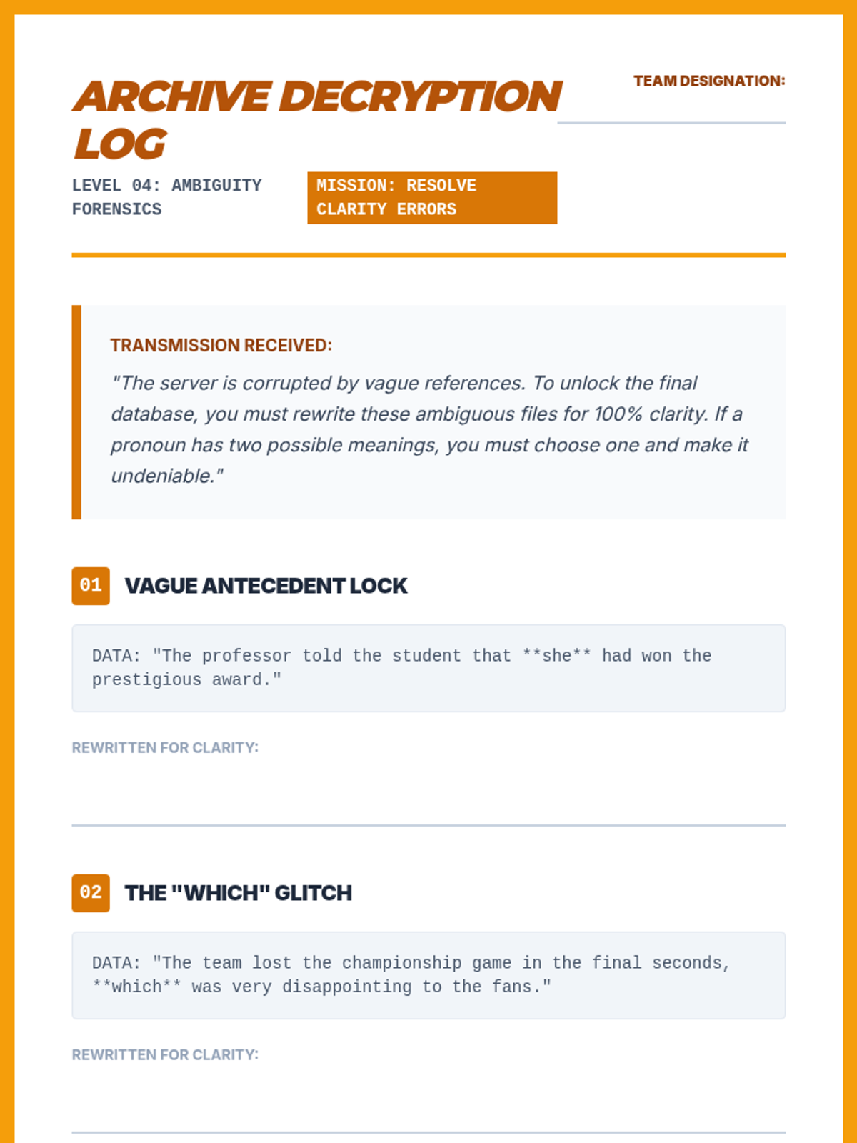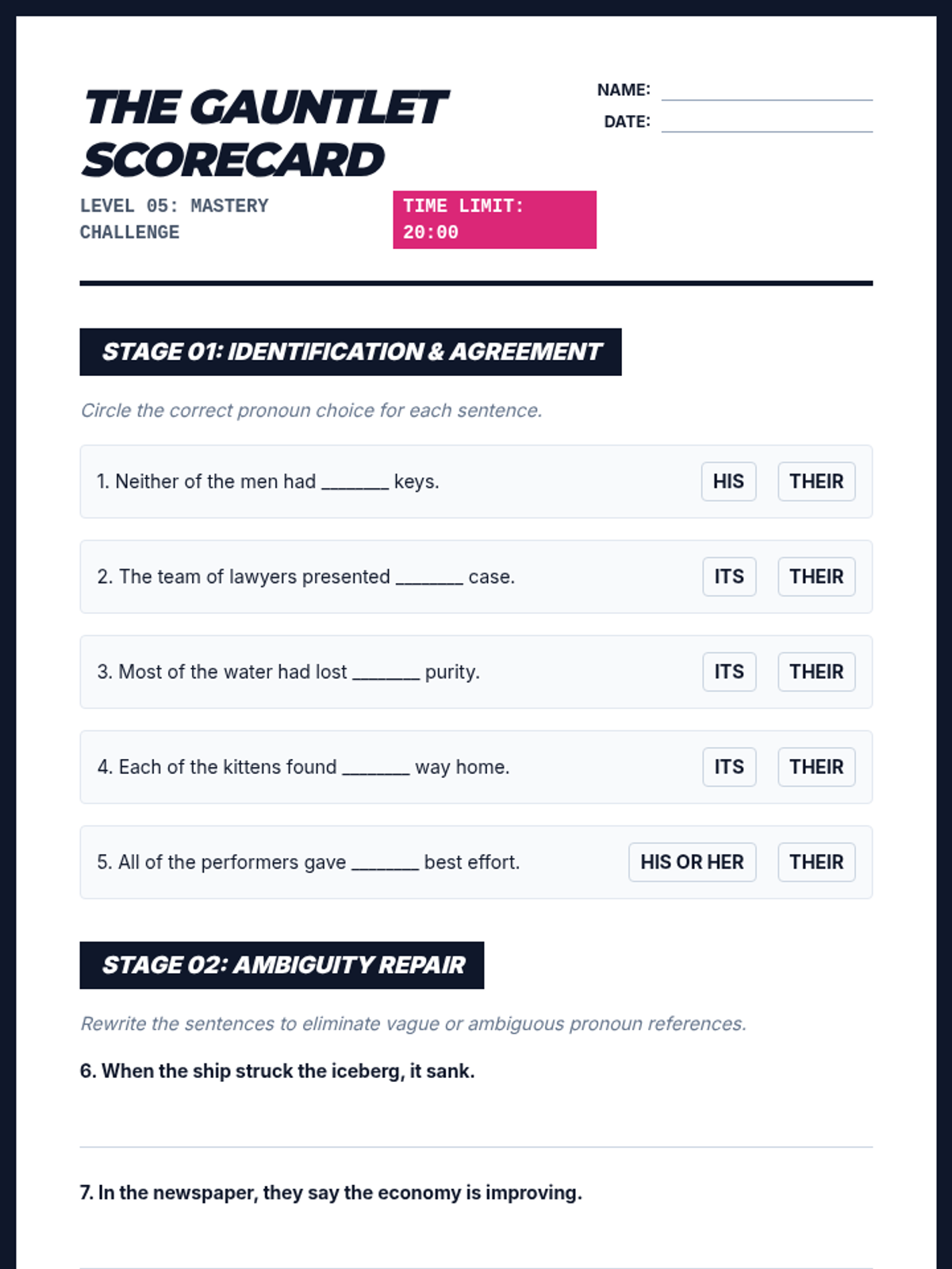 This gamified sequence for 11th-grade students focuses on mastering pronouns and antecedents through high-energy, interactive challenges. Students will move from rapid identification to solving complex agreement mazes, playing strategy games with indefinite pronouns, and escaping the 'Ambiguous Archives' by clarifying vague references.