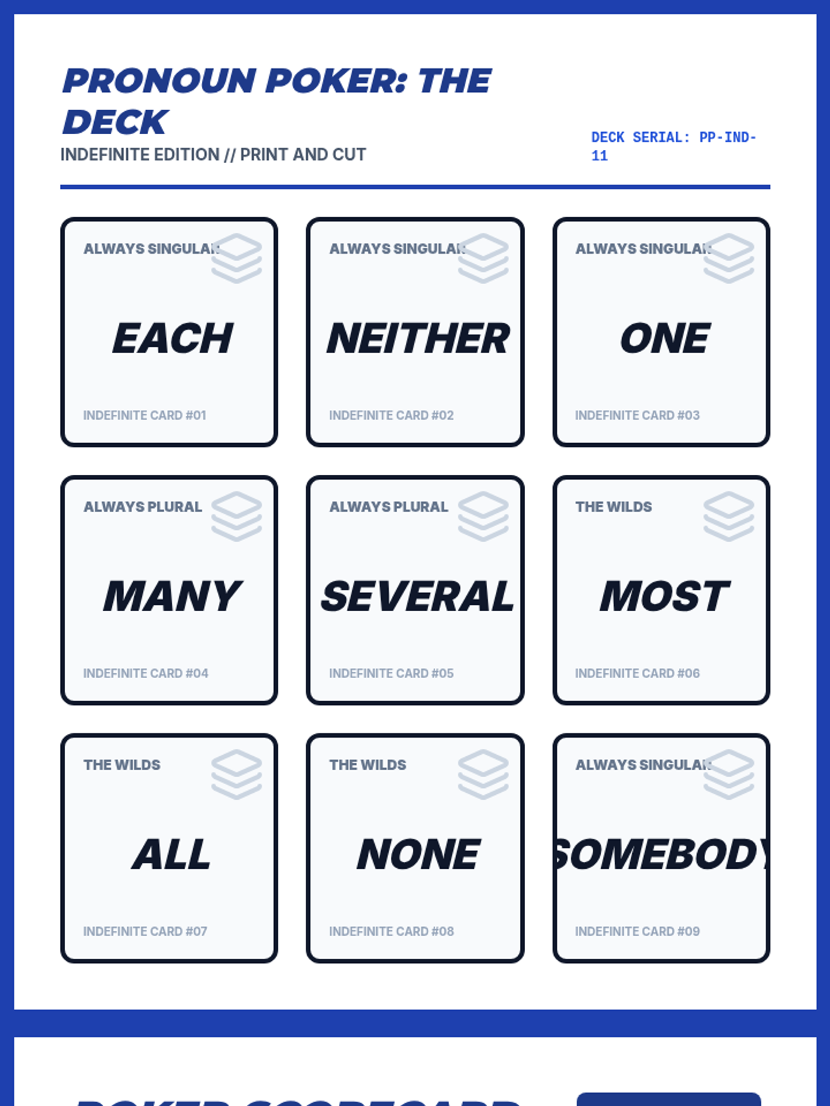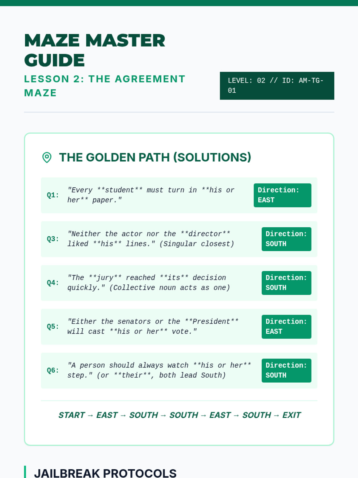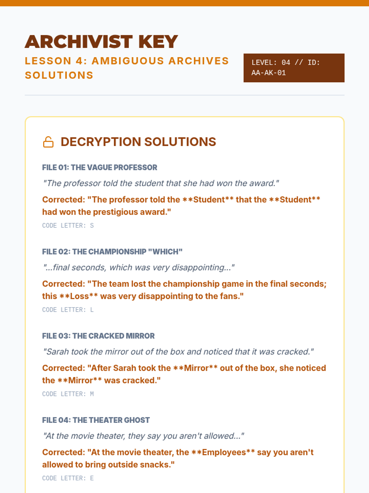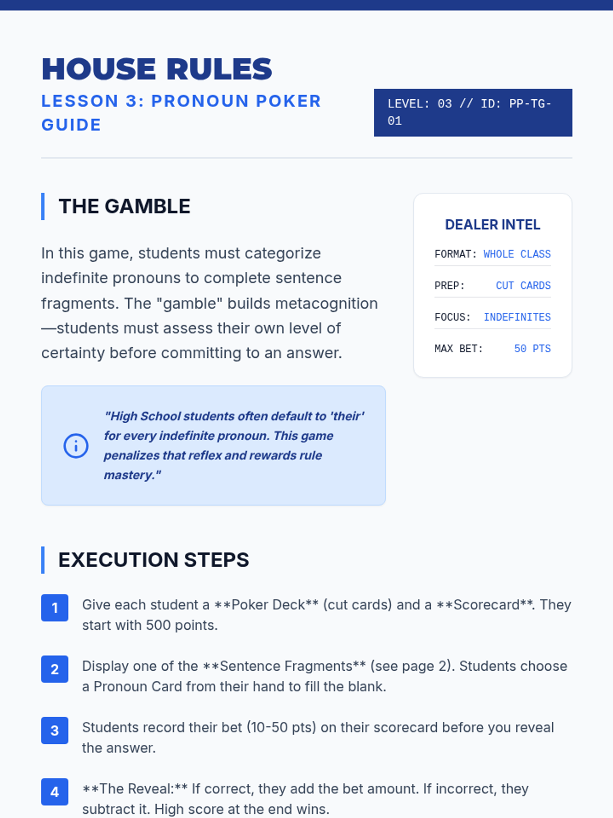 This gamified sequence for 11th-grade students focuses on mastering pronouns and antecedents through high-energy, interactive challenges. Students will move from rapid identification to solving complex agreement mazes, playing strategy games with indefinite pronouns, and escaping the 'Ambiguous Archives' by clarifying vague references.