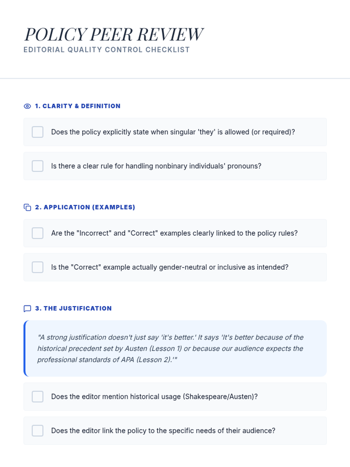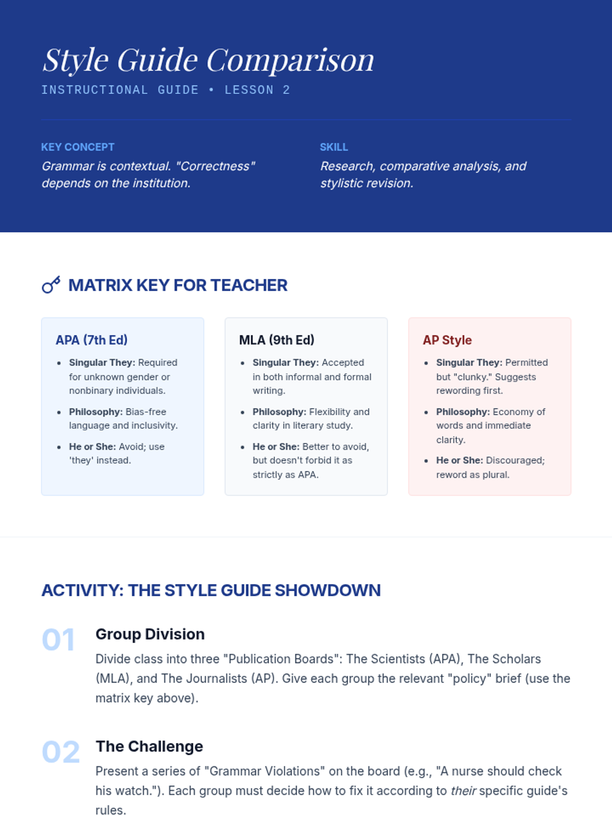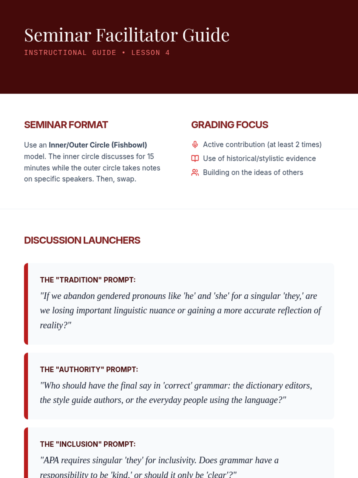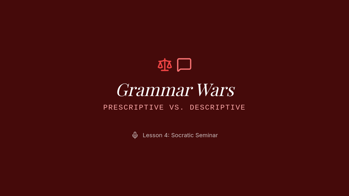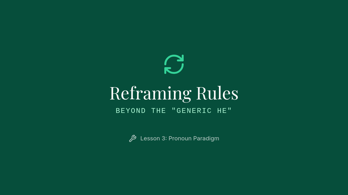 This sequence explores the evolution of pronouns and antecedents, specifically focusing on the singular 'they' and gender-neutral language. Students analyze historical usage, compare modern style guides, and debate the tension between prescriptive and descriptive grammar.