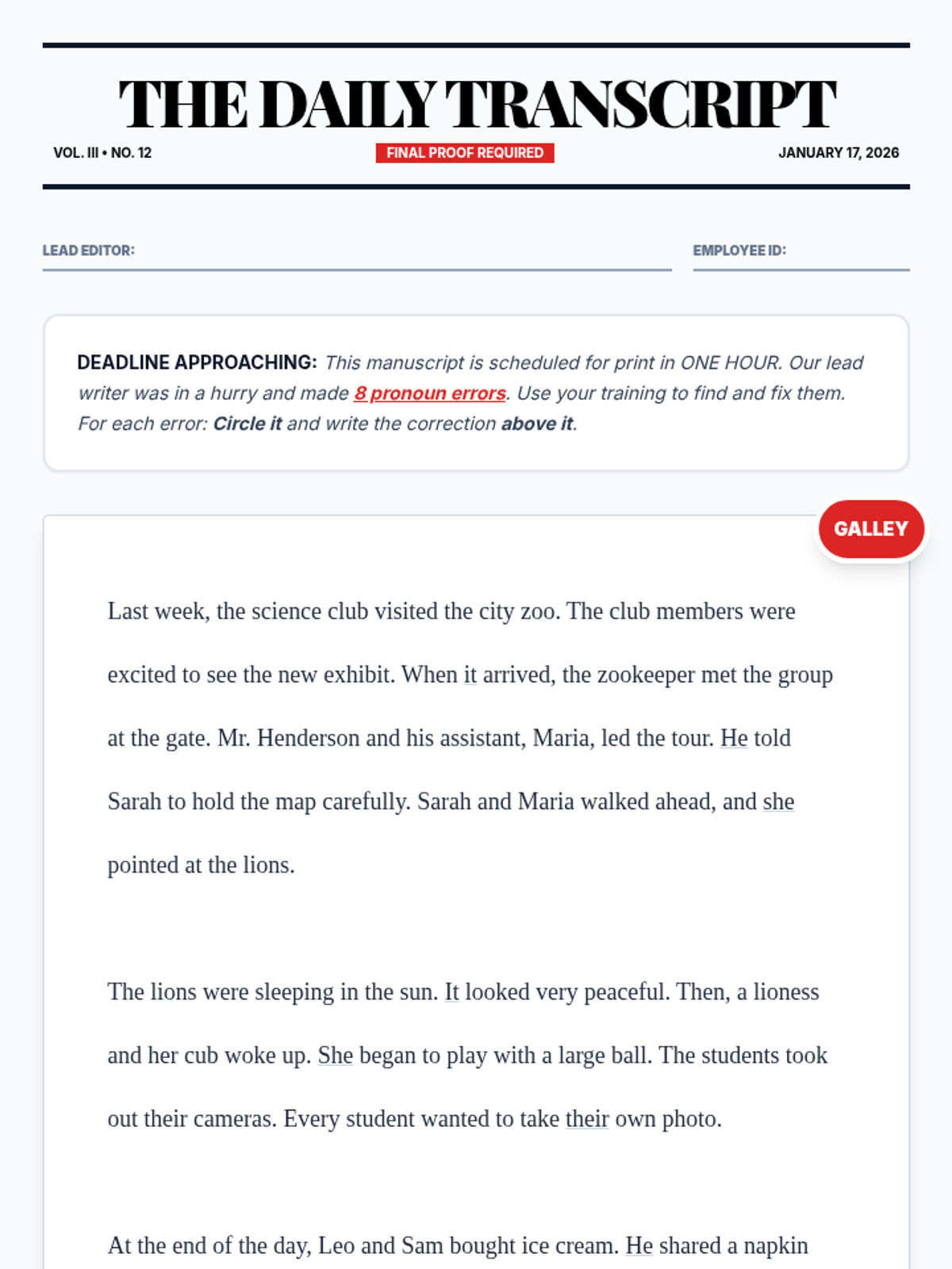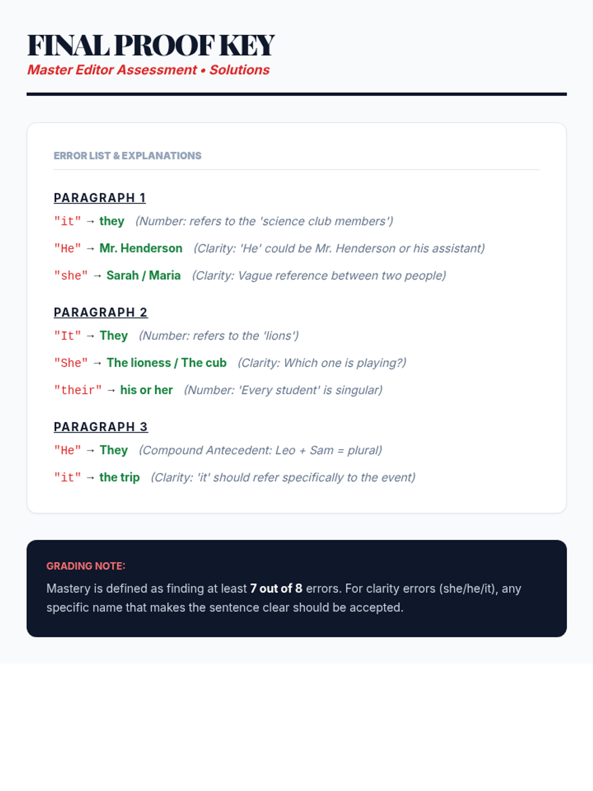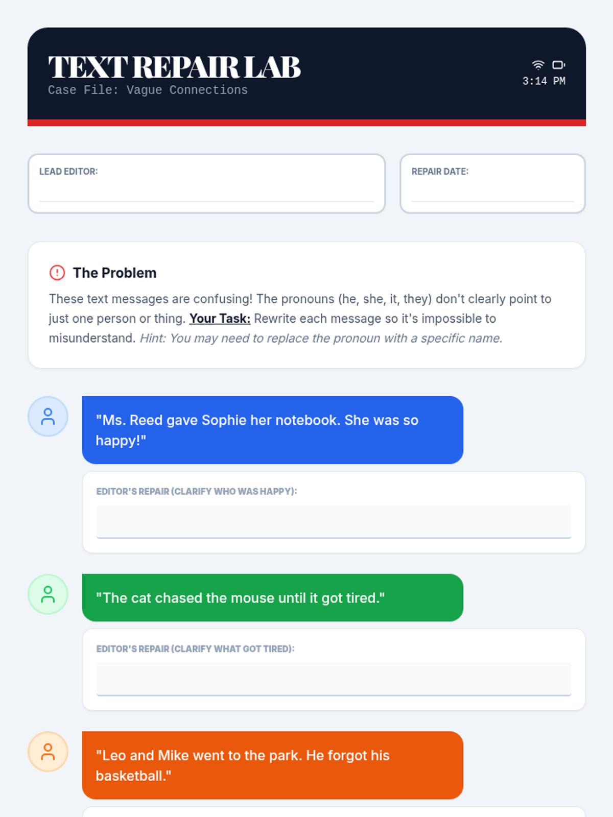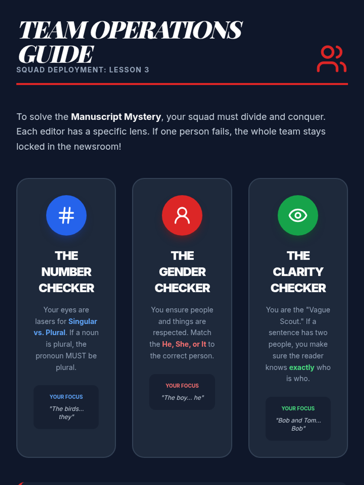 A 3rd-grade ELA sequence where students take on the role of professional editors to master pronoun-antecedent agreement. Through simulations and collaborative challenges, students learn to identify and correct errors in number, gender, and clarity.