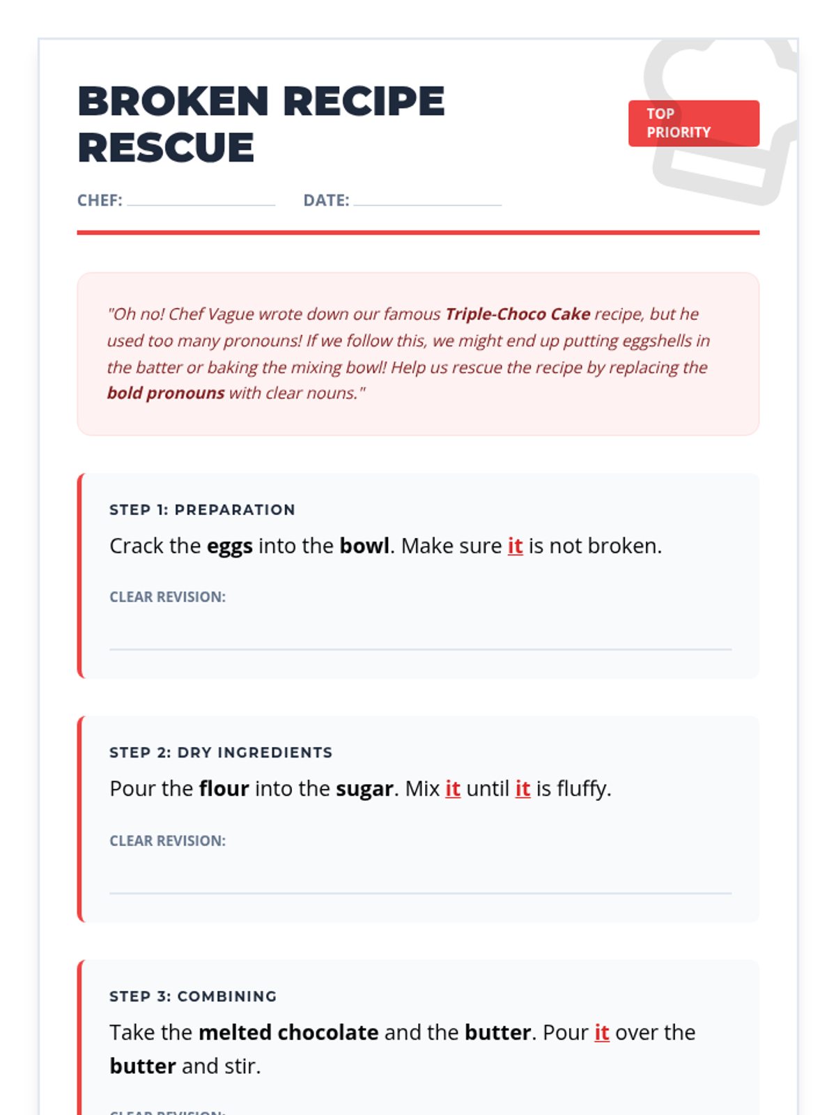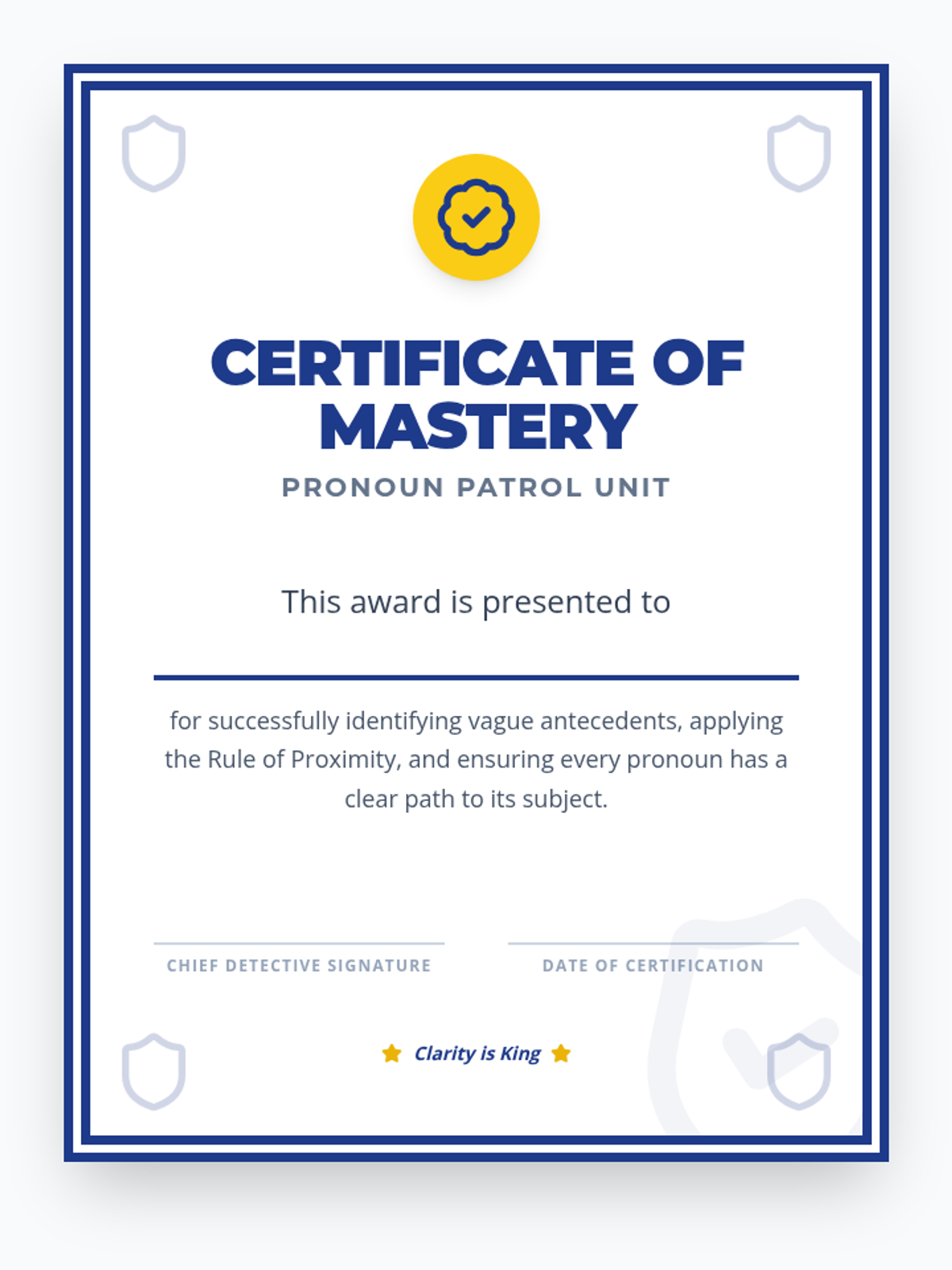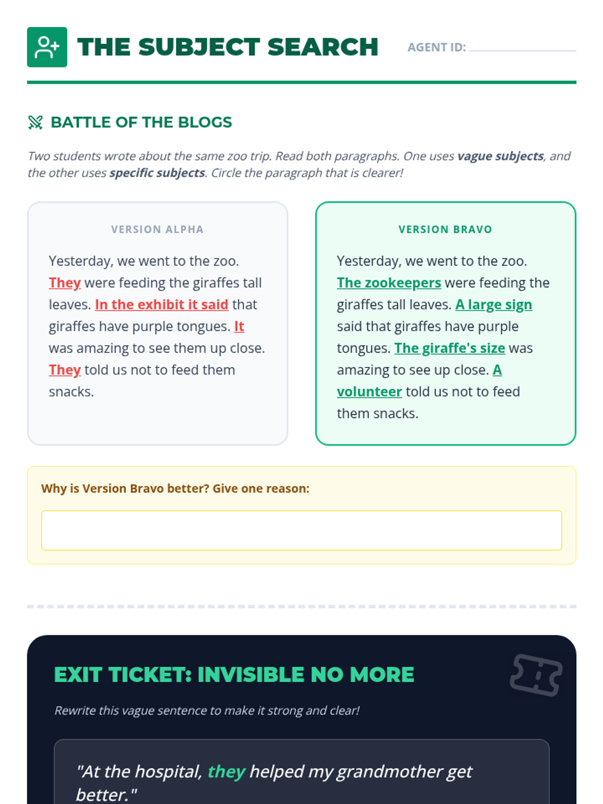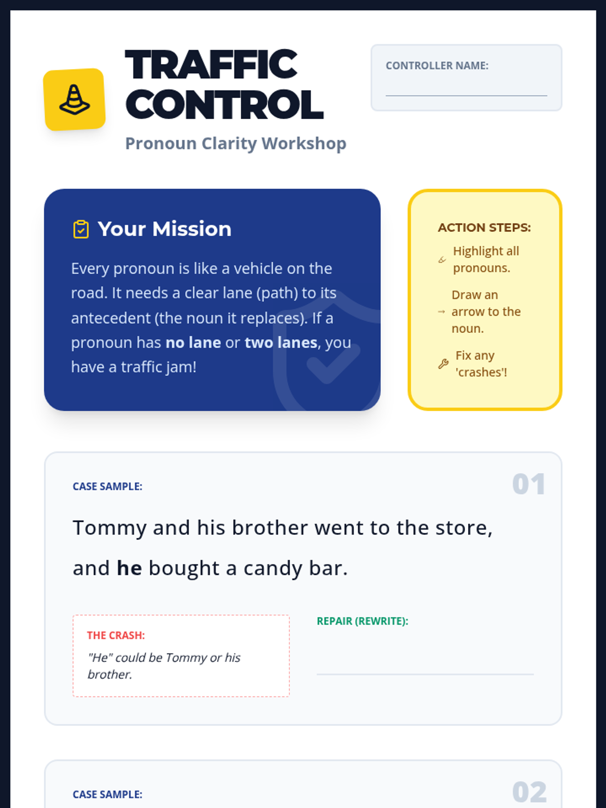 A 5-lesson grammar sequence for 3rd grade focusing on pronoun clarity. Students learn to identify and fix vague or ambiguous pronoun references through a fun 'Pronoun Patrol' detective theme.