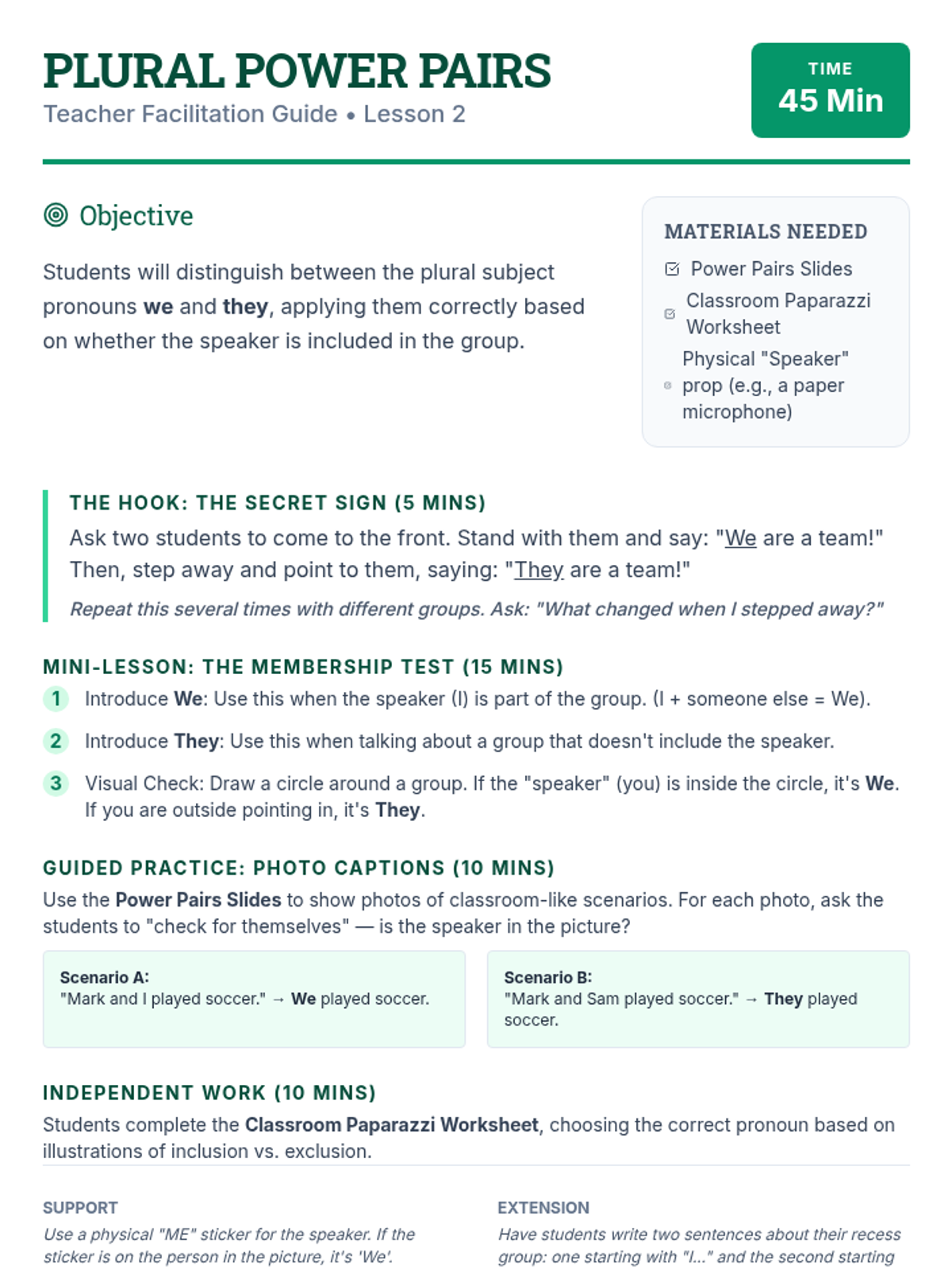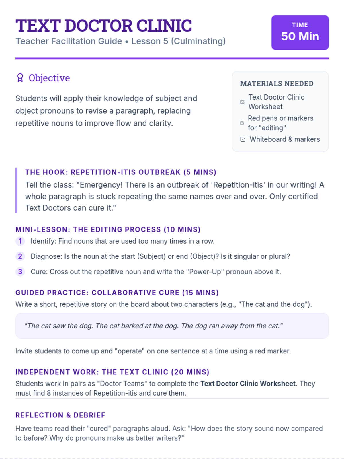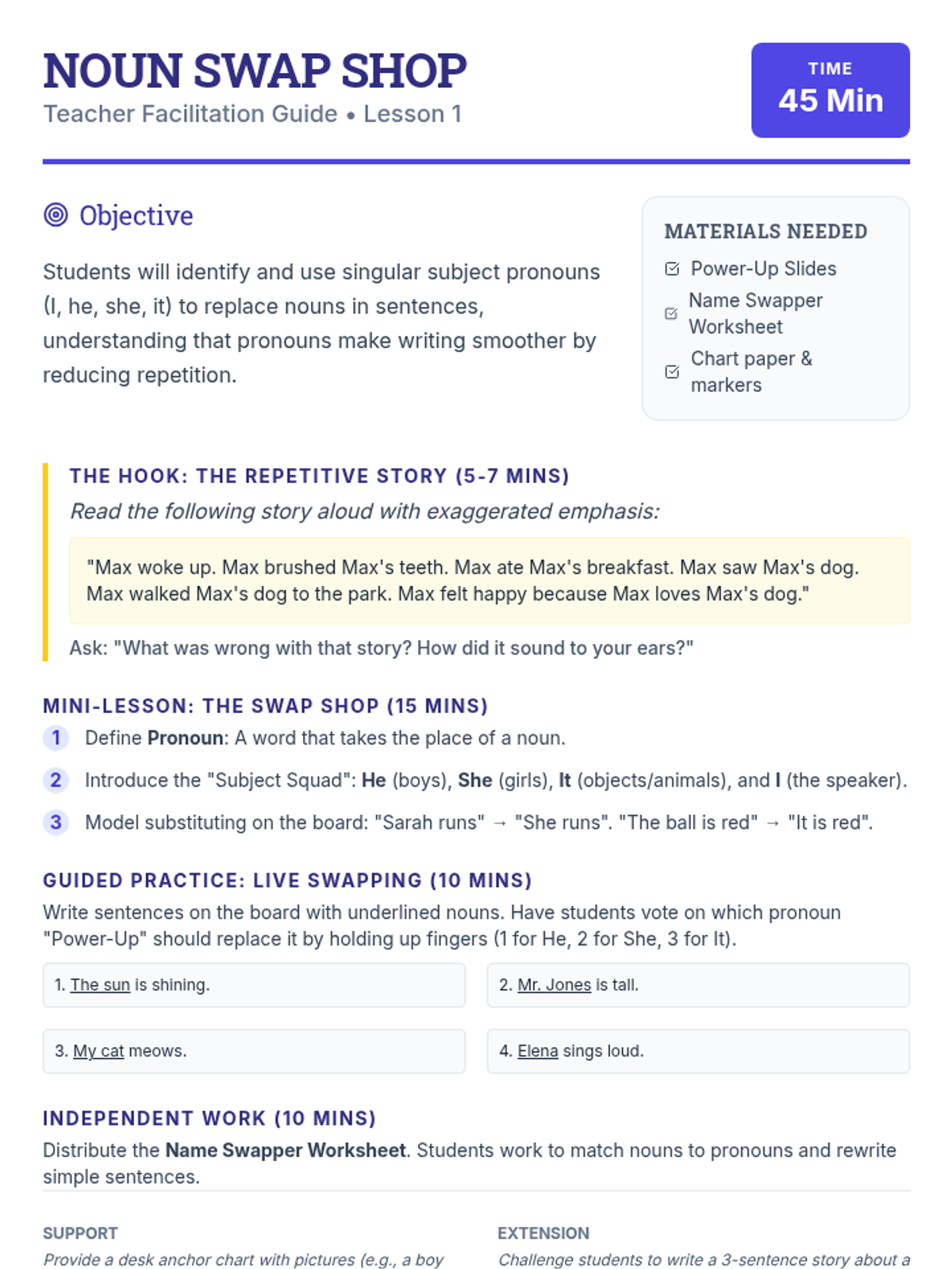 This sequence introduces 2nd-grade students to personal pronouns as tools for replacing nouns to avoid repetition. Through a workshop approach, students learn to distinguish between subject and object pronouns, moving from identification to application in sentence construction and ending with a collaborative editing project.