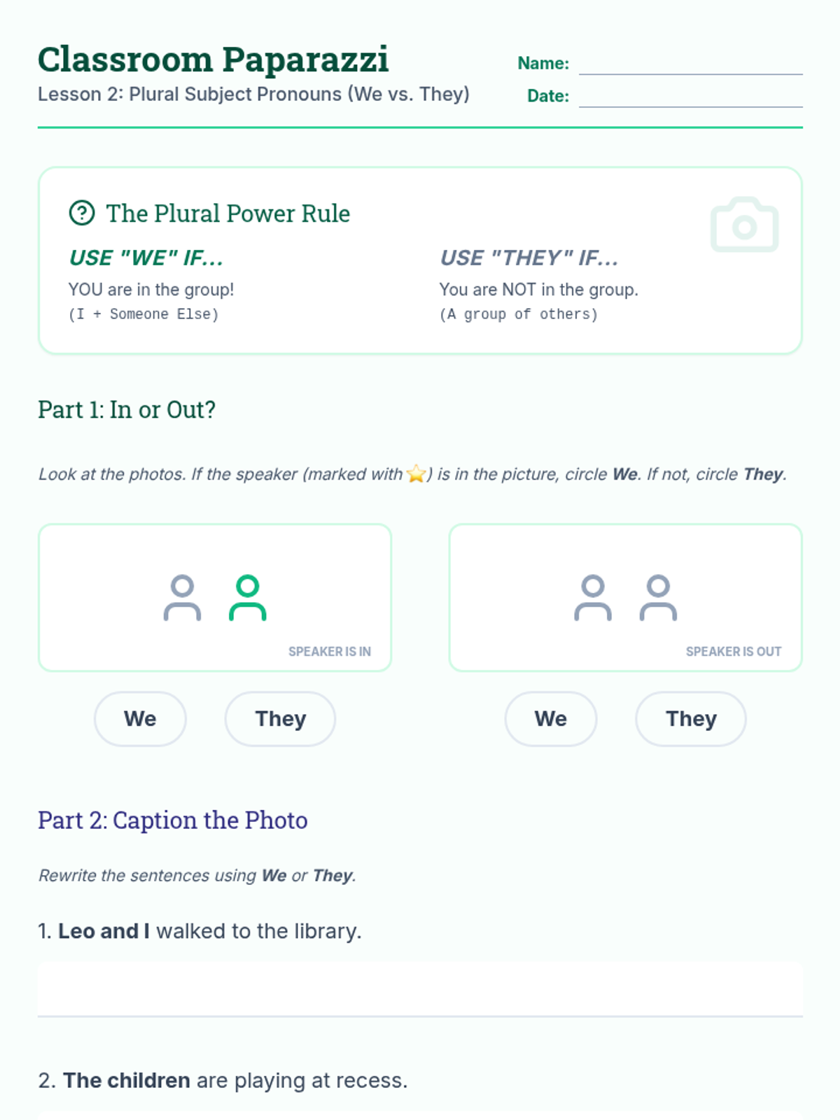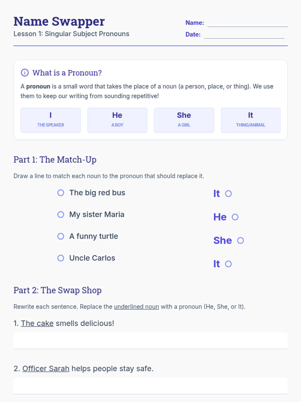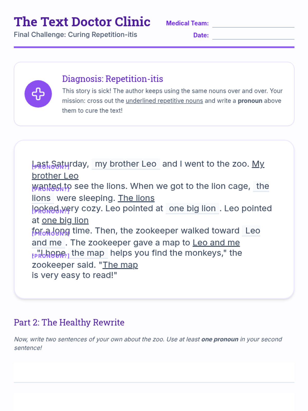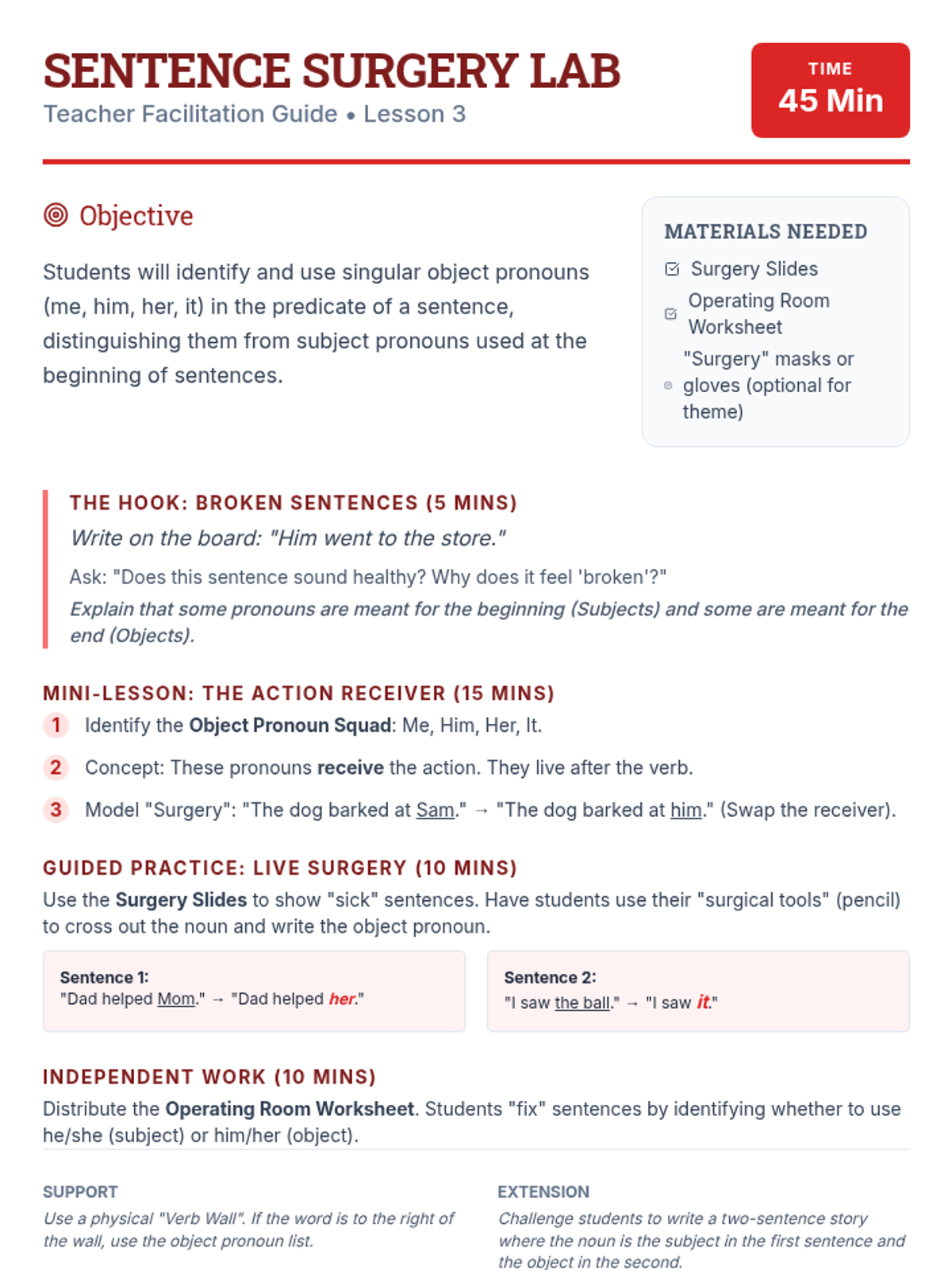 This sequence introduces 2nd-grade students to personal pronouns as tools for replacing nouns to avoid repetition. Through a workshop approach, students learn to distinguish between subject and object pronouns, moving from identification to application in sentence construction and ending with a collaborative editing project.