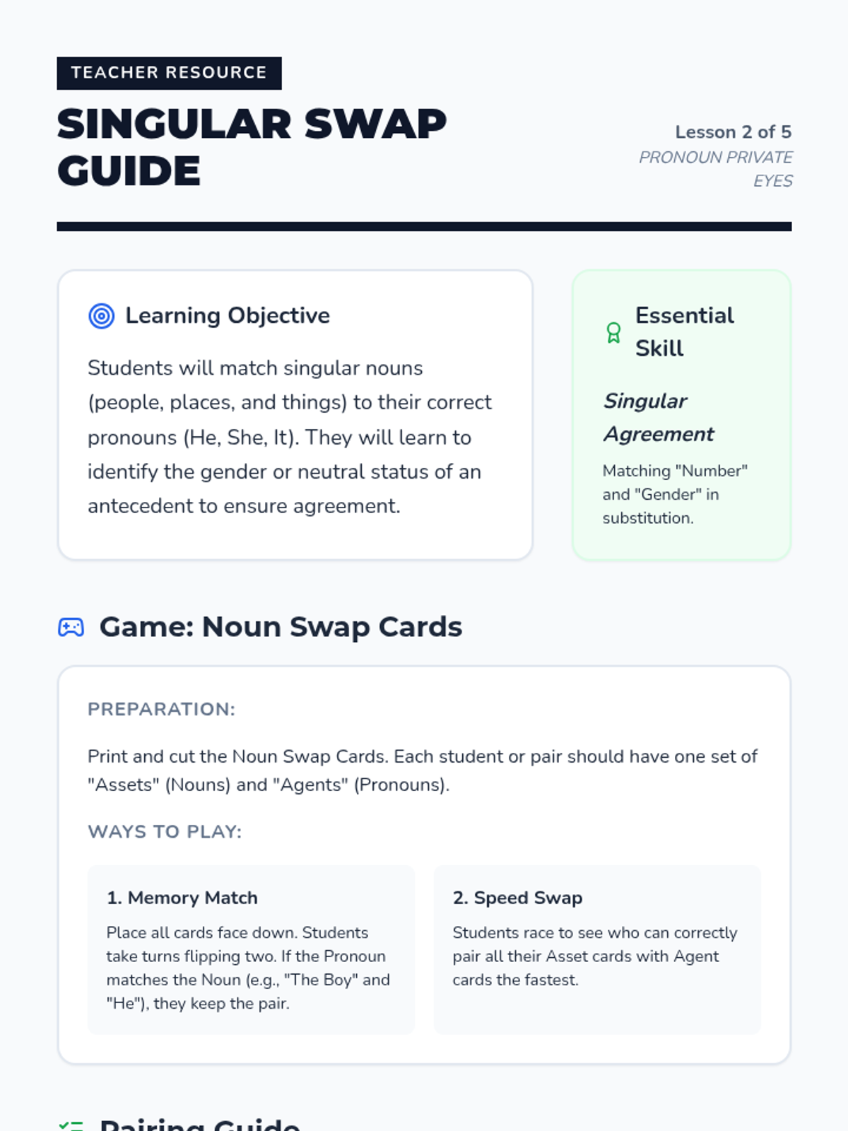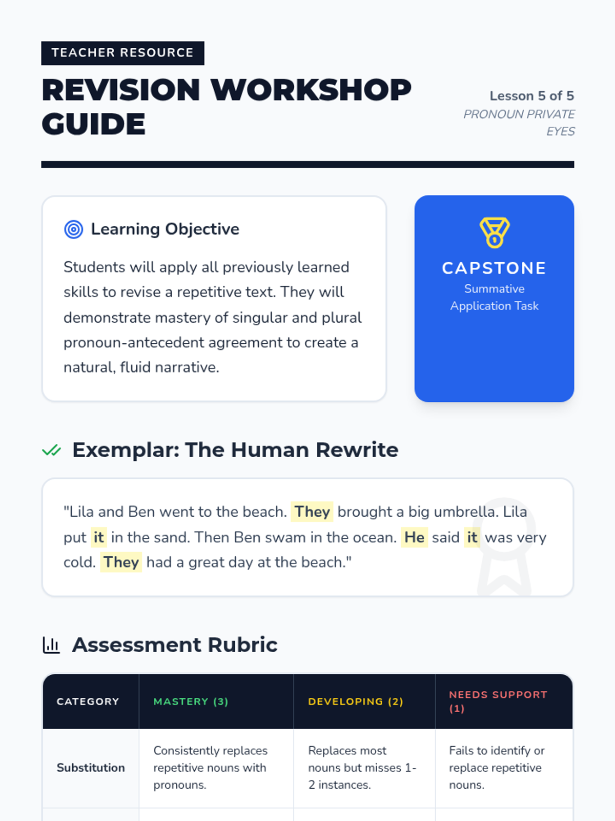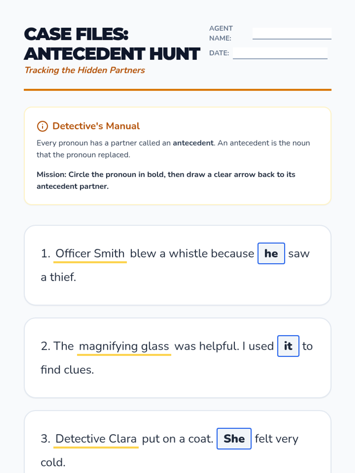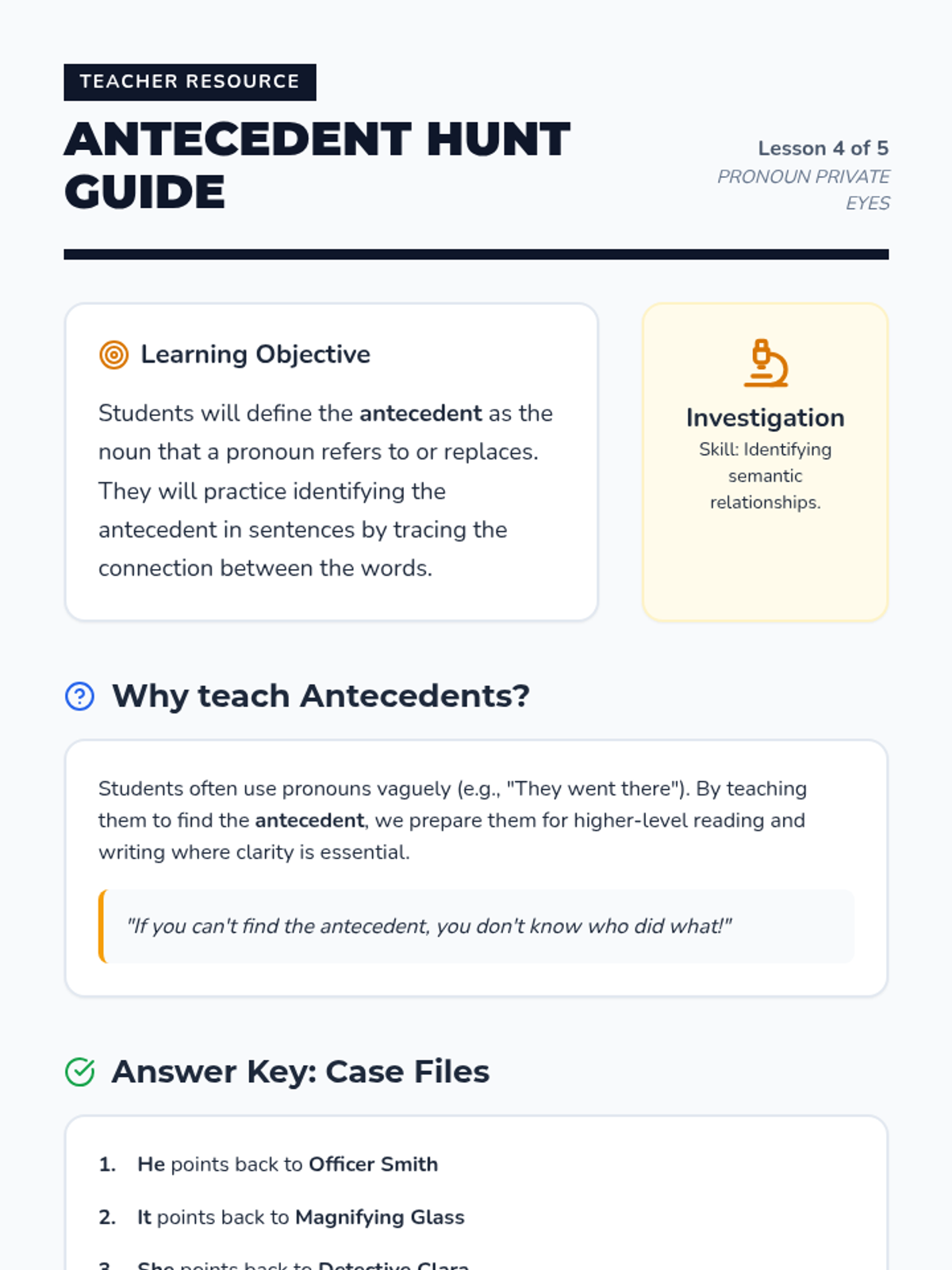 A comprehensive 3rd Grade grammar sequence focusing on pronoun-antecedent agreement. Students become 'Pronoun Private Eyes' to solve the mystery of repetitive writing, learning how pronouns act as essential substitutes for nouns to improve flow and clarity.