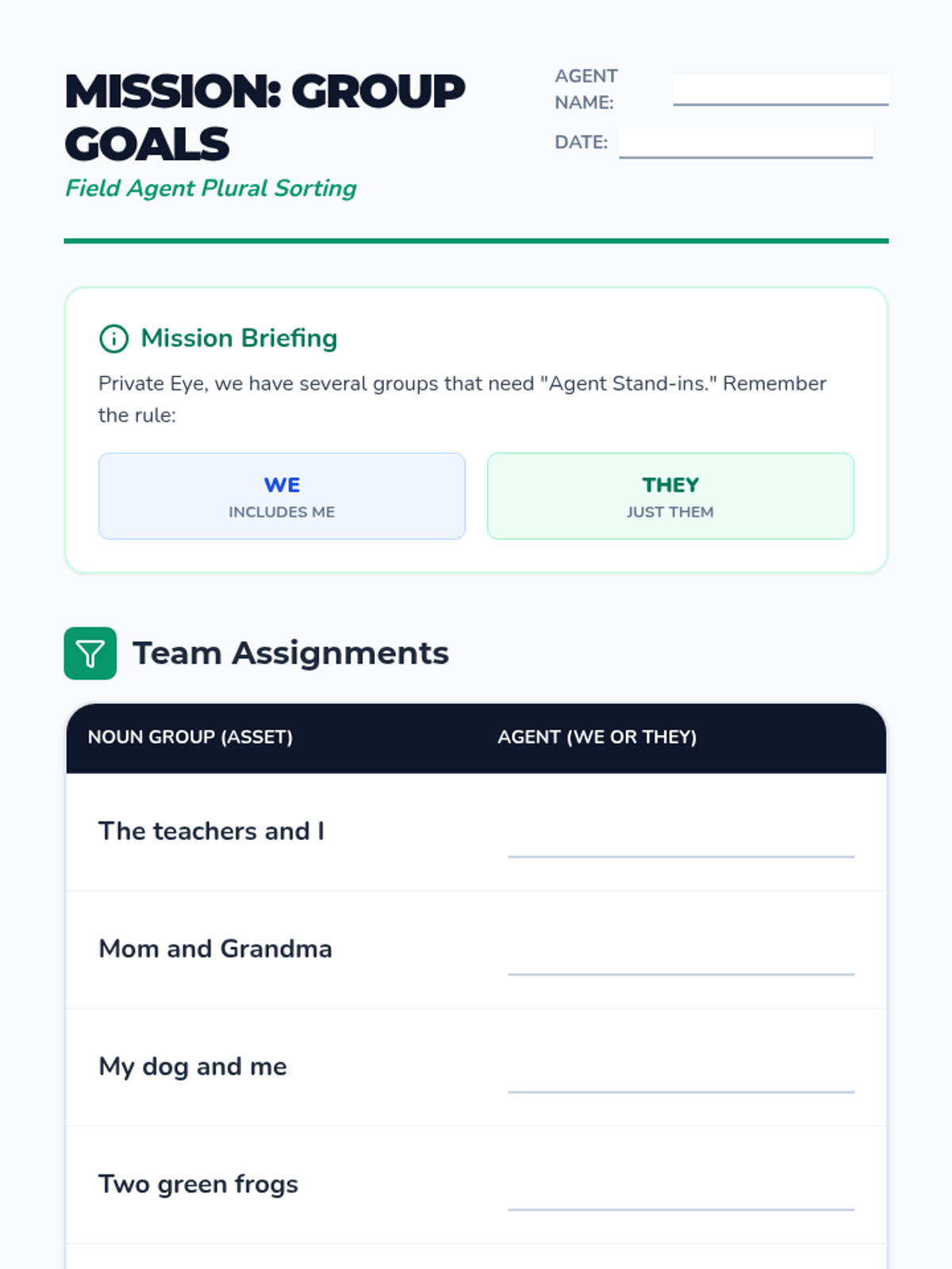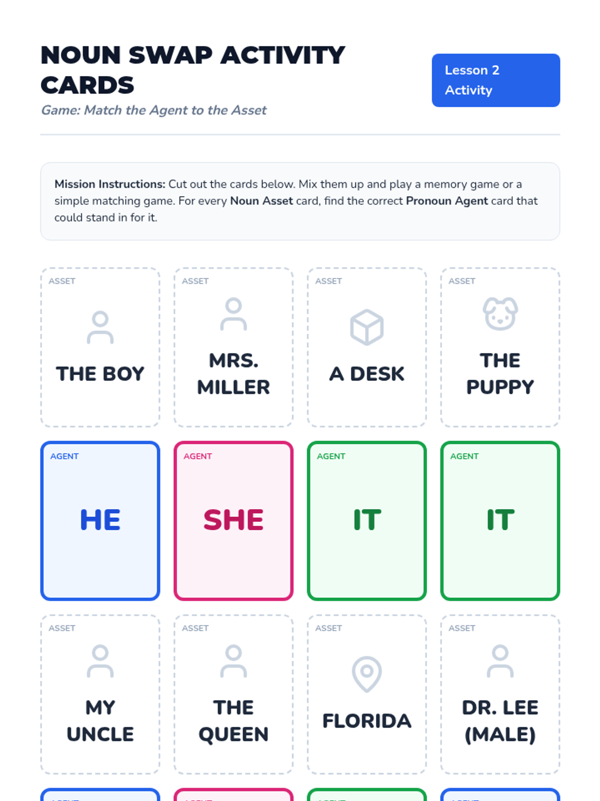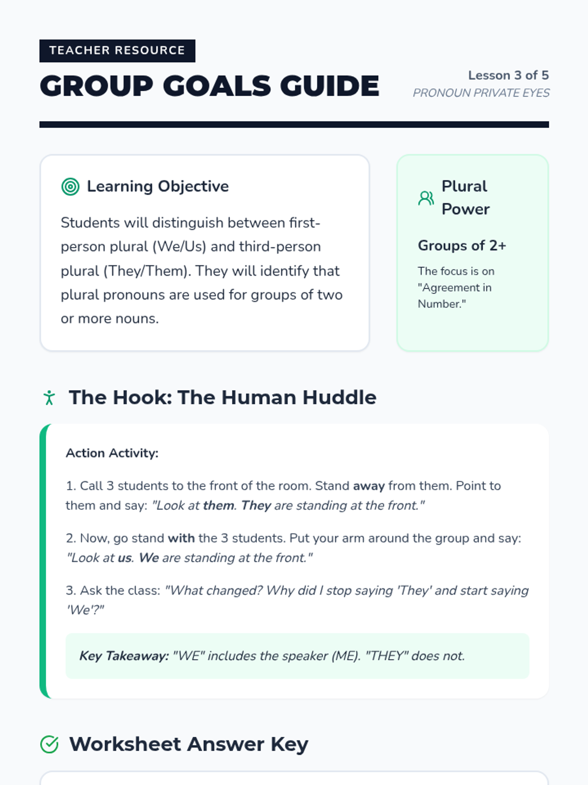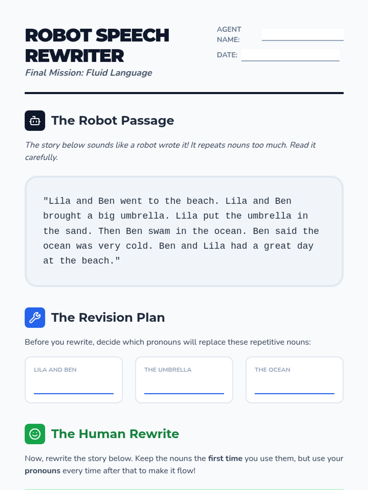 A comprehensive 3rd Grade grammar sequence focusing on pronoun-antecedent agreement. Students become 'Pronoun Private Eyes' to solve the mystery of repetitive writing, learning how pronouns act as essential substitutes for nouns to improve flow and clarity.