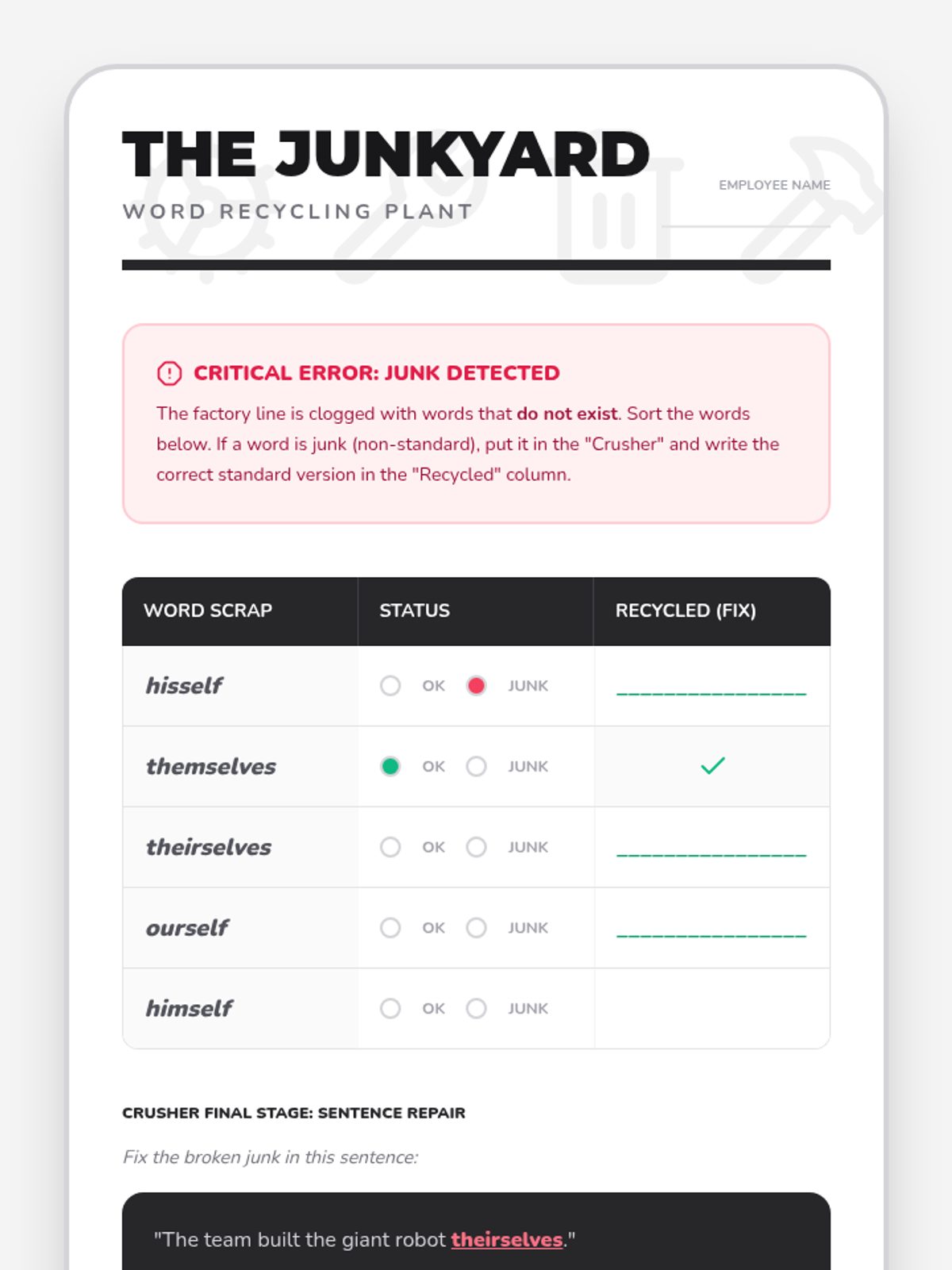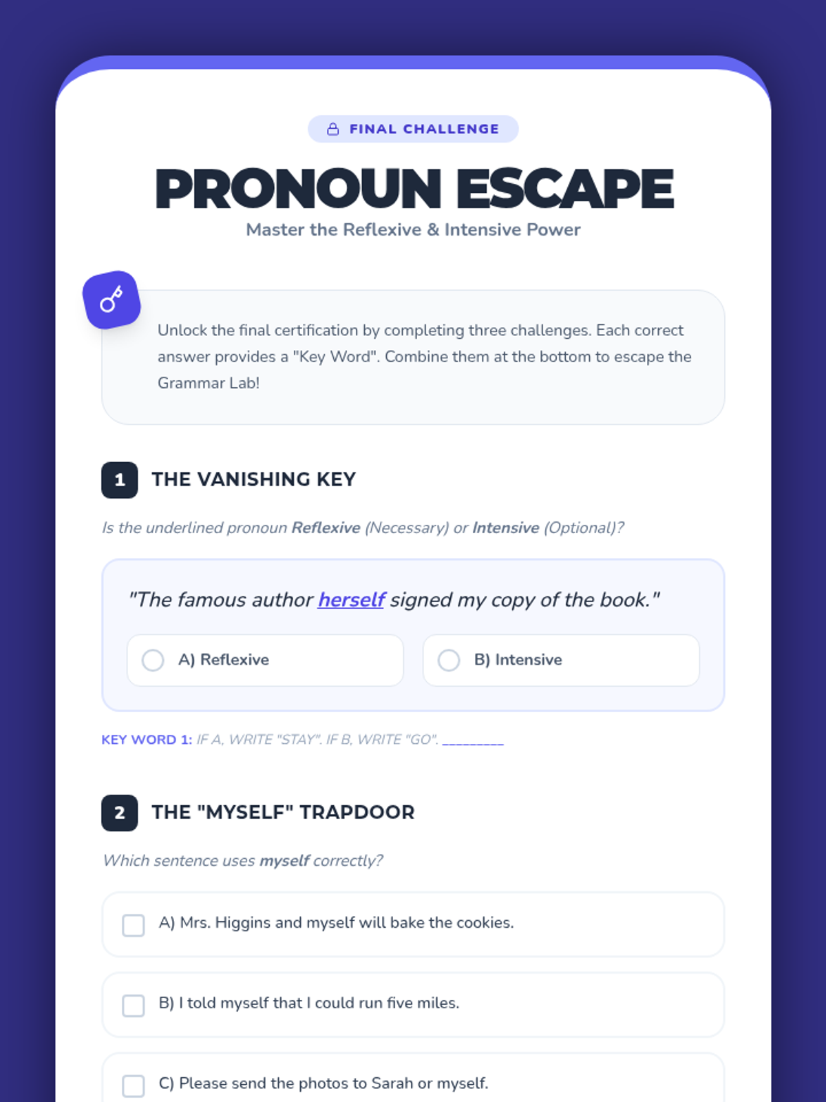 A 5th-grade grammar unit focusing on reflexive and intensive pronouns. Students explore the 'mirror effect' of reflexive pronouns, the 'power boost' of intensive pronouns, and learn to avoid common errors like 'hisself' or misusing 'myself' in compound subjects through a lab-themed investigation.
