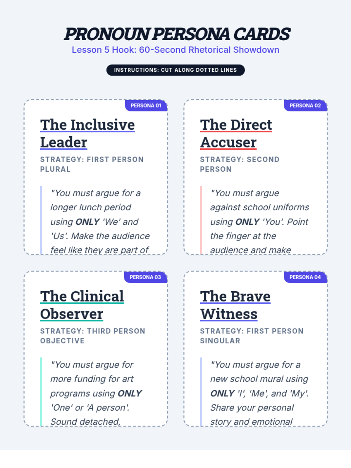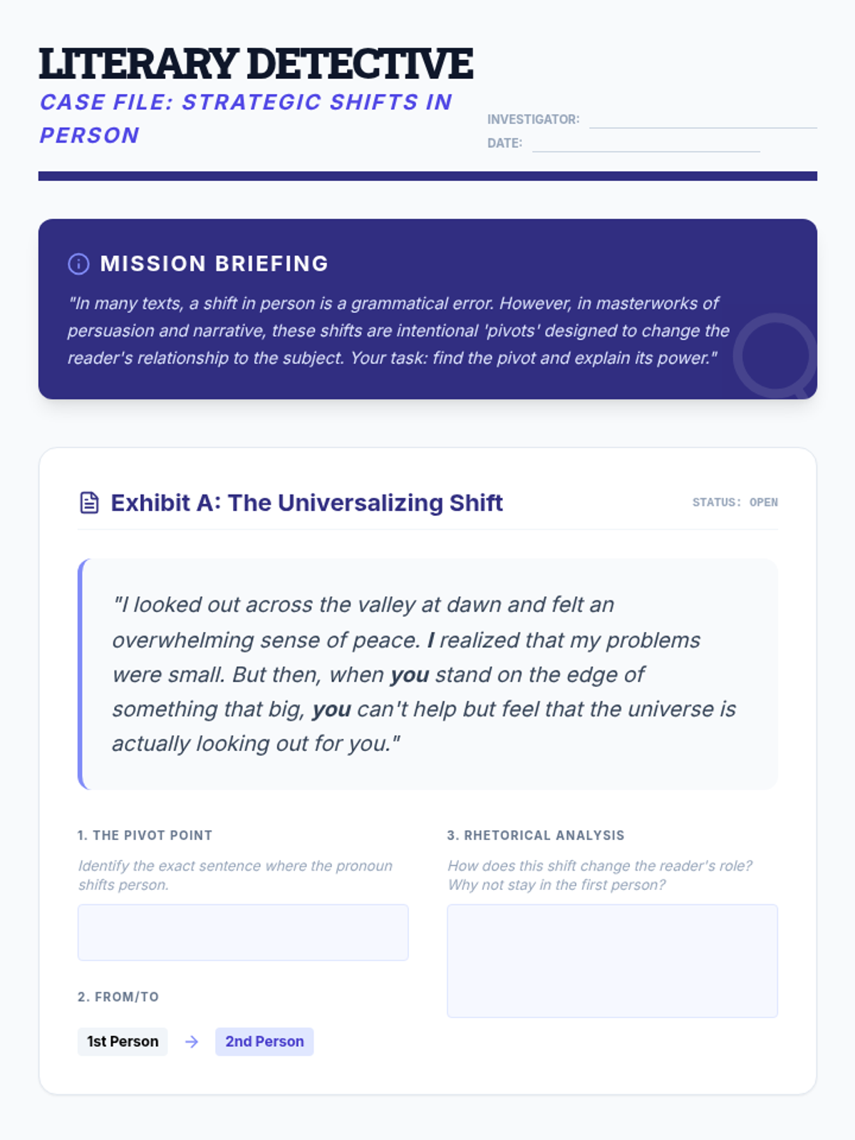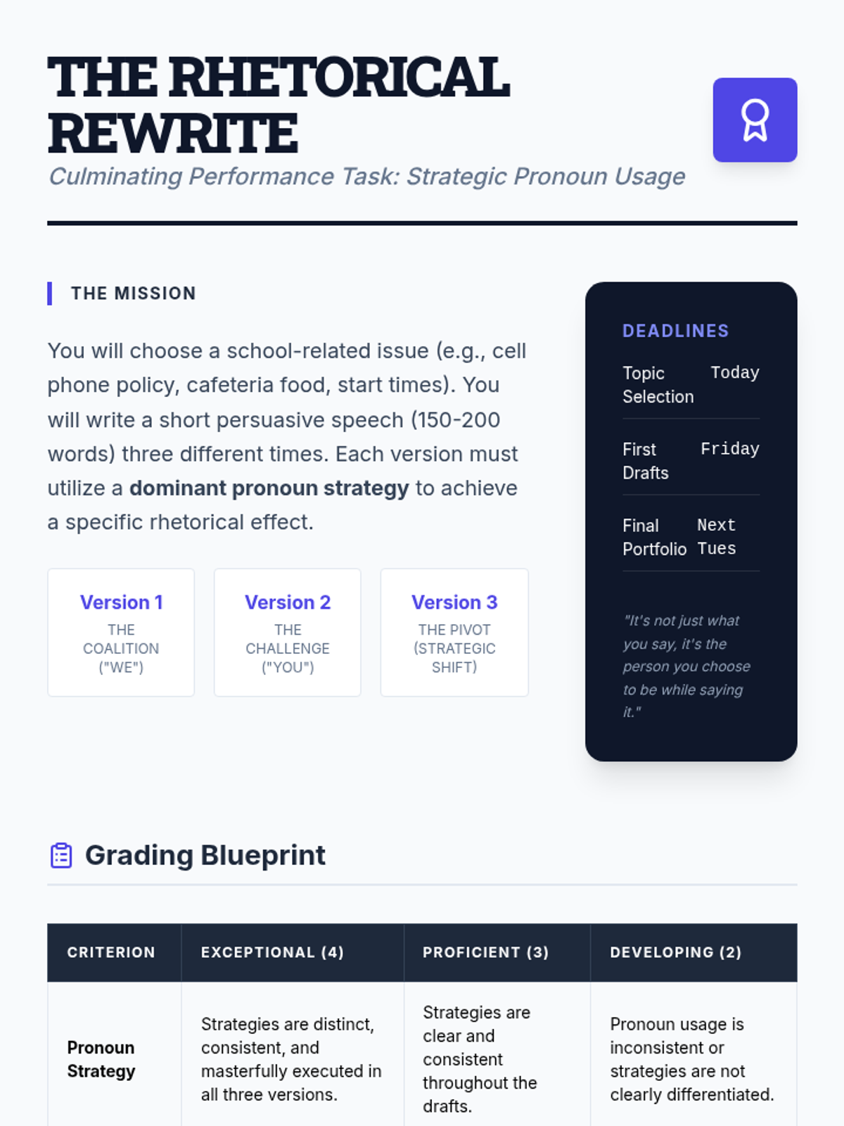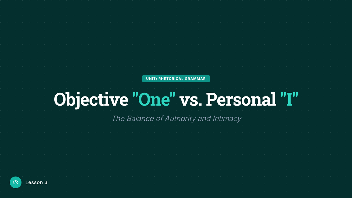 A rhetorical analysis sequence for 9th-grade students exploring how pronoun choice (I, we, you, one) influences the relationship between speaker, audience, and subject in persuasive and narrative texts.
