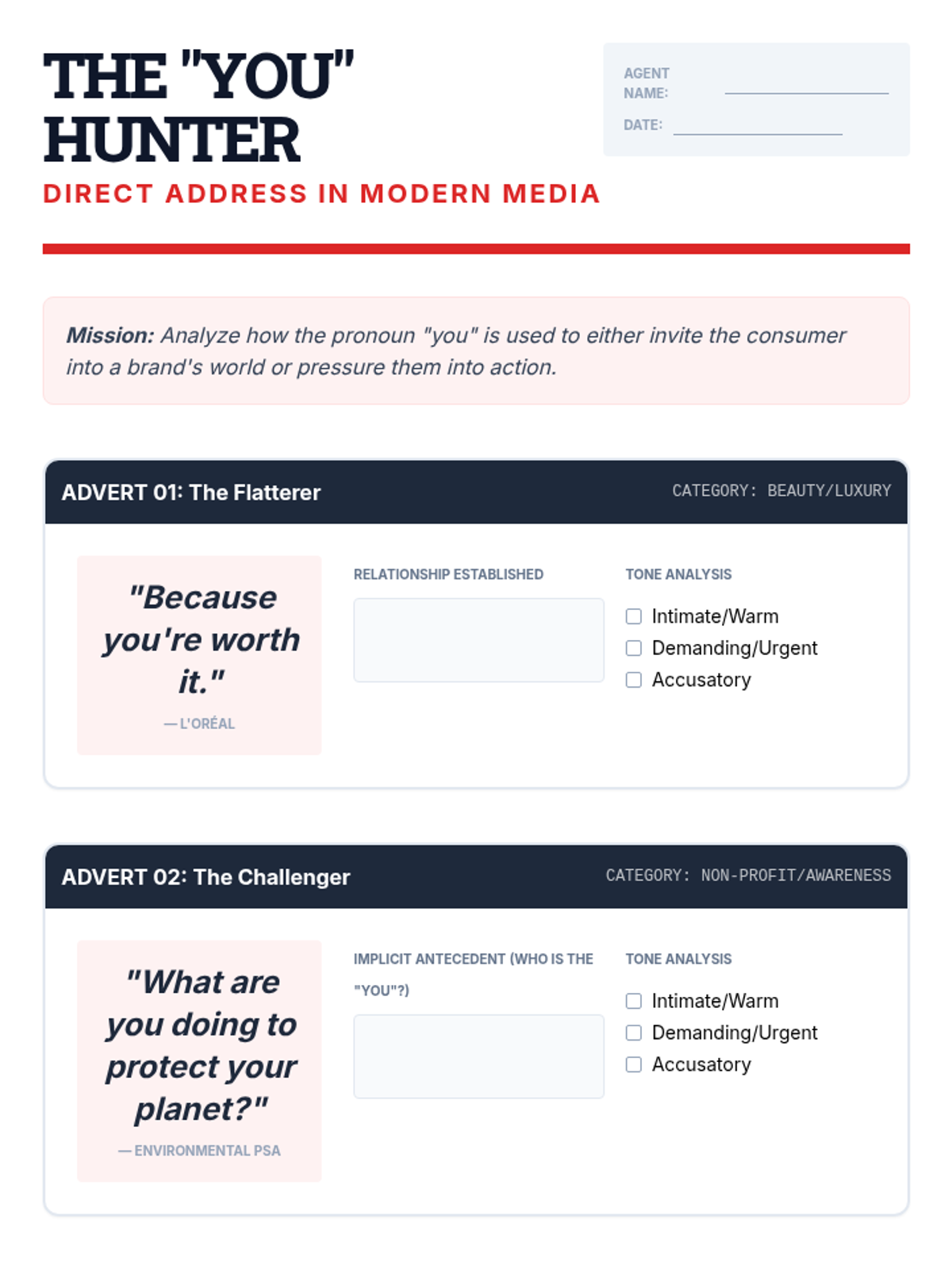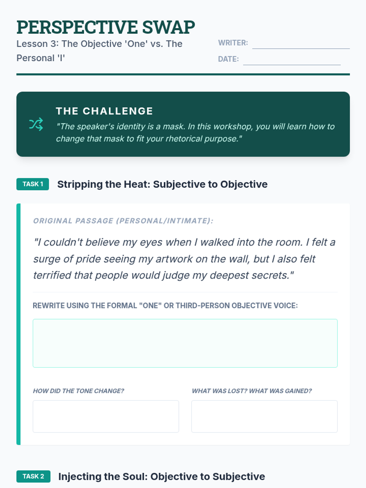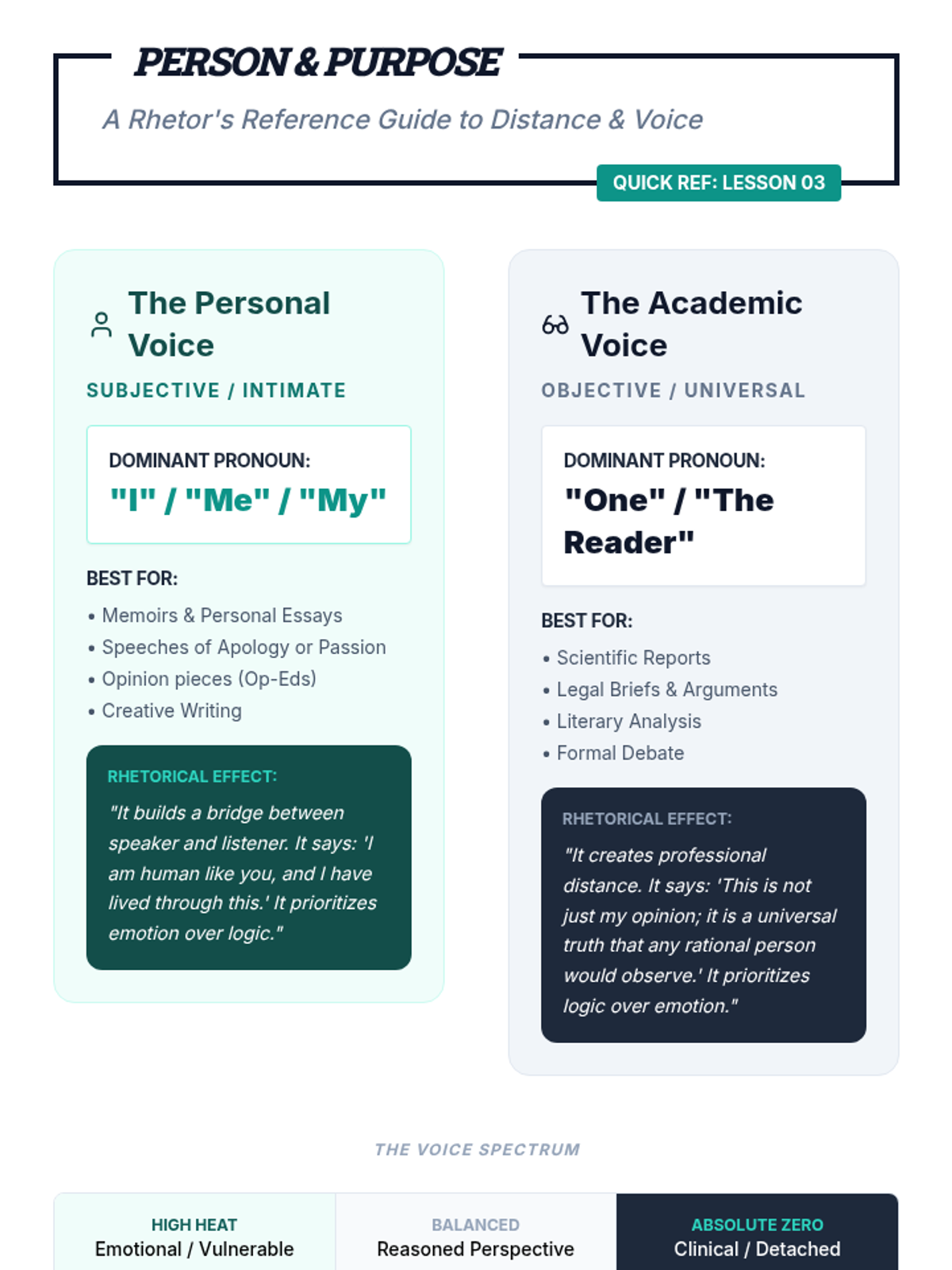 A rhetorical analysis sequence for 9th-grade students exploring how pronoun choice (I, we, you, one) influences the relationship between speaker, audience, and subject in persuasive and narrative texts.