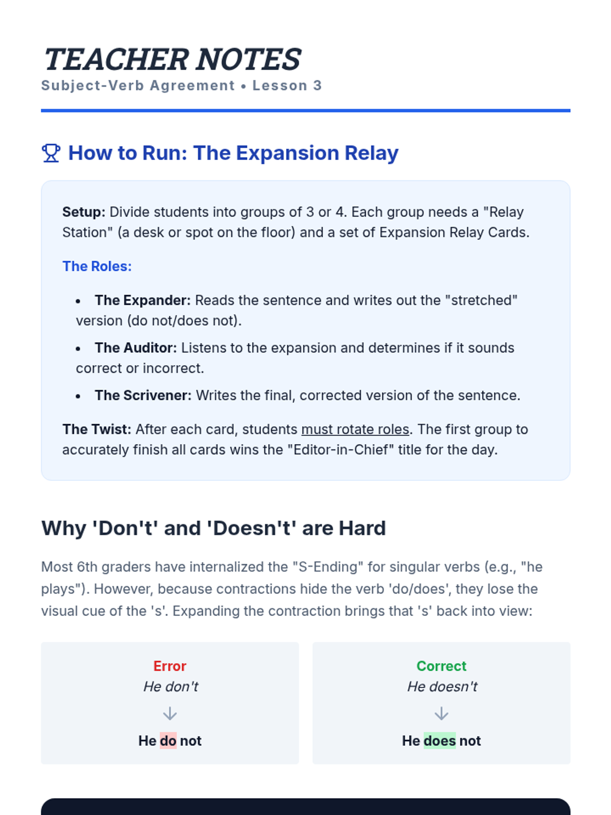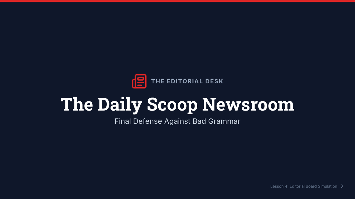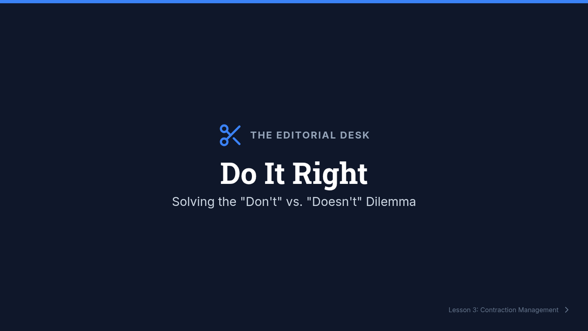 A professional simulation sequence where students act as copy editors to master subject-verb agreement in complex scenarios, including inverted sentences, existential 'there', and contractions. Students transition from isolated skill practice to full-scale text auditing and personal revision.
