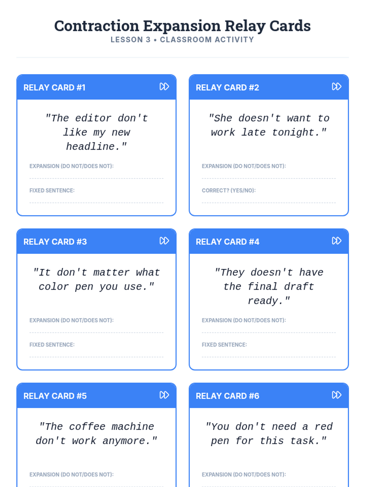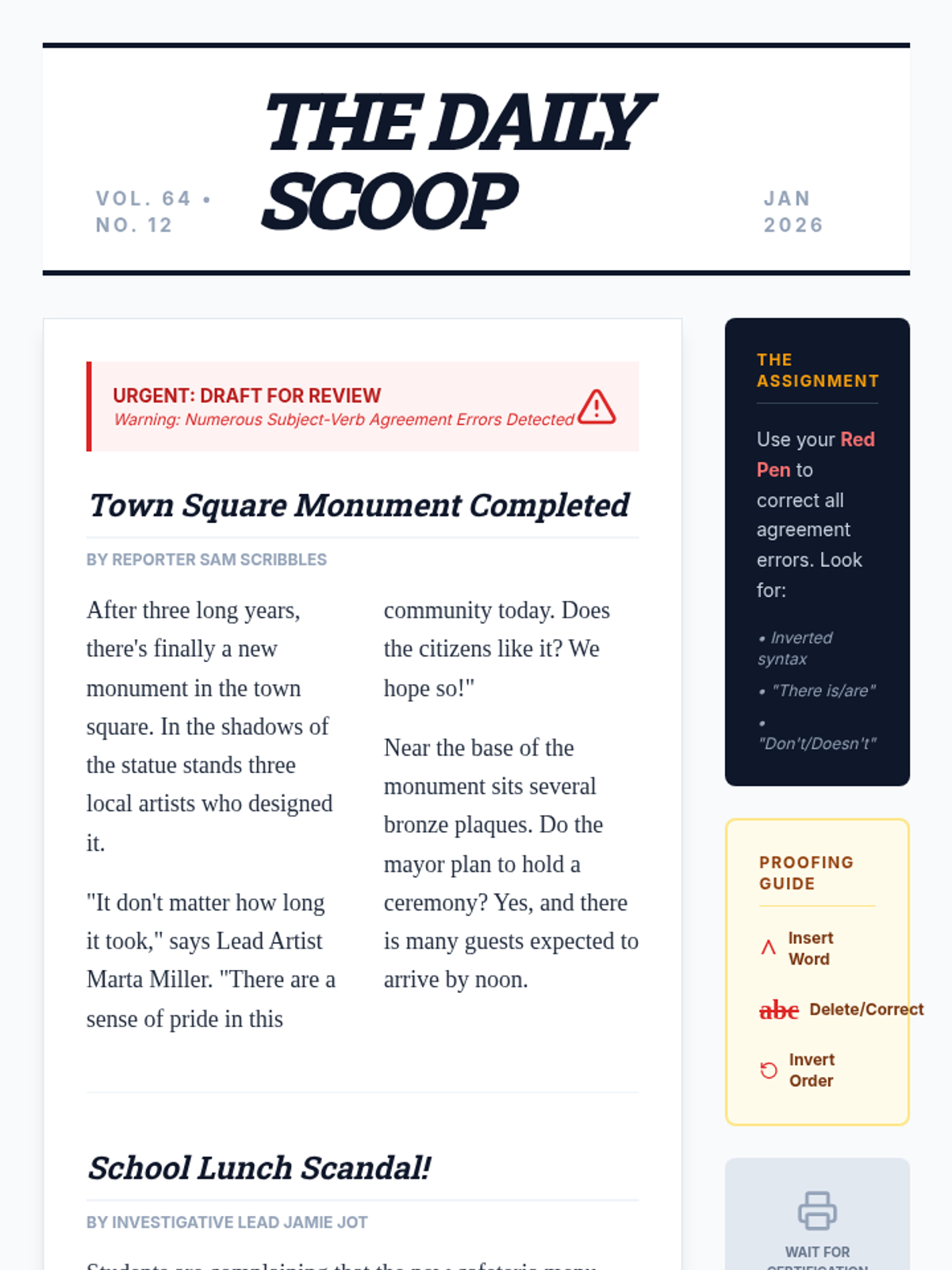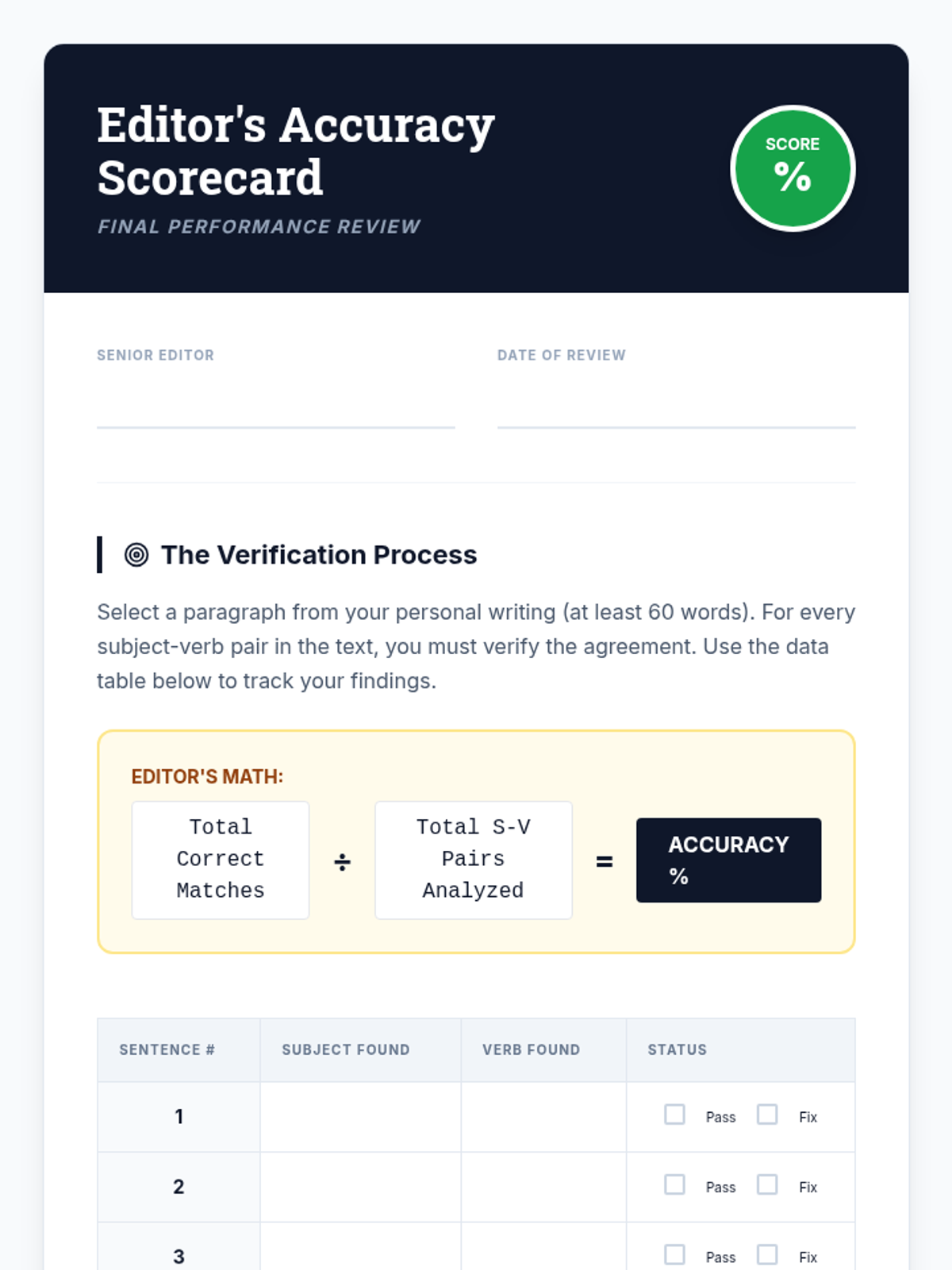 A professional simulation sequence where students act as copy editors to master subject-verb agreement in complex scenarios, including inverted sentences, existential 'there', and contractions. Students transition from isolated skill practice to full-scale text auditing and personal revision.