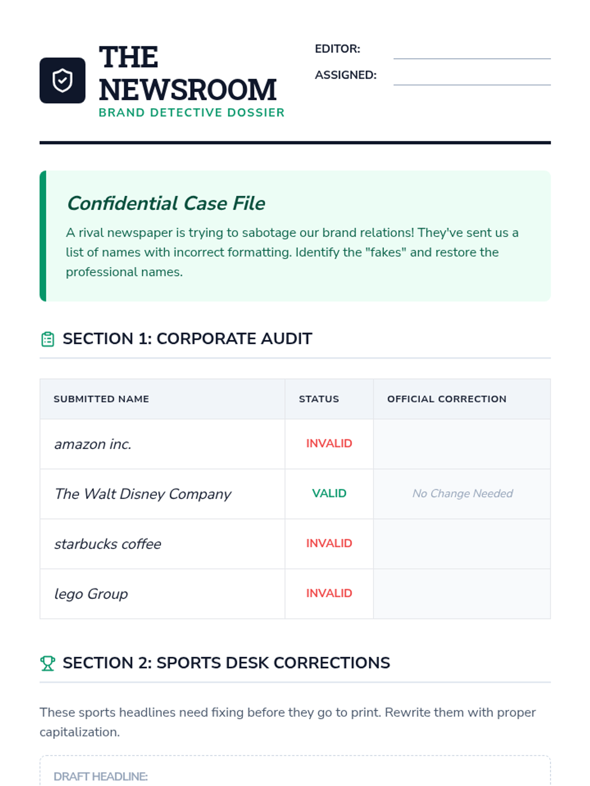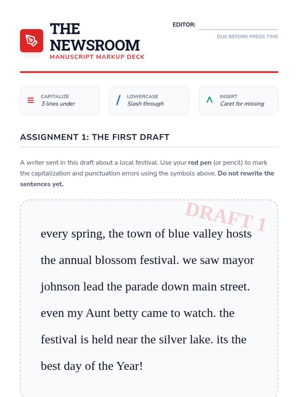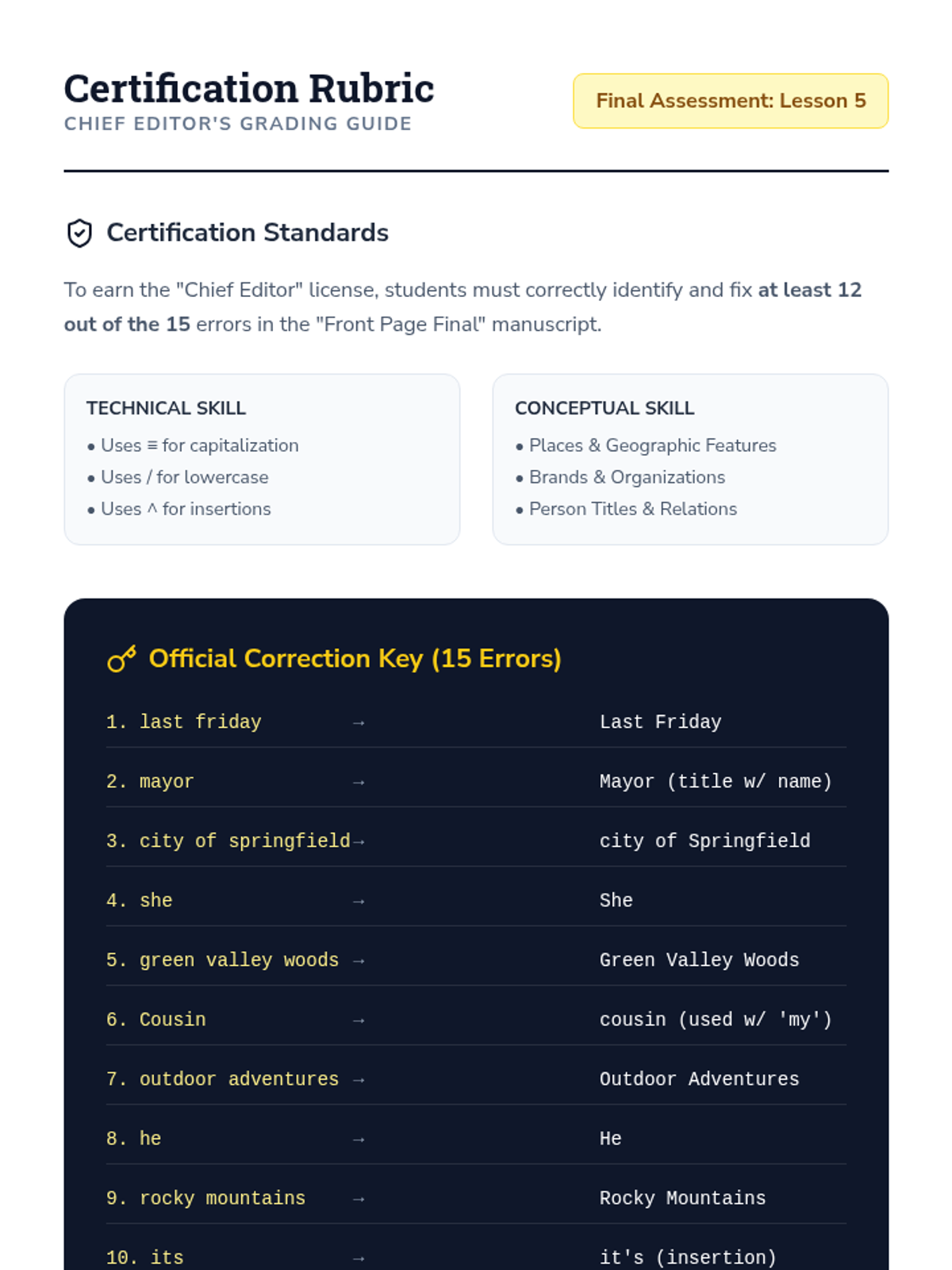 A 5th-grade ELA sequence where students become professional copy editors, mastering capitalization and mechanics through a newsroom-themed simulation. Students progress from specific noun categories to professional proofreading symbols, culminating in a Chief Editor certification challenge.