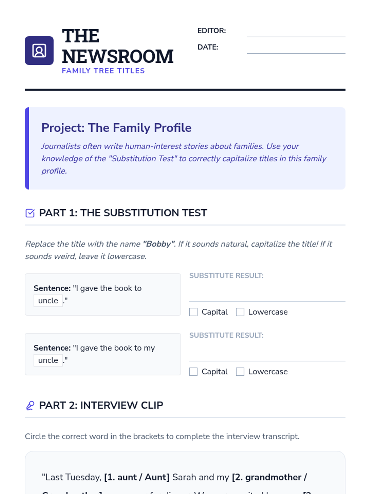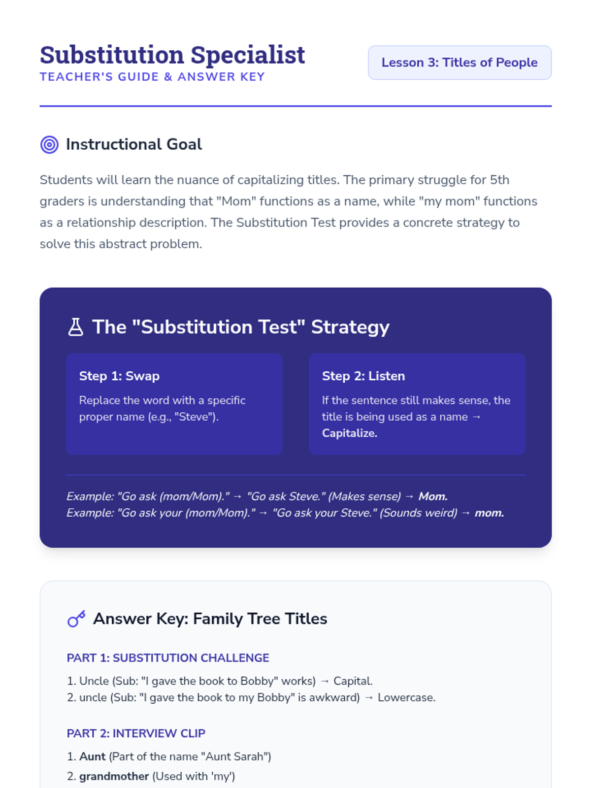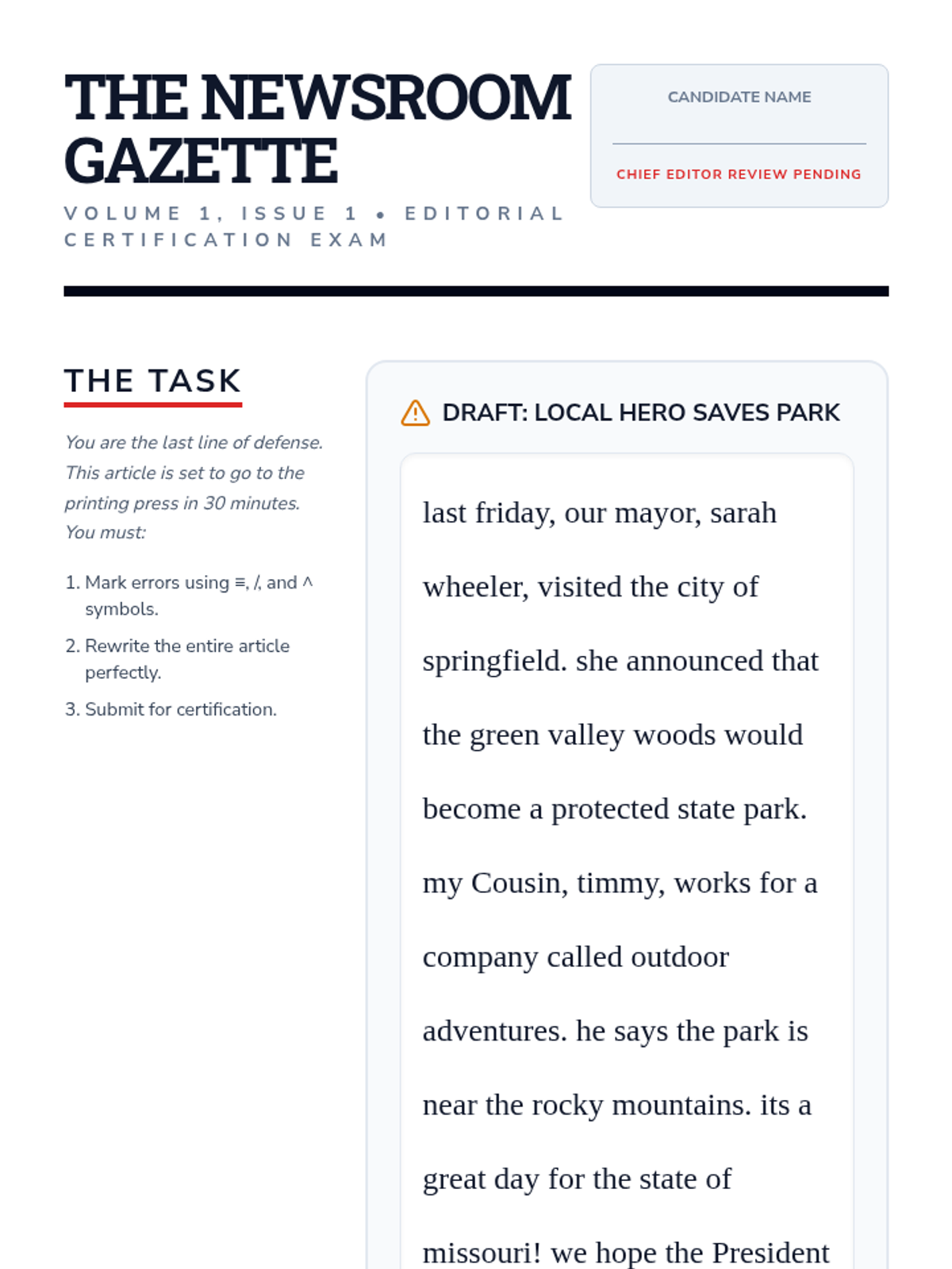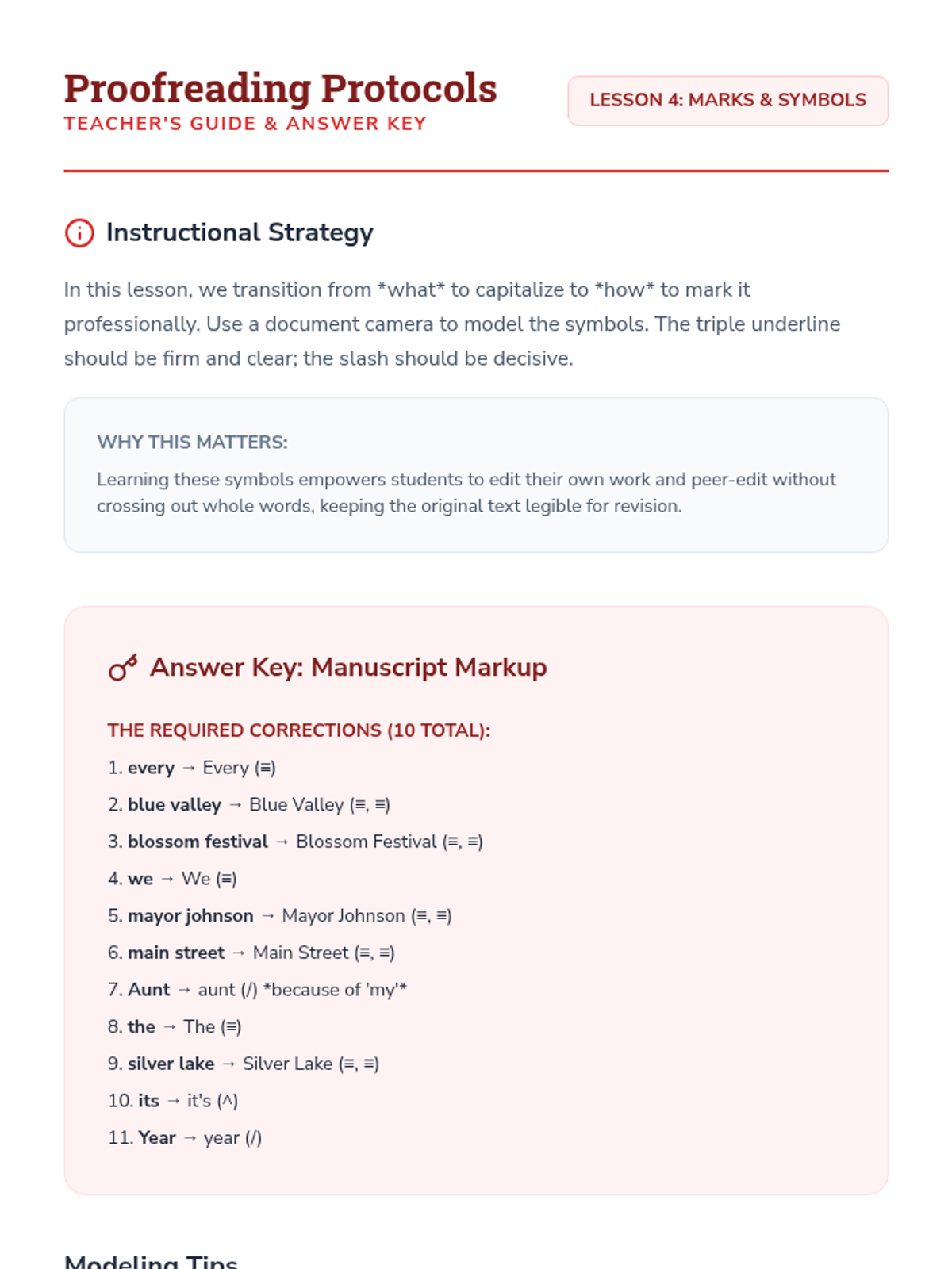 A 5th-grade ELA sequence where students become professional copy editors, mastering capitalization and mechanics through a newsroom-themed simulation. Students progress from specific noun categories to professional proofreading symbols, culminating in a Chief Editor certification challenge.
