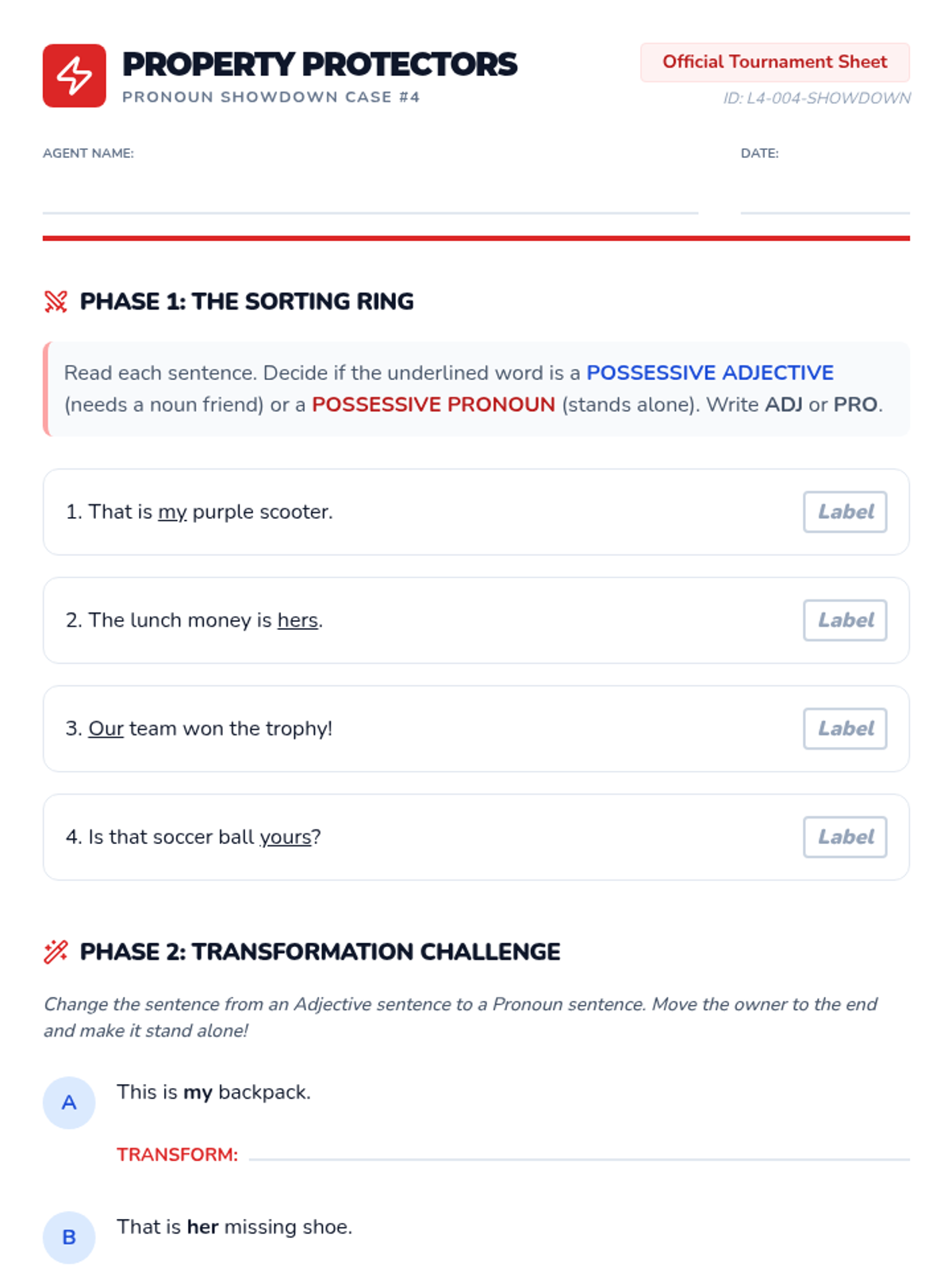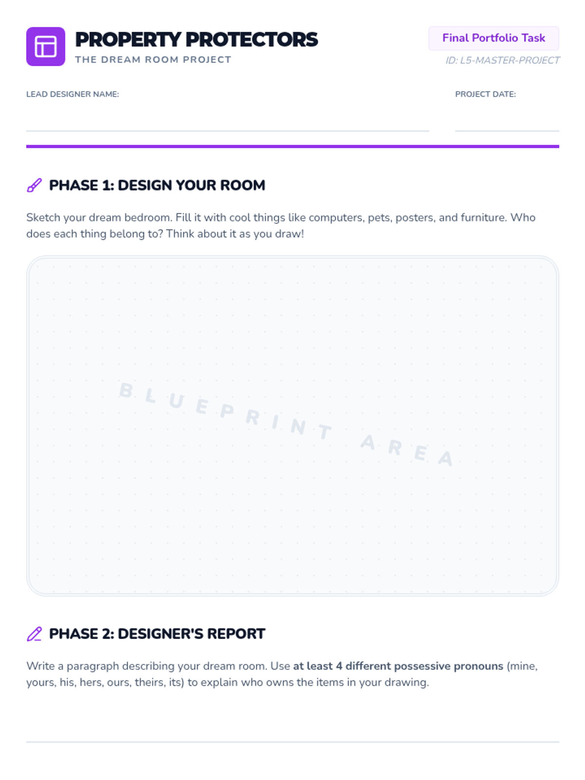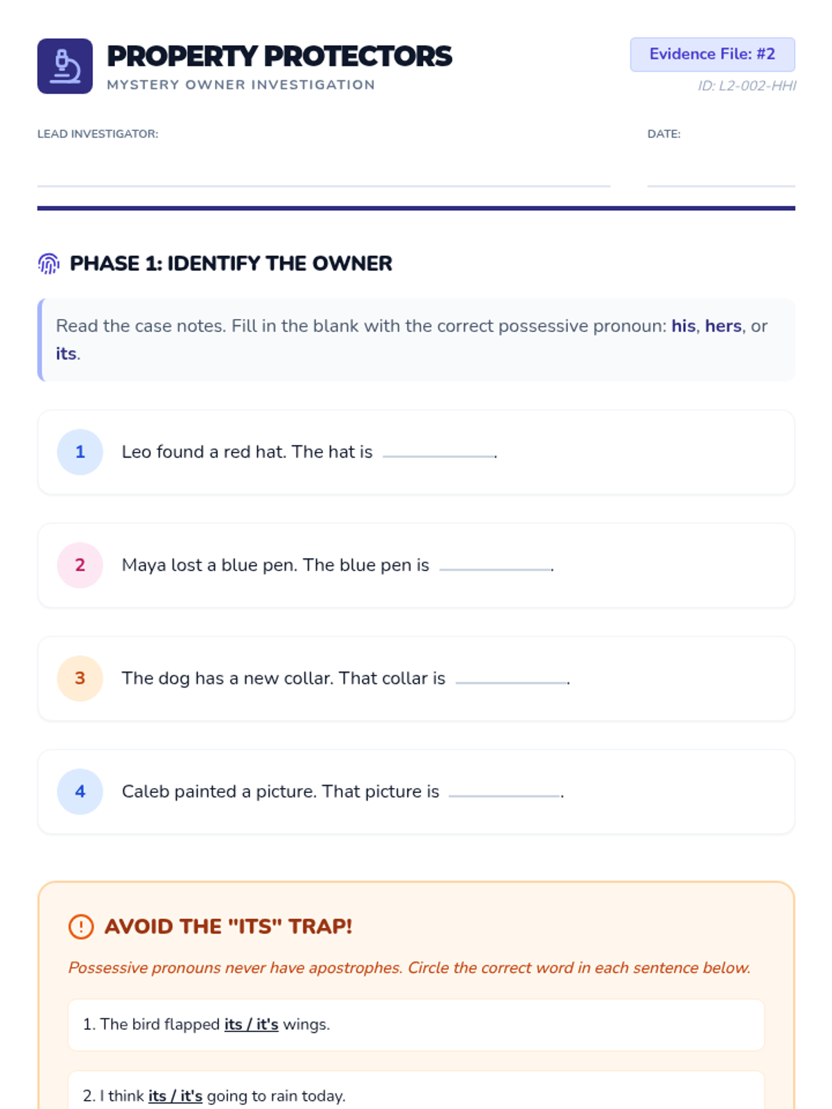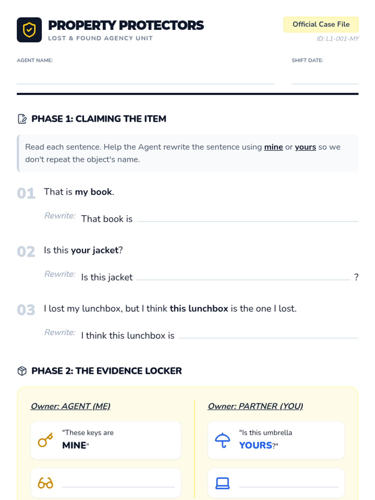 A simulation-based unit where students become 'Property Protectors' to master possessive pronouns. They learn to identify ownership through role-play, mystery games, and creative writing projects.