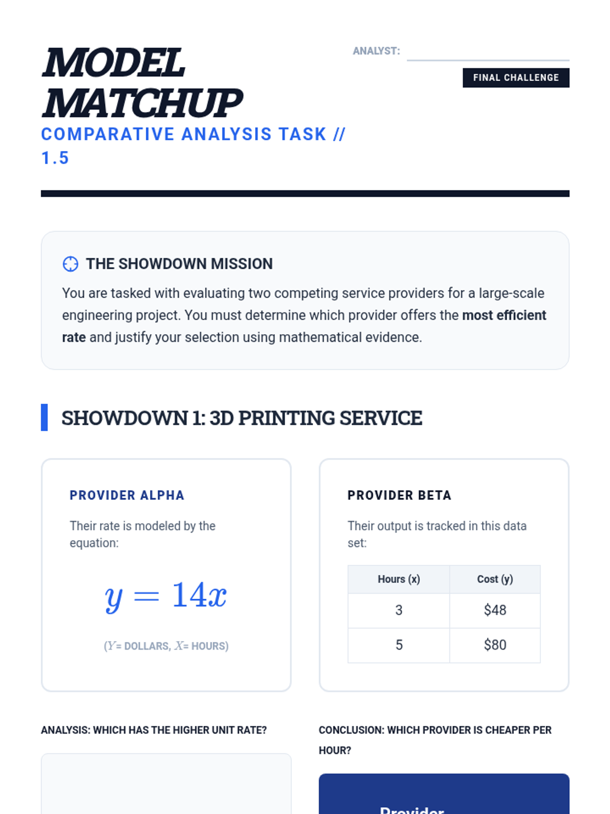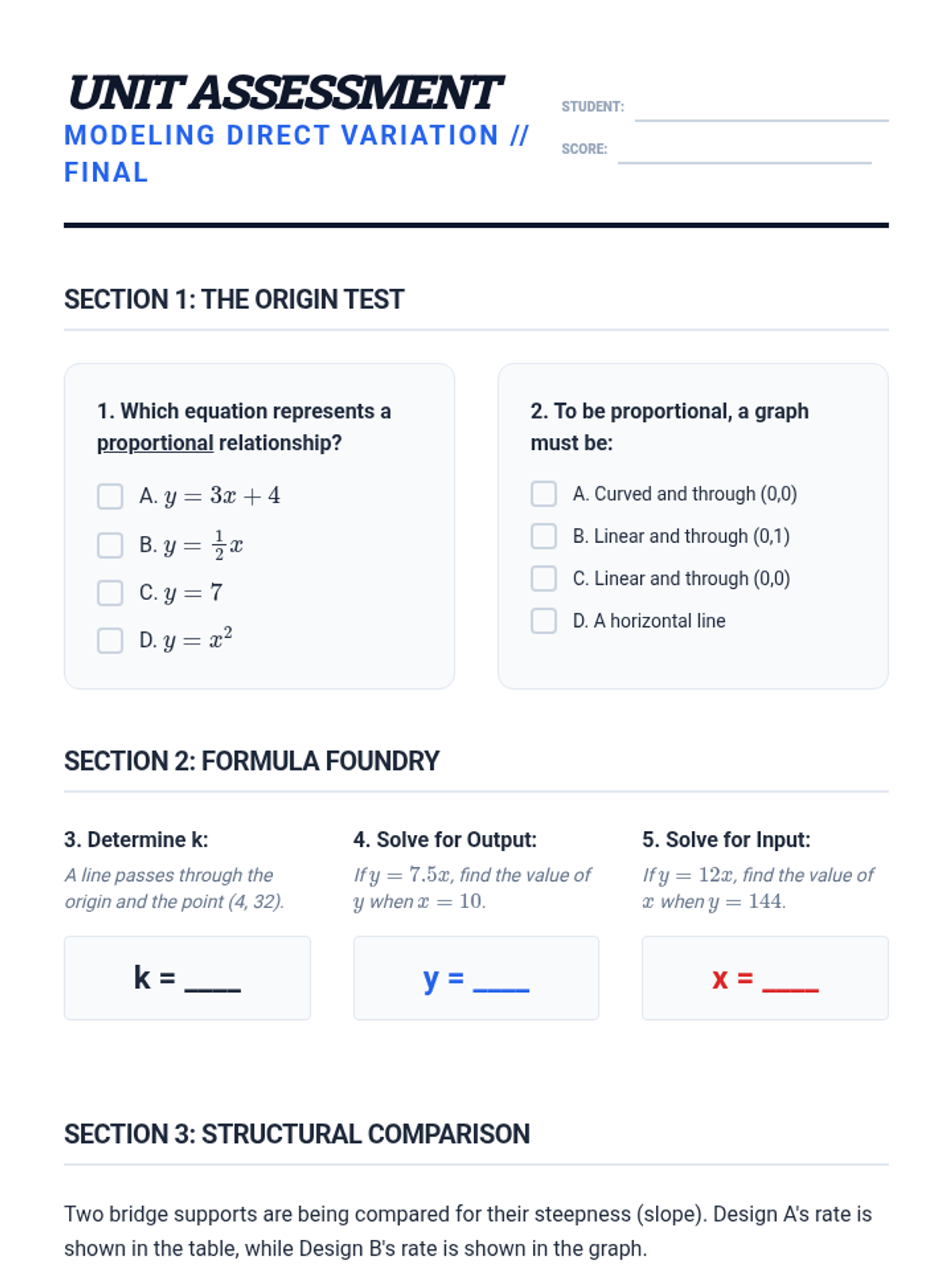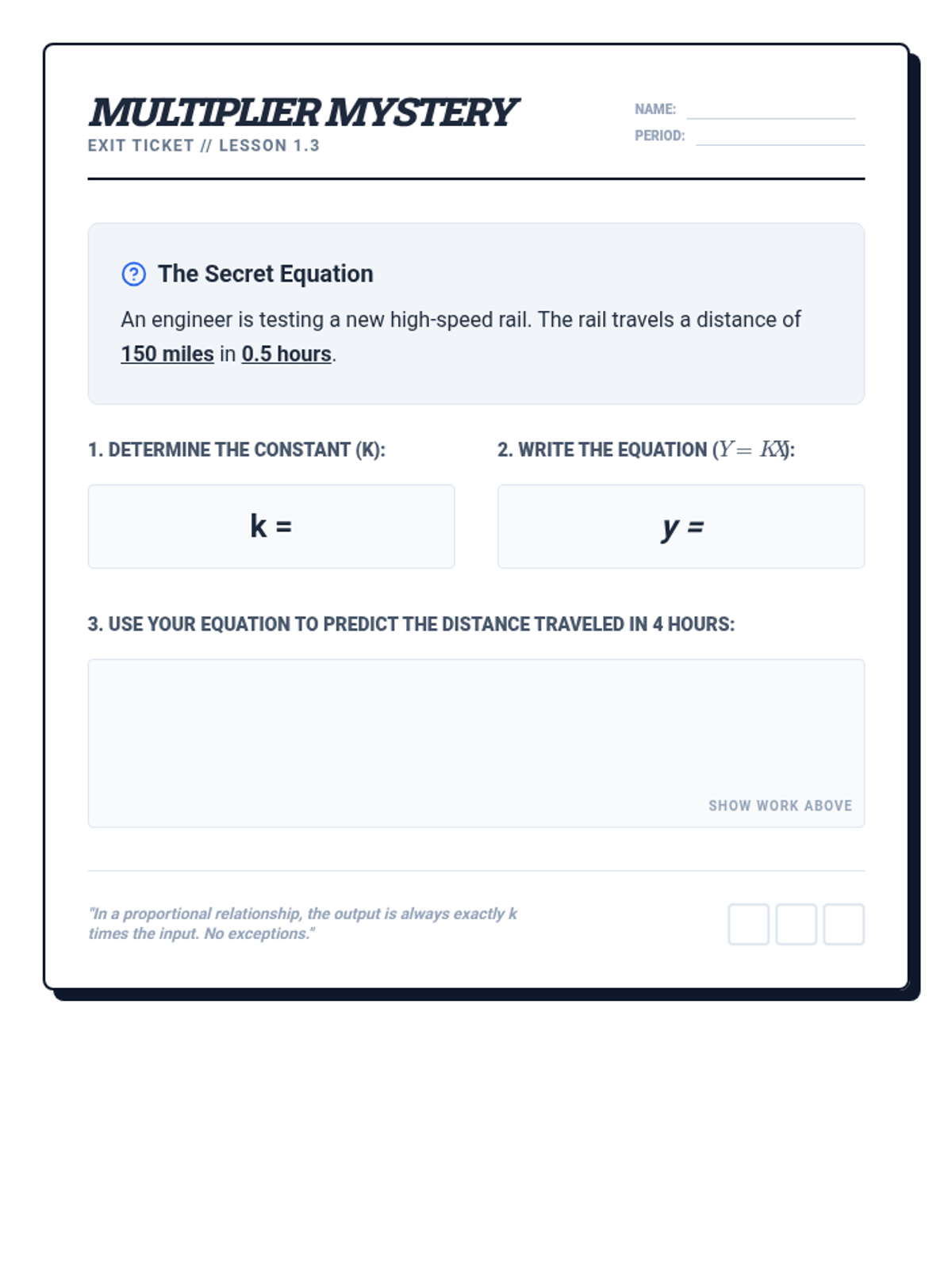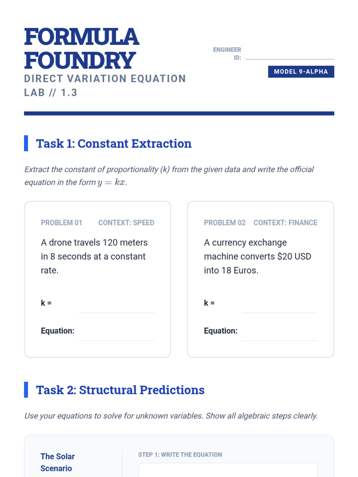 This sequence bridges the gap between ratio reasoning and Algebra I by exploring direct variation, unit rates as slope, and real-world physics modeling. Students progress from identifying proportional relationships to formulating equations and comparing complex linear models.