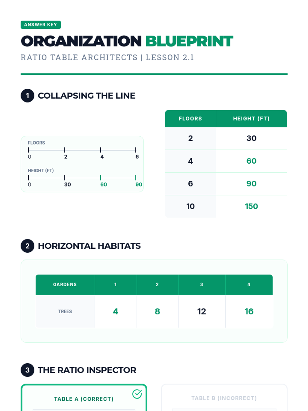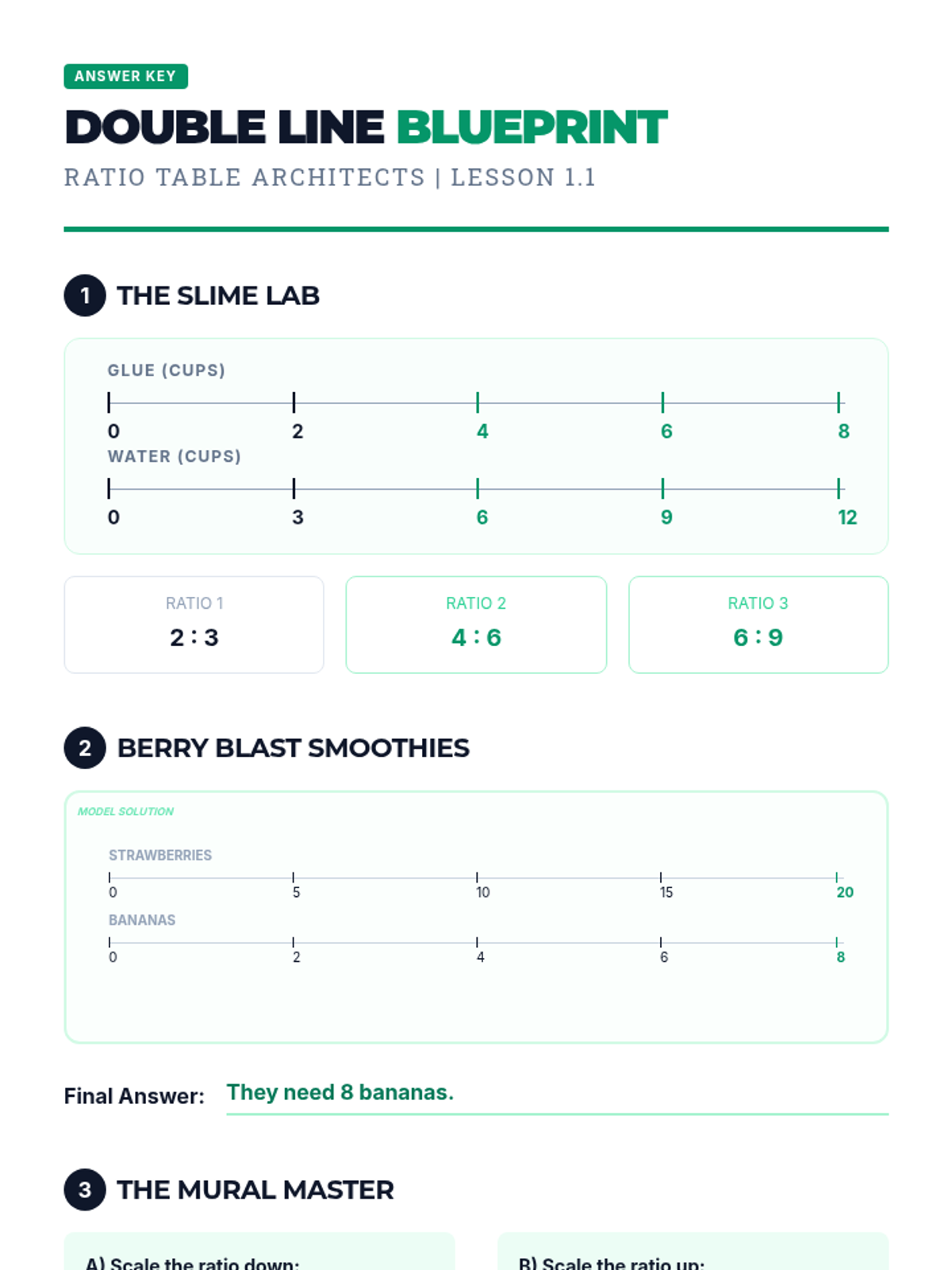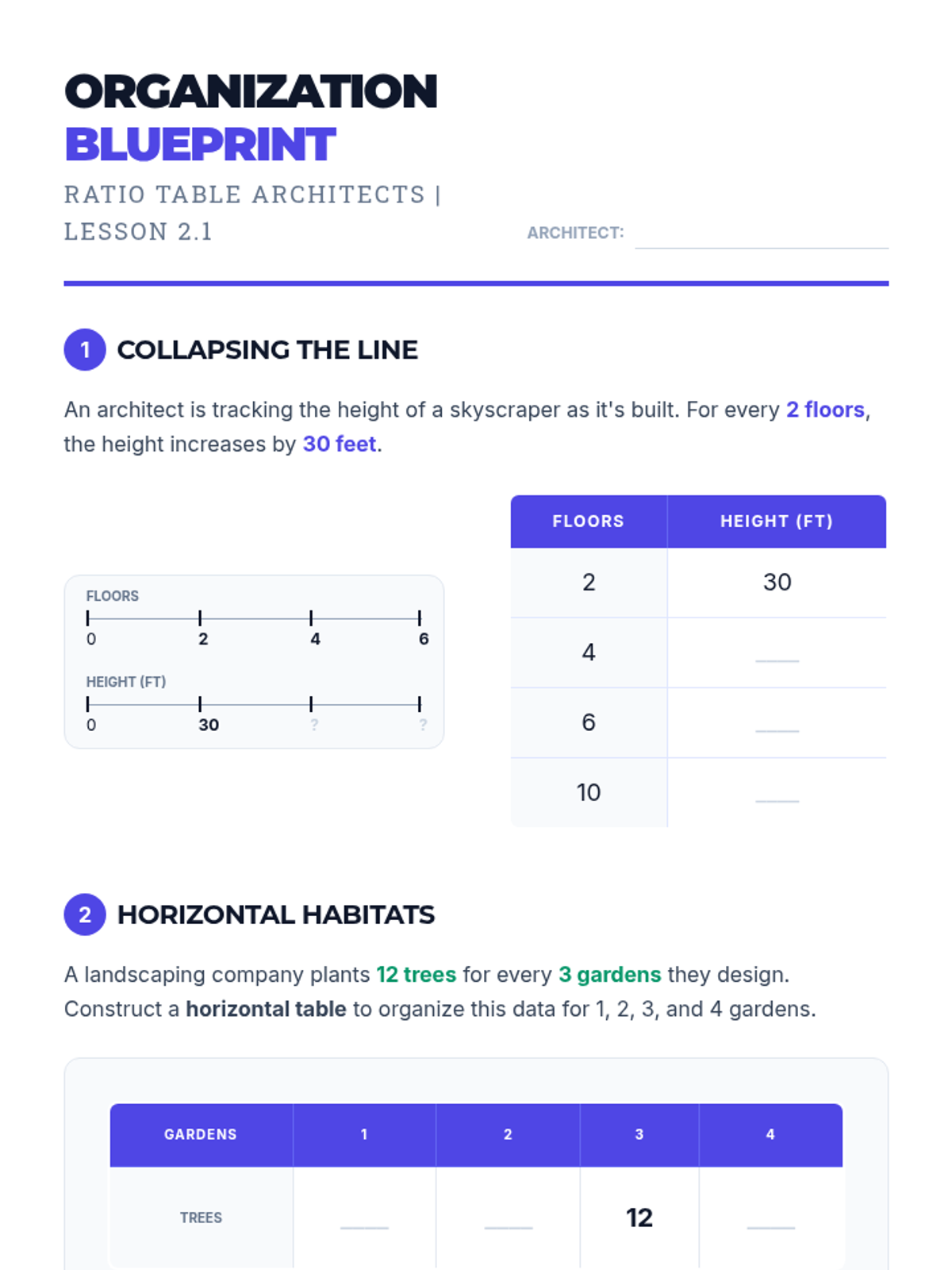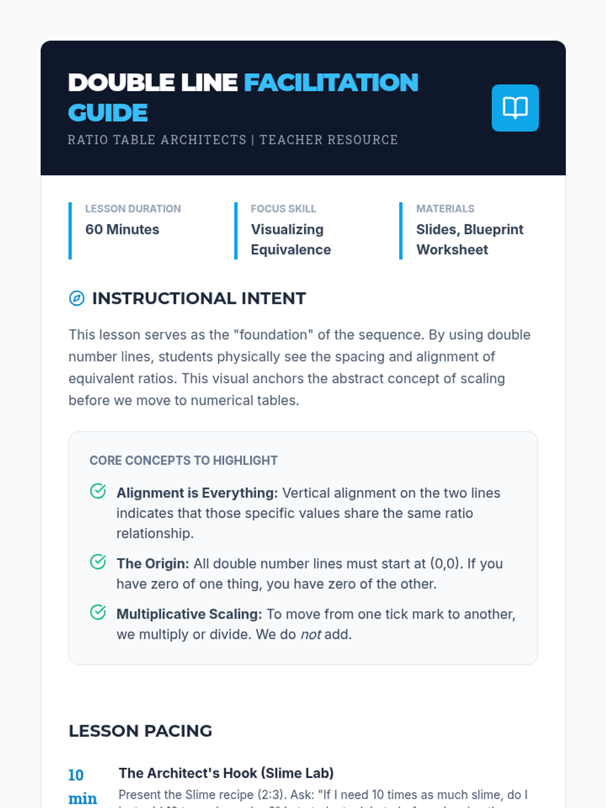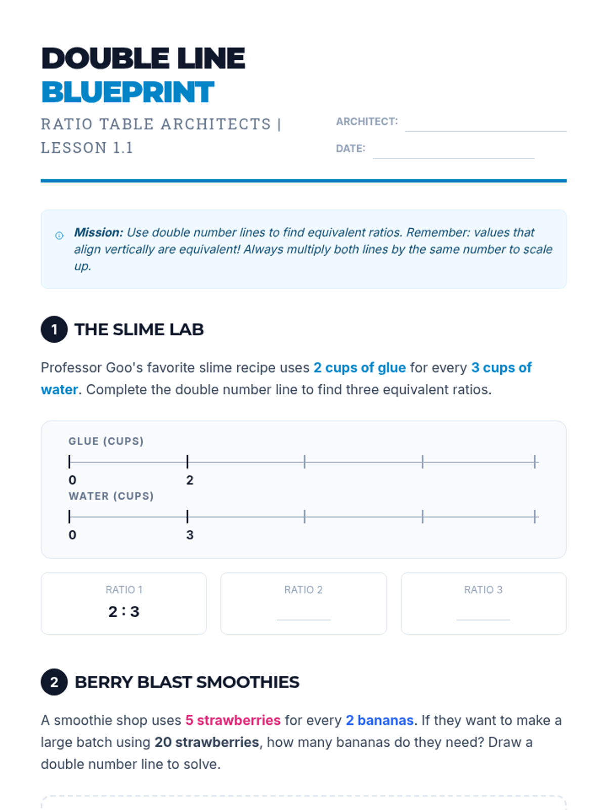 This foundational sequence transitions 6th-grade students from concrete visual models like double number lines to abstract numerical ratio tables. Students explore the multiplicative nature of proportional relationships and learn to calculate missing values to solve real-world problems.