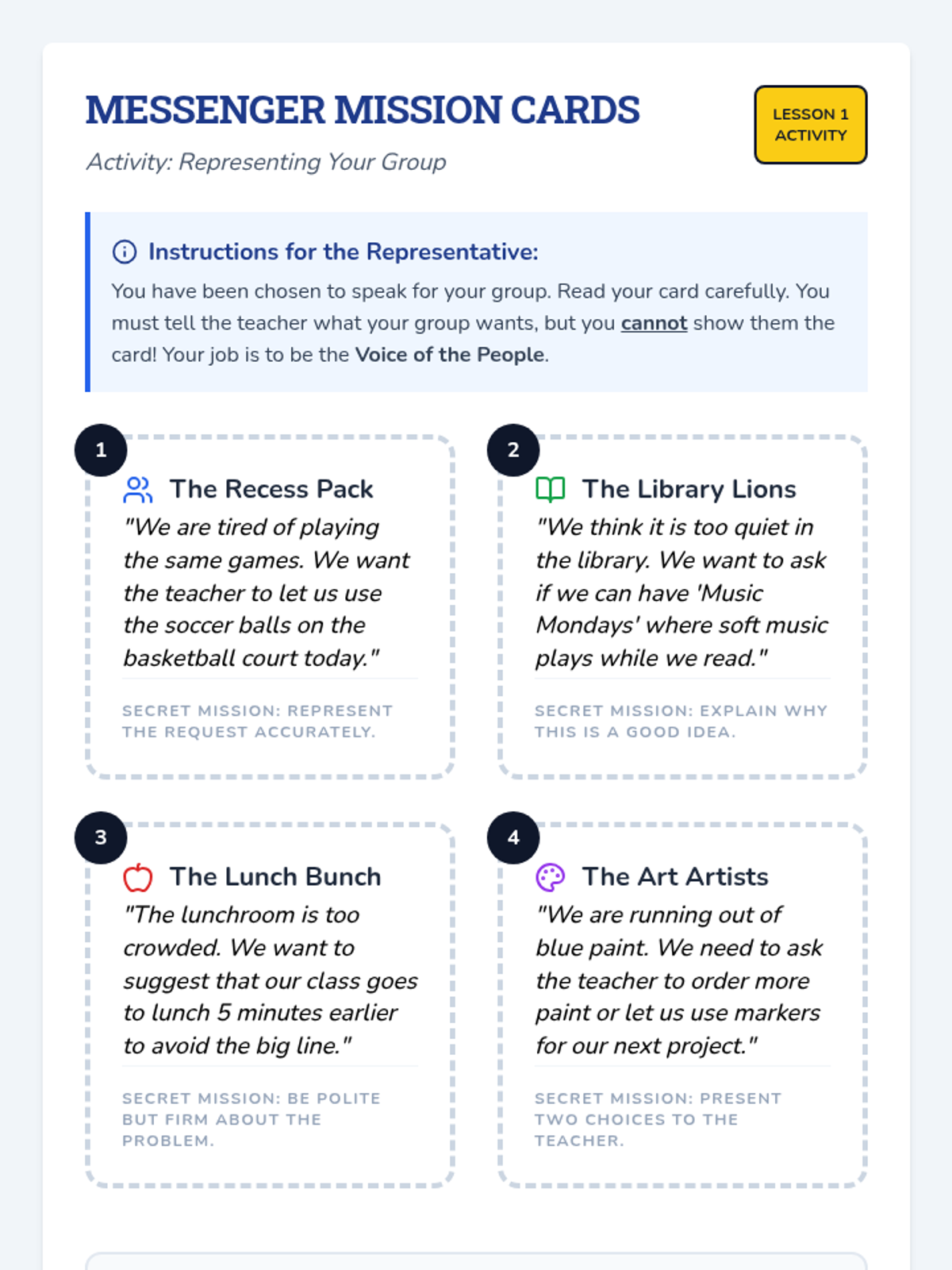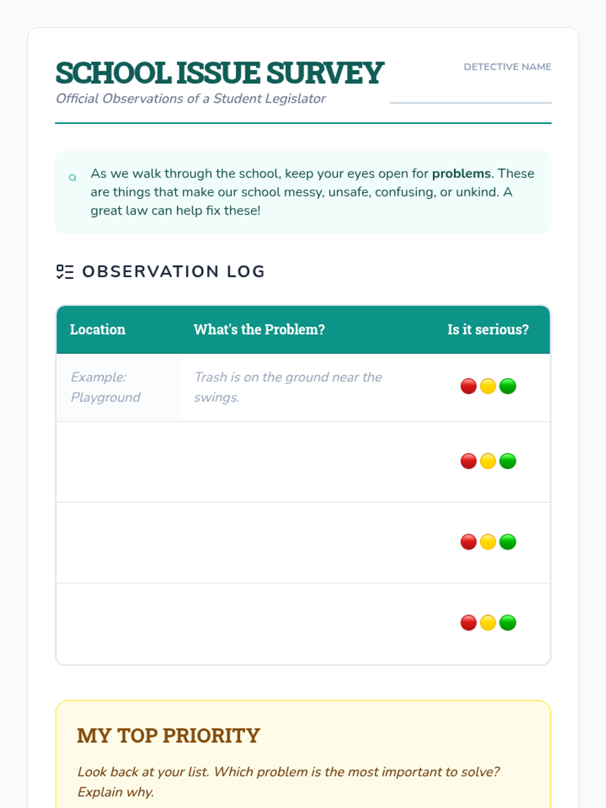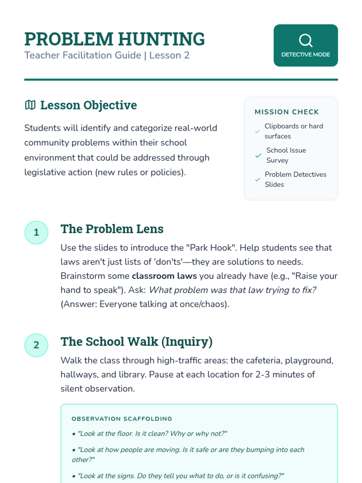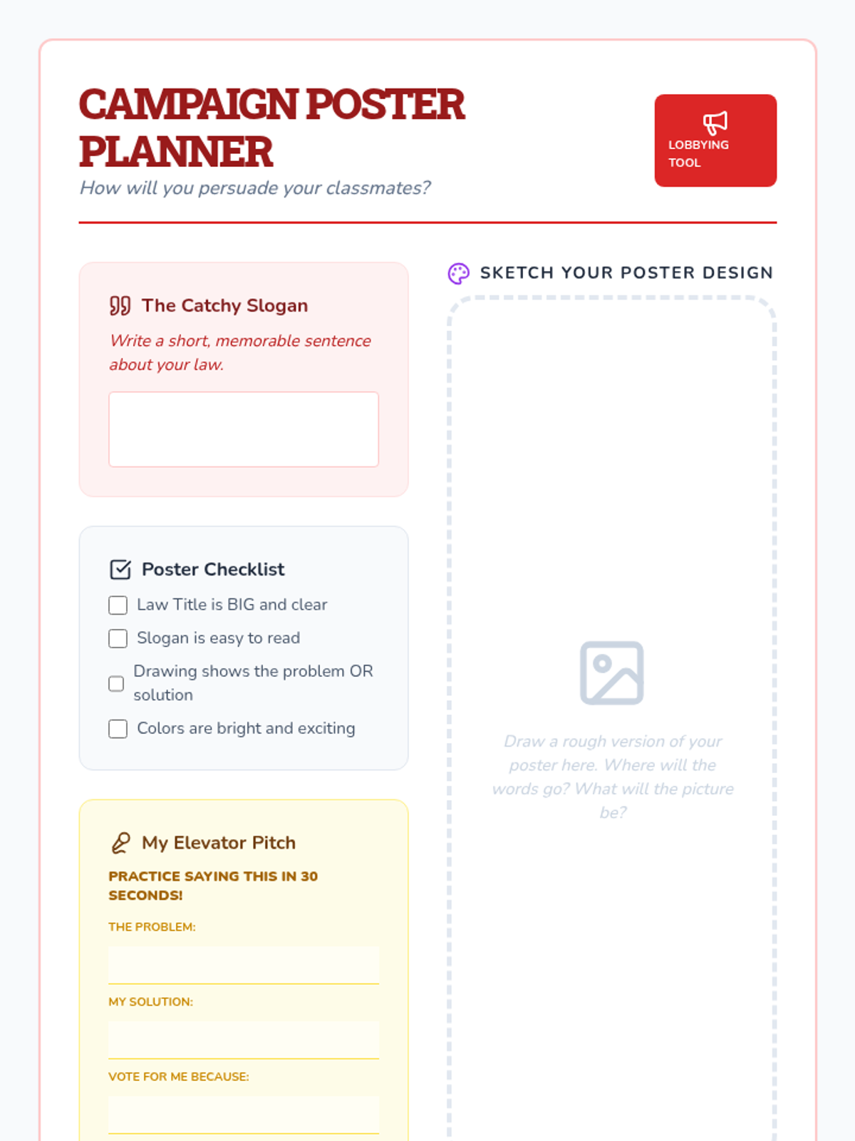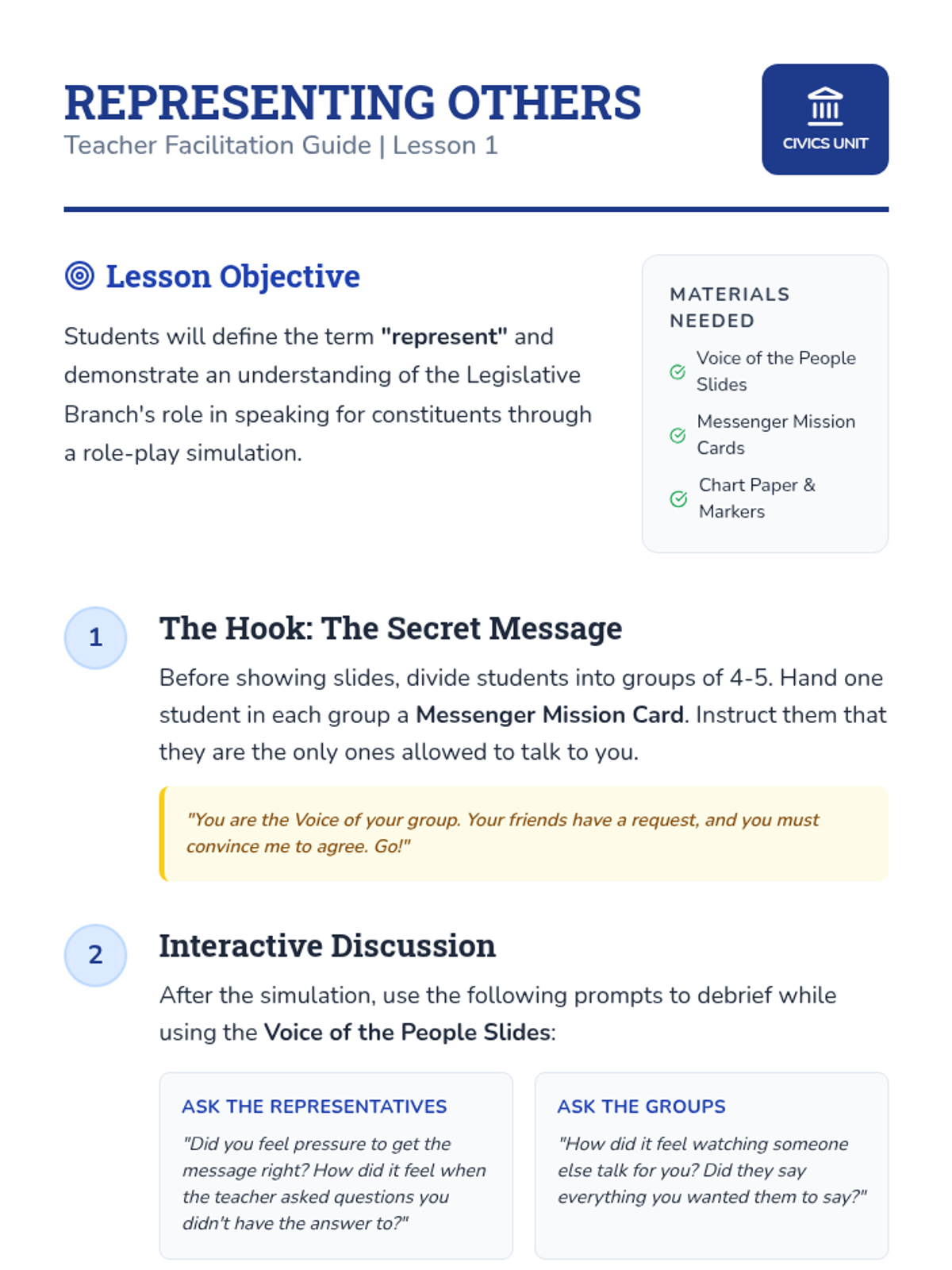 A project-based civics sequence for 3rd graders focusing on the role of the Legislative Branch through the lens of community problem-solving. Students move from understanding representation to drafting and presenting their own legislative proposals.