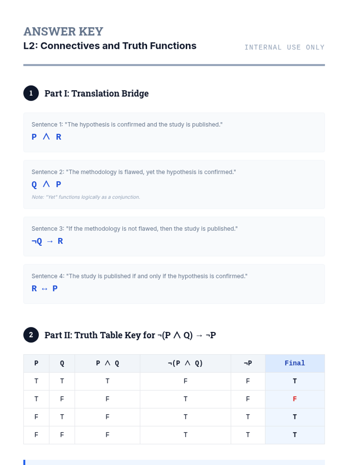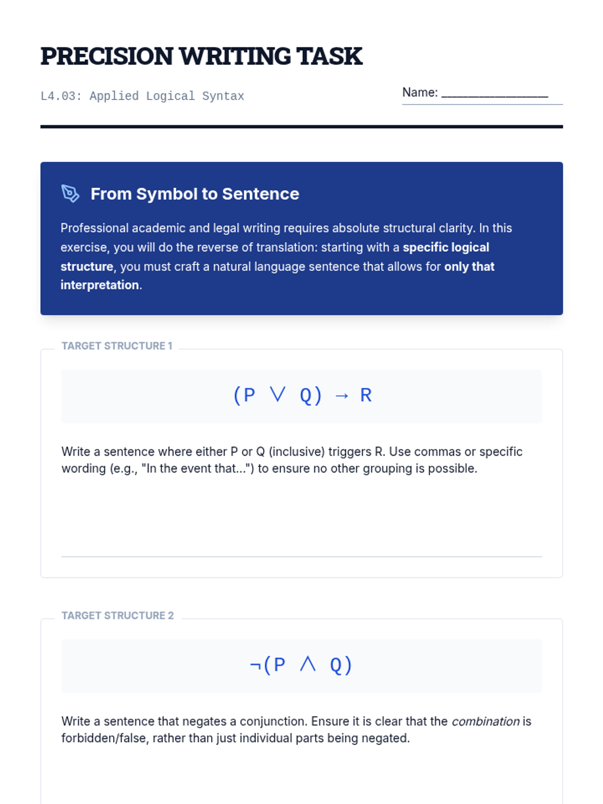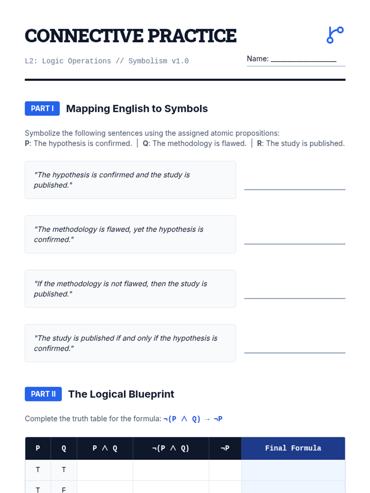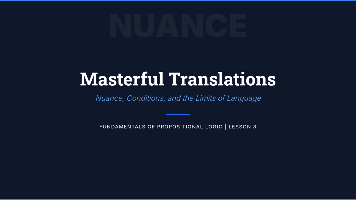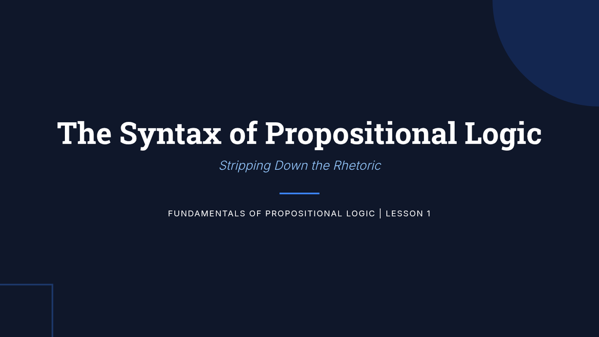 A graduate-level introduction to propositional logic, focusing on the rigorous translation of natural language rhetoric into symbolic notation. Students build from atomic propositions to complex well-formed formulas (WFFs), learning to identify logical structure within dense academic and legal texts.