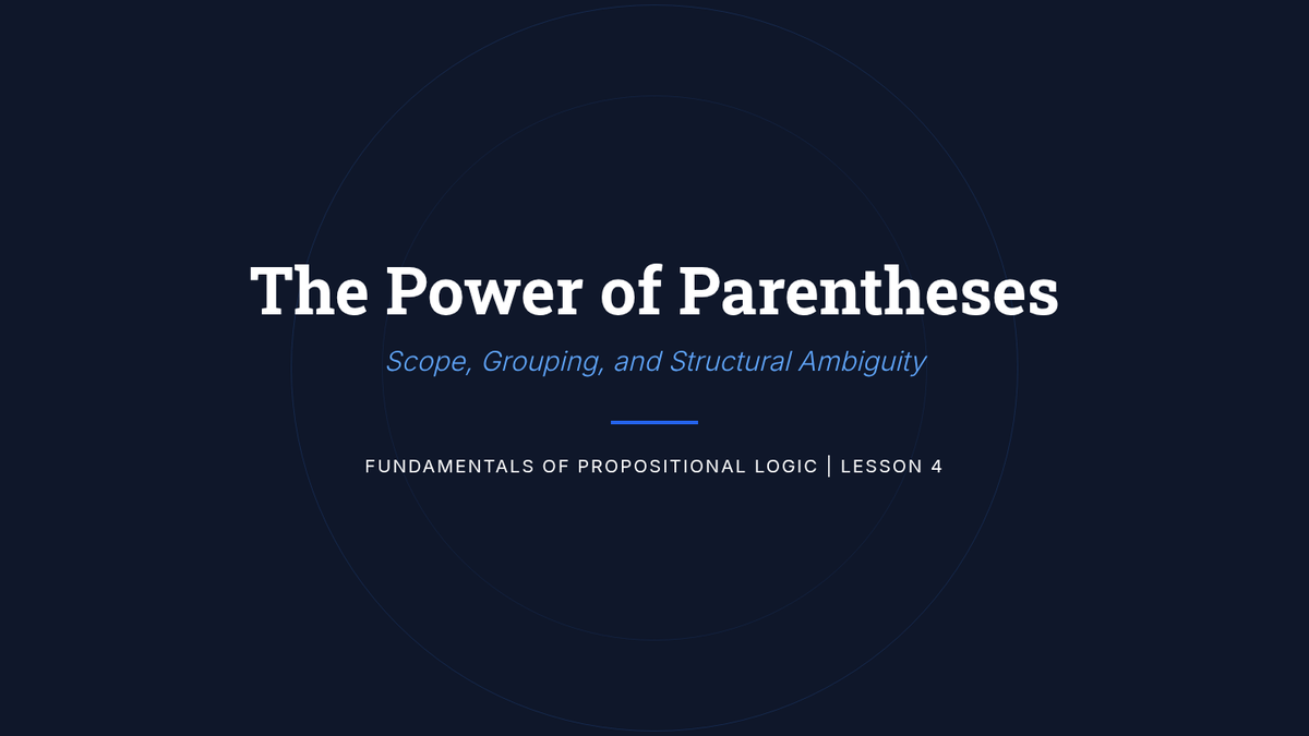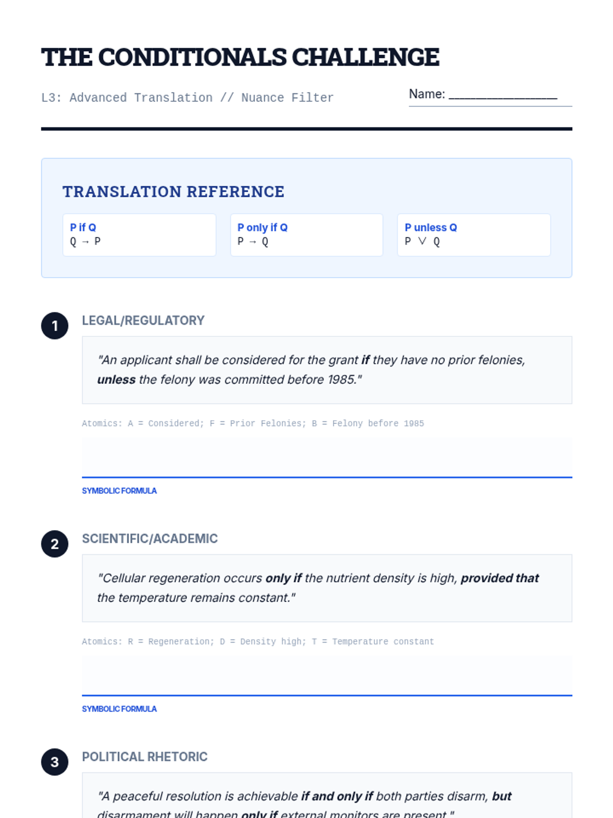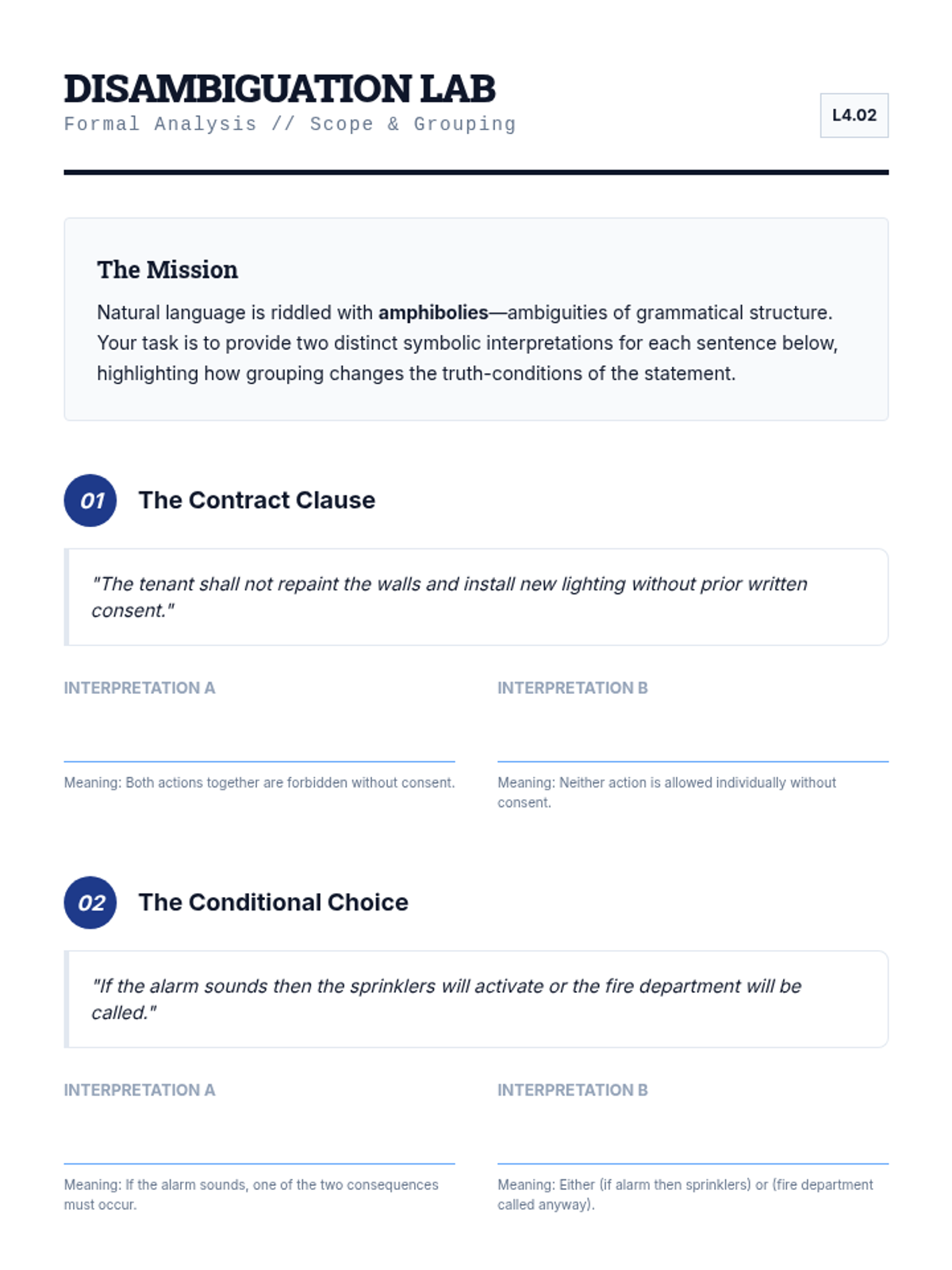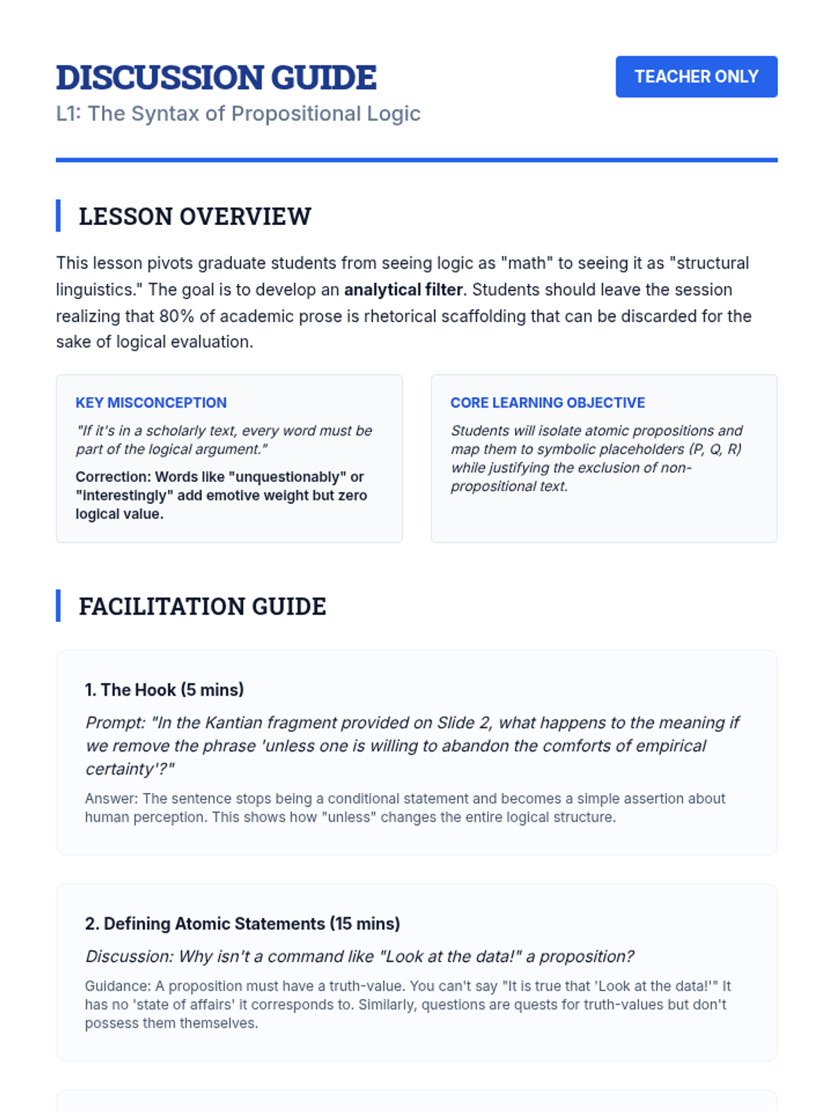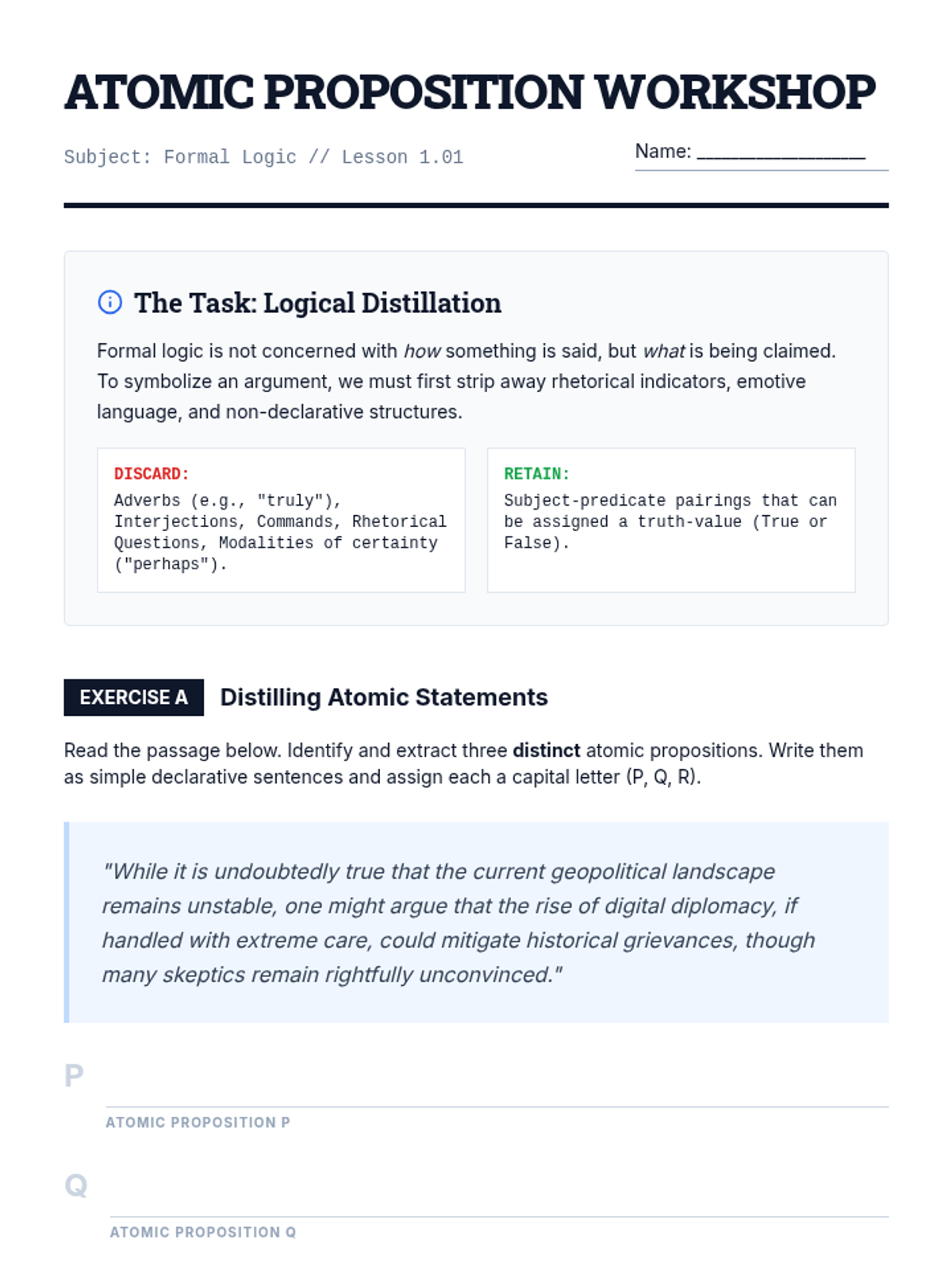 A graduate-level introduction to propositional logic, focusing on the rigorous translation of natural language rhetoric into symbolic notation. Students build from atomic propositions to complex well-formed formulas (WFFs), learning to identify logical structure within dense academic and legal texts.