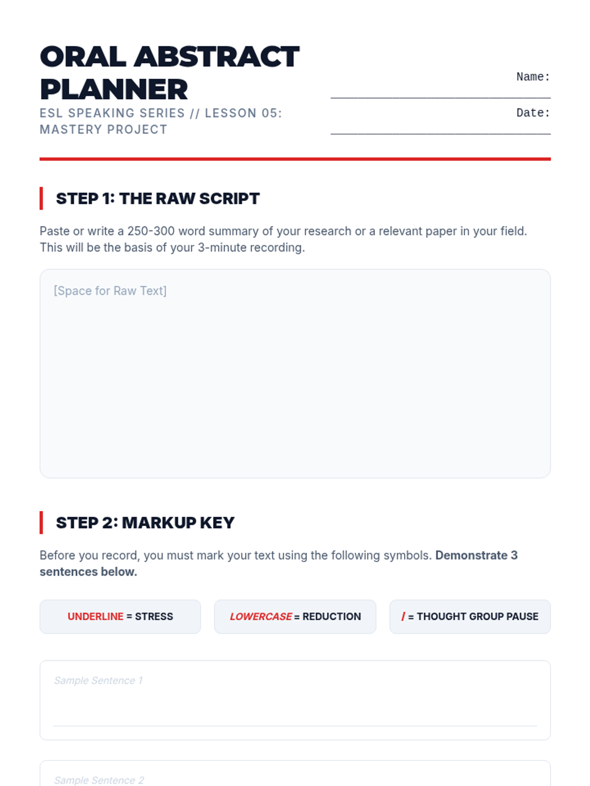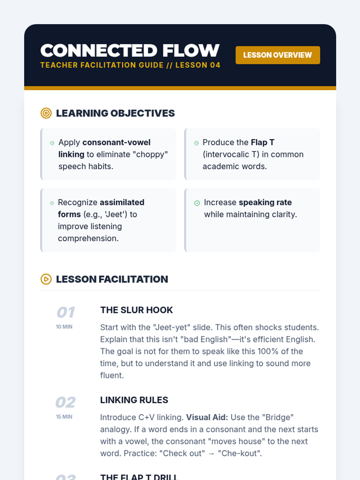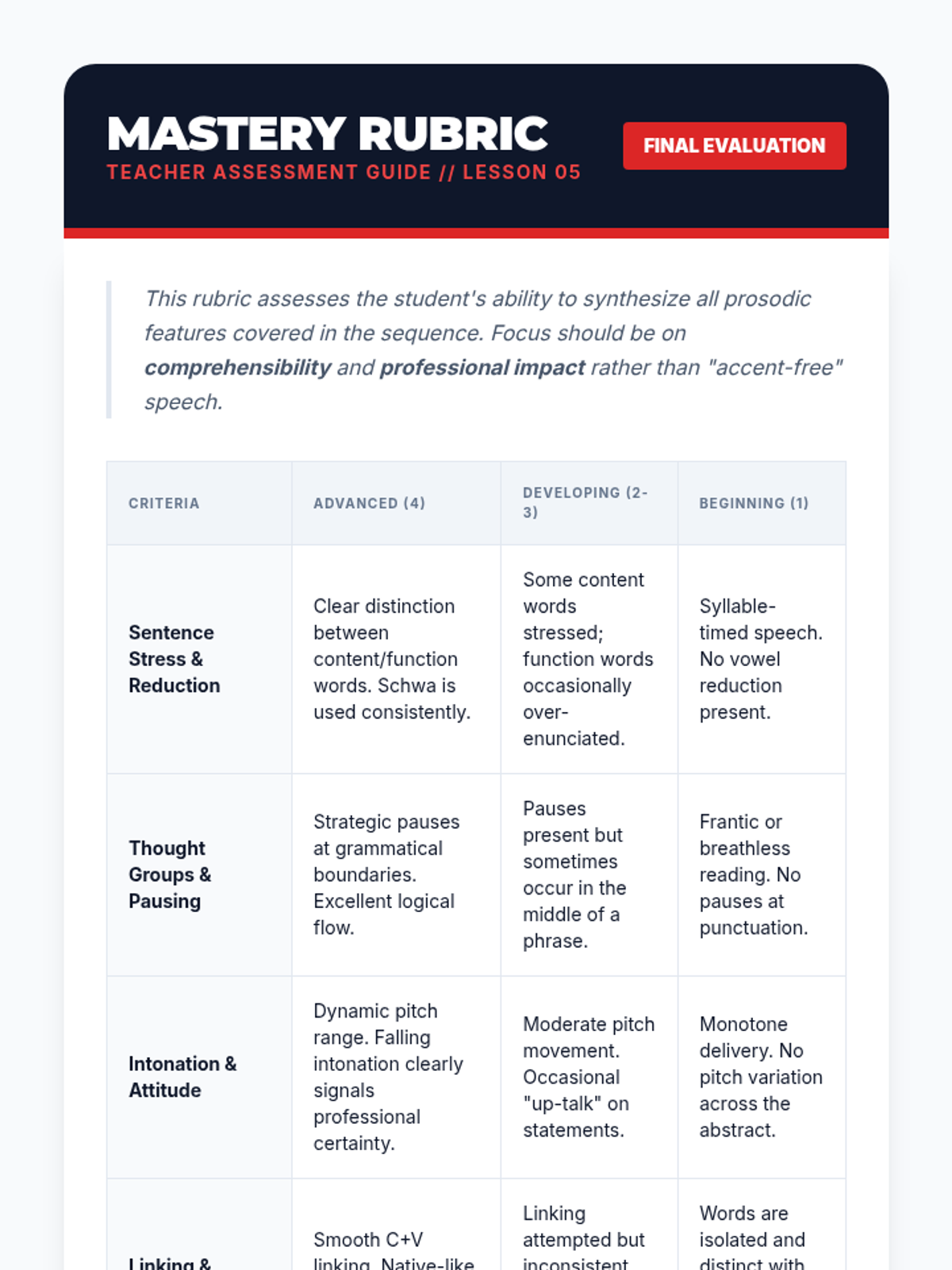 This sequence addresses the mechanical aspects of speaking that often hinder comprehensibility for intermediate graduate learners: stress, rhythm, and intonation. Students move from analyzing recorded speech to intense drilling of sentence stress, finally applying these skills to a recorded monologue to improve clarity and professional delivery.