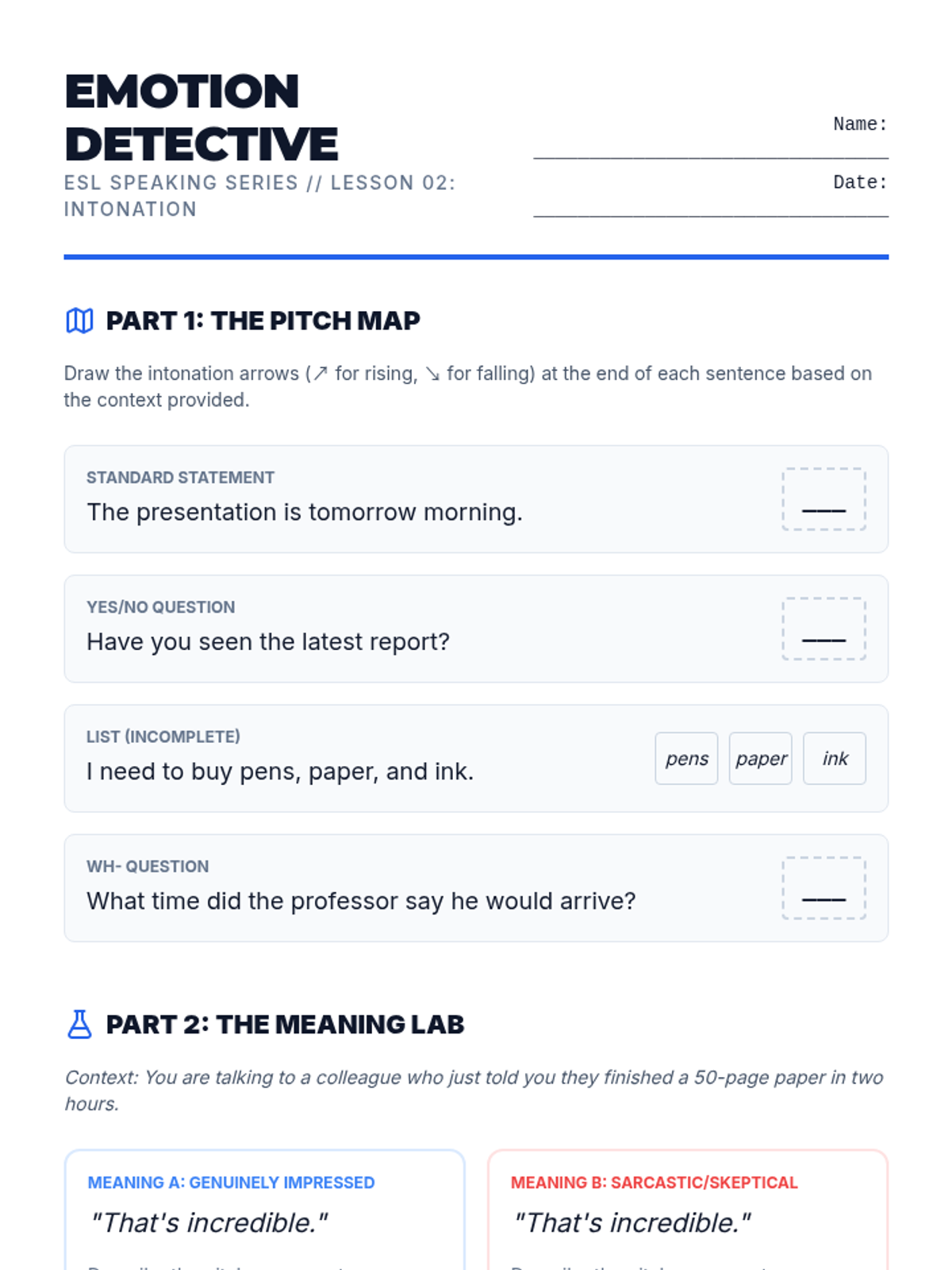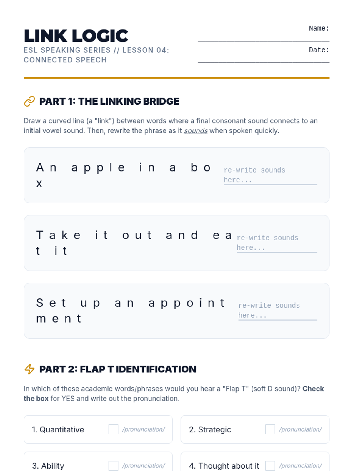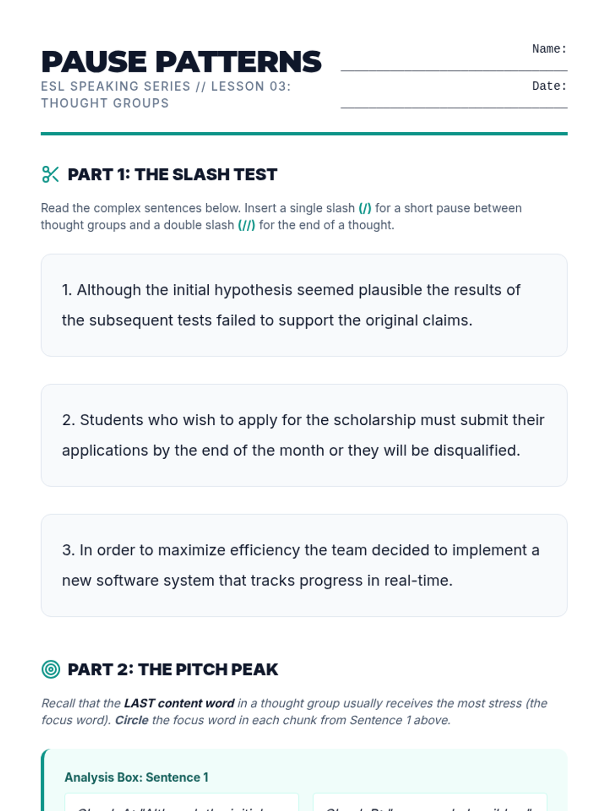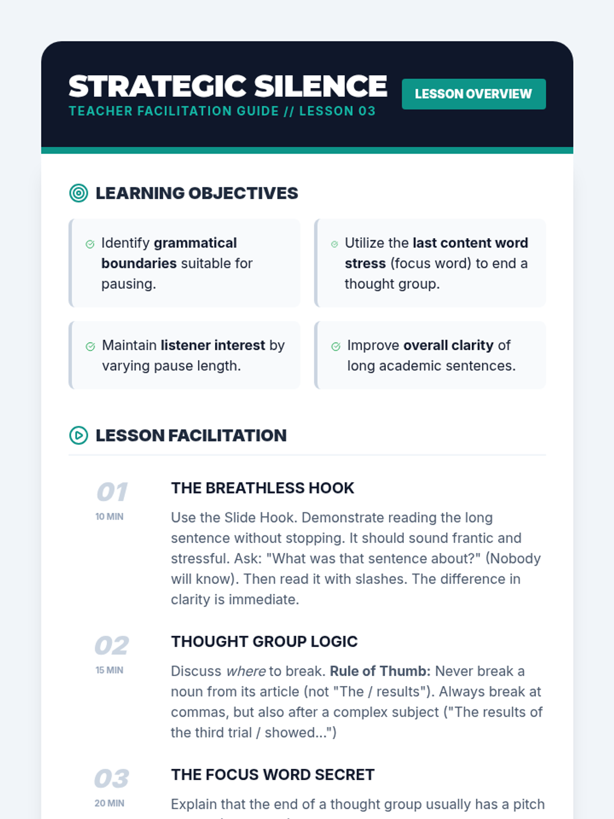 This sequence addresses the mechanical aspects of speaking that often hinder comprehensibility for intermediate graduate learners: stress, rhythm, and intonation. Students move from analyzing recorded speech to intense drilling of sentence stress, finally applying these skills to a recorded monologue to improve clarity and professional delivery.