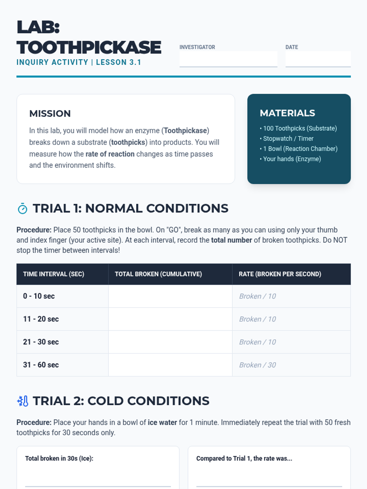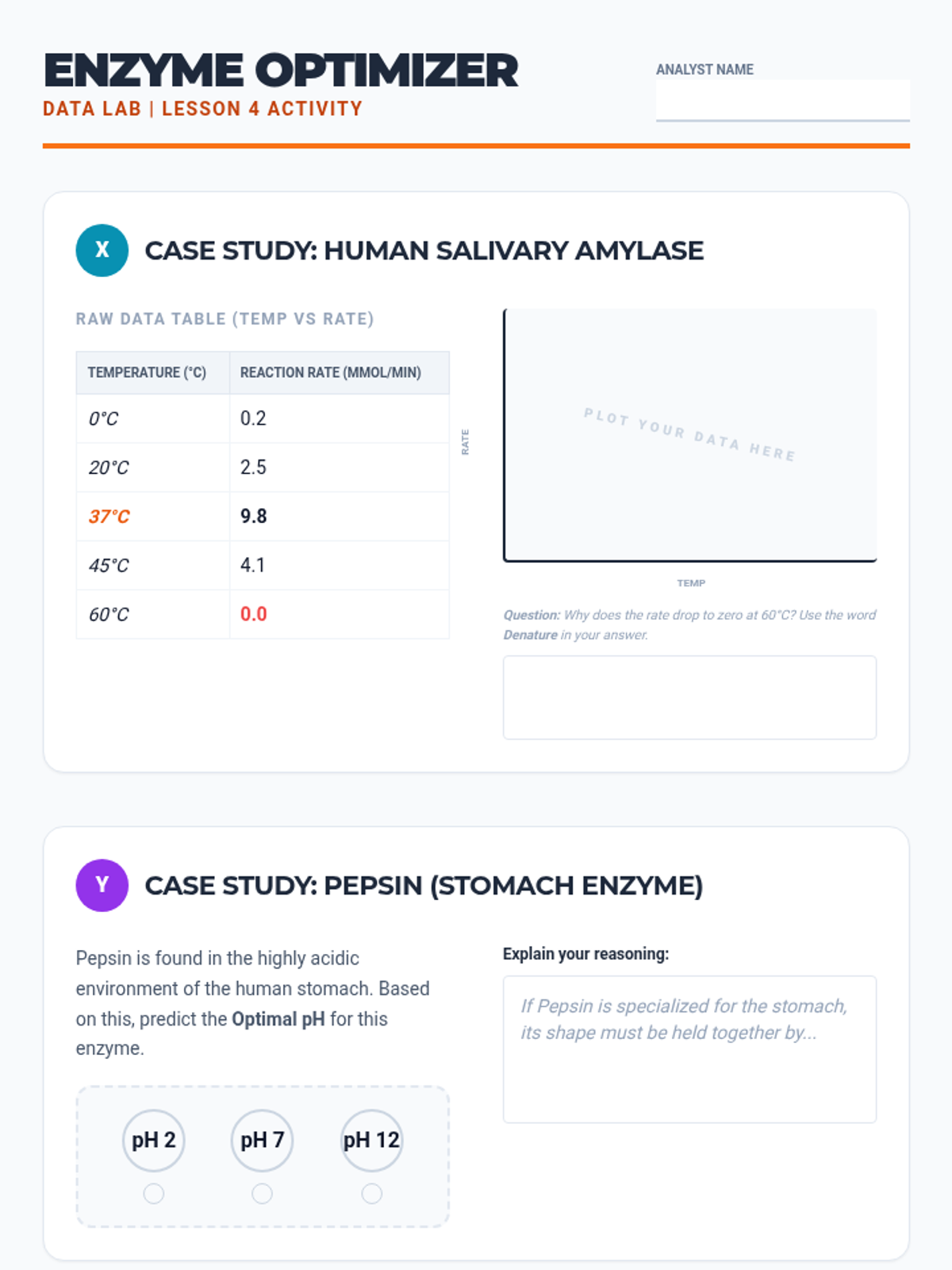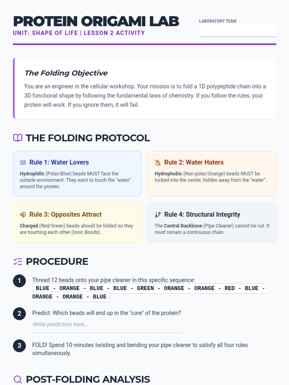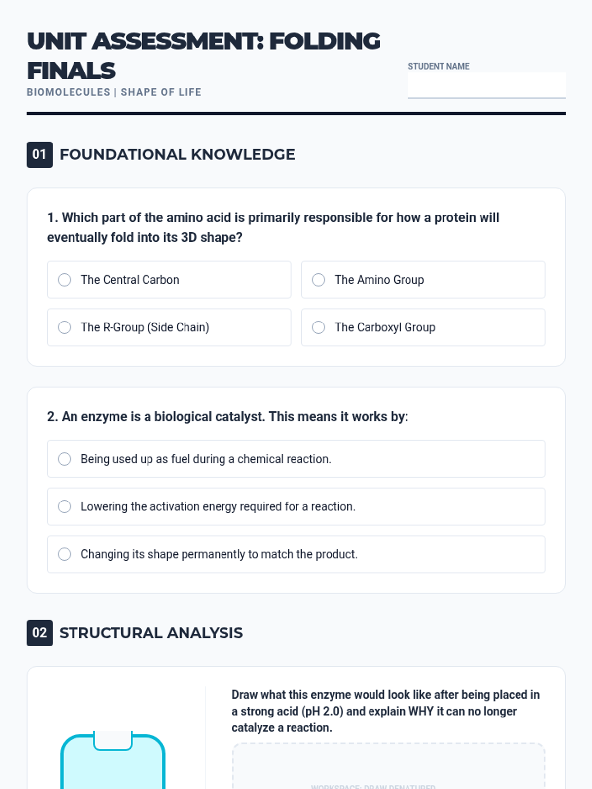 A comprehensive 5-lesson unit exploring the relationship between protein structure and function, from amino acid chains to enzymatic catalysis and denaturation.