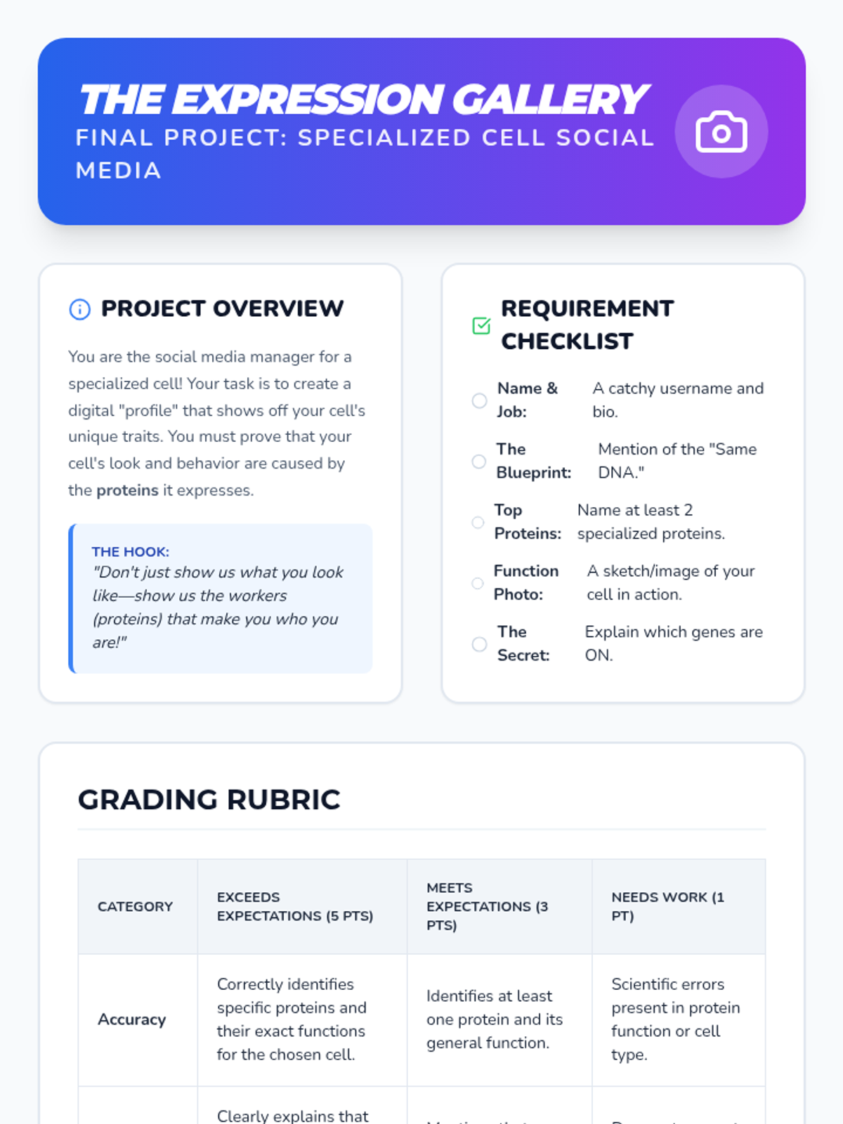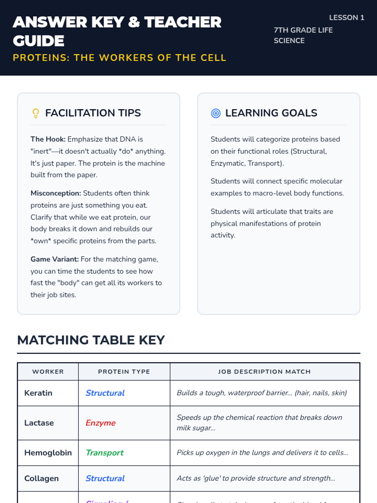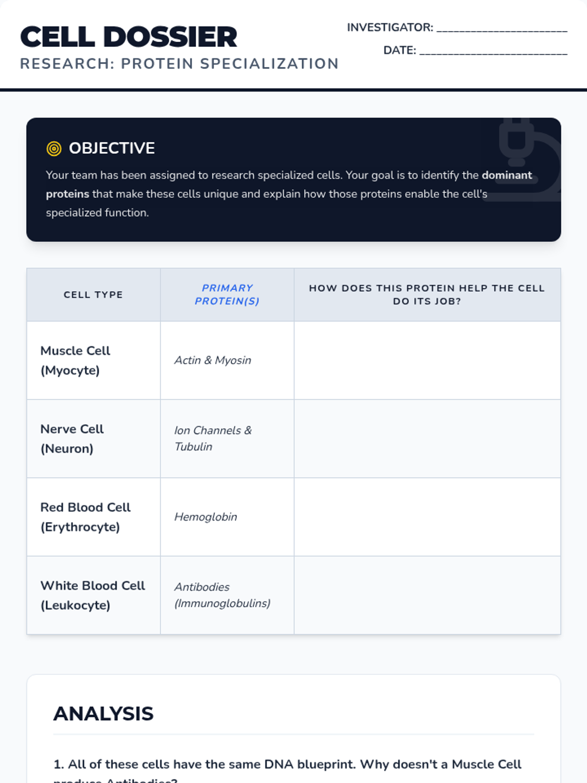 This sequence explores how genes act as instructions for building proteins, which are the functional 'workers' of the cell. Students will investigate protein diversity, gene regulation, and how specialized cells express specific proteins to perform unique roles in the body.