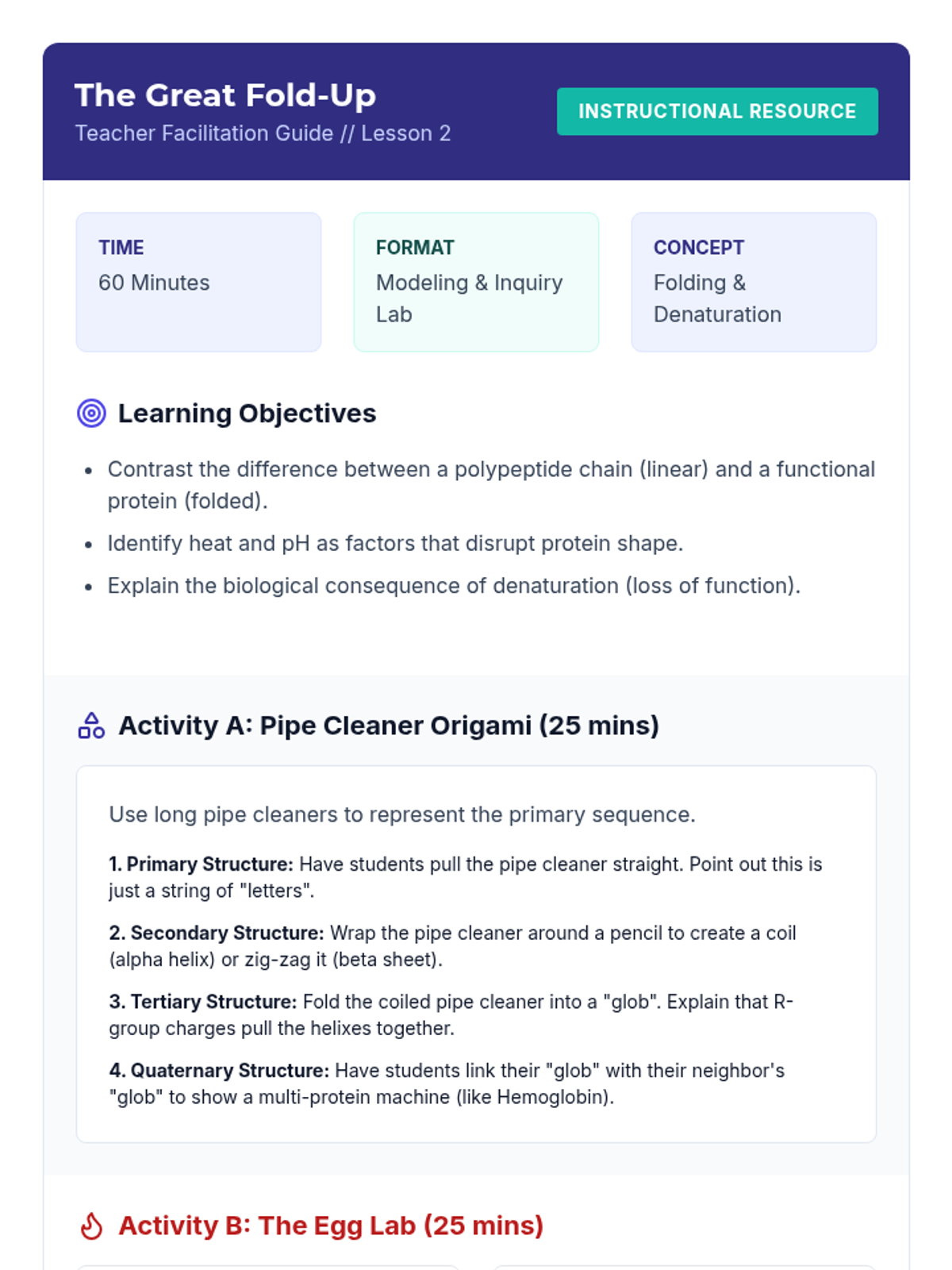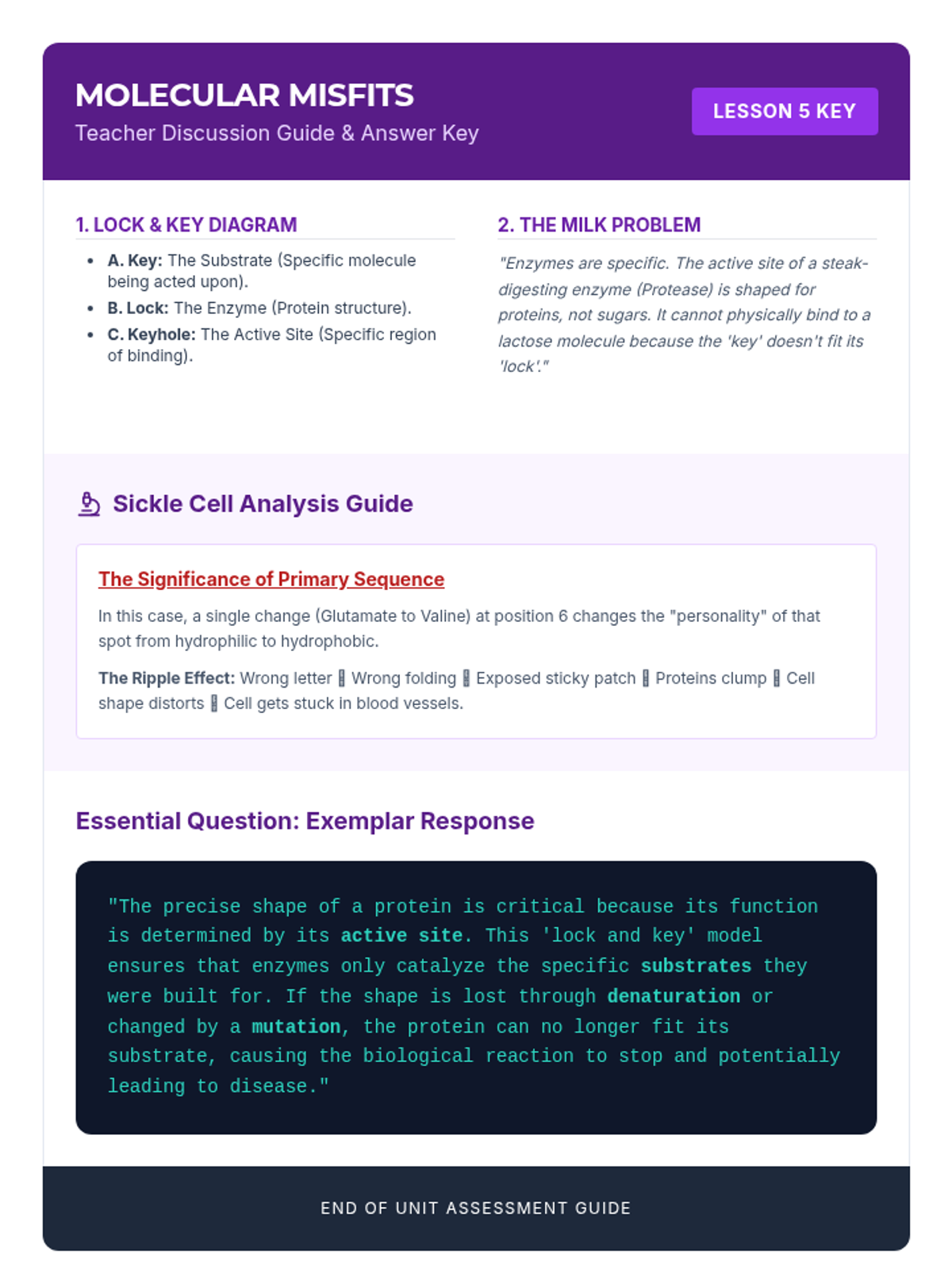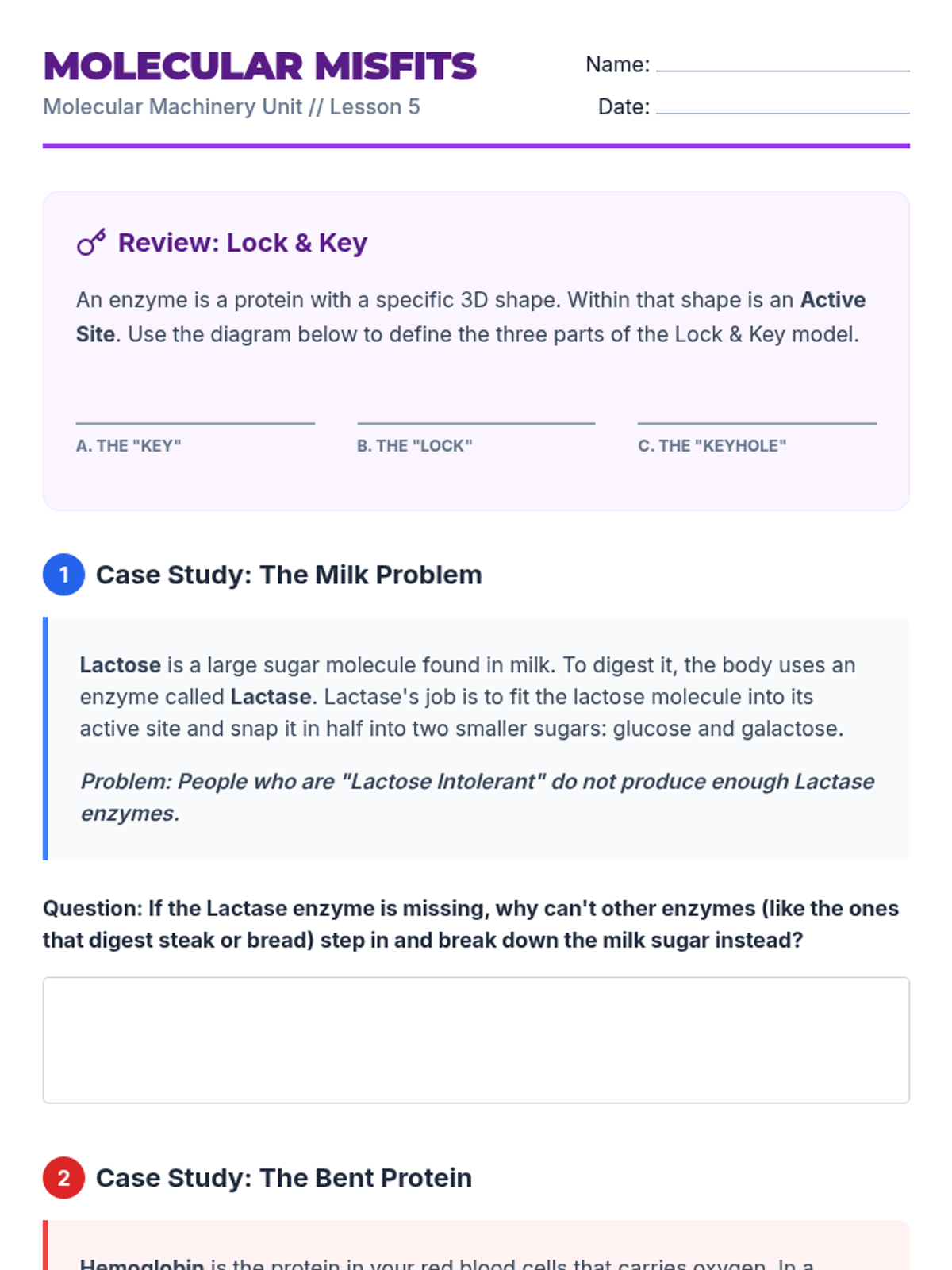 A comprehensive unit on the structural hierarchy of proteins and the functional role of enzymes. Students explore how molecular shape determines biological function through hands-on simulations, lab experiments, and case studies of human health.