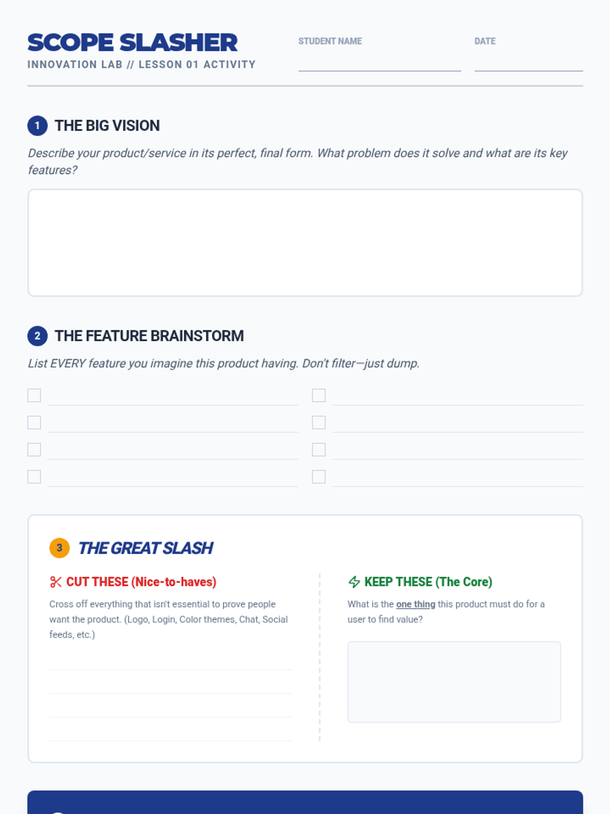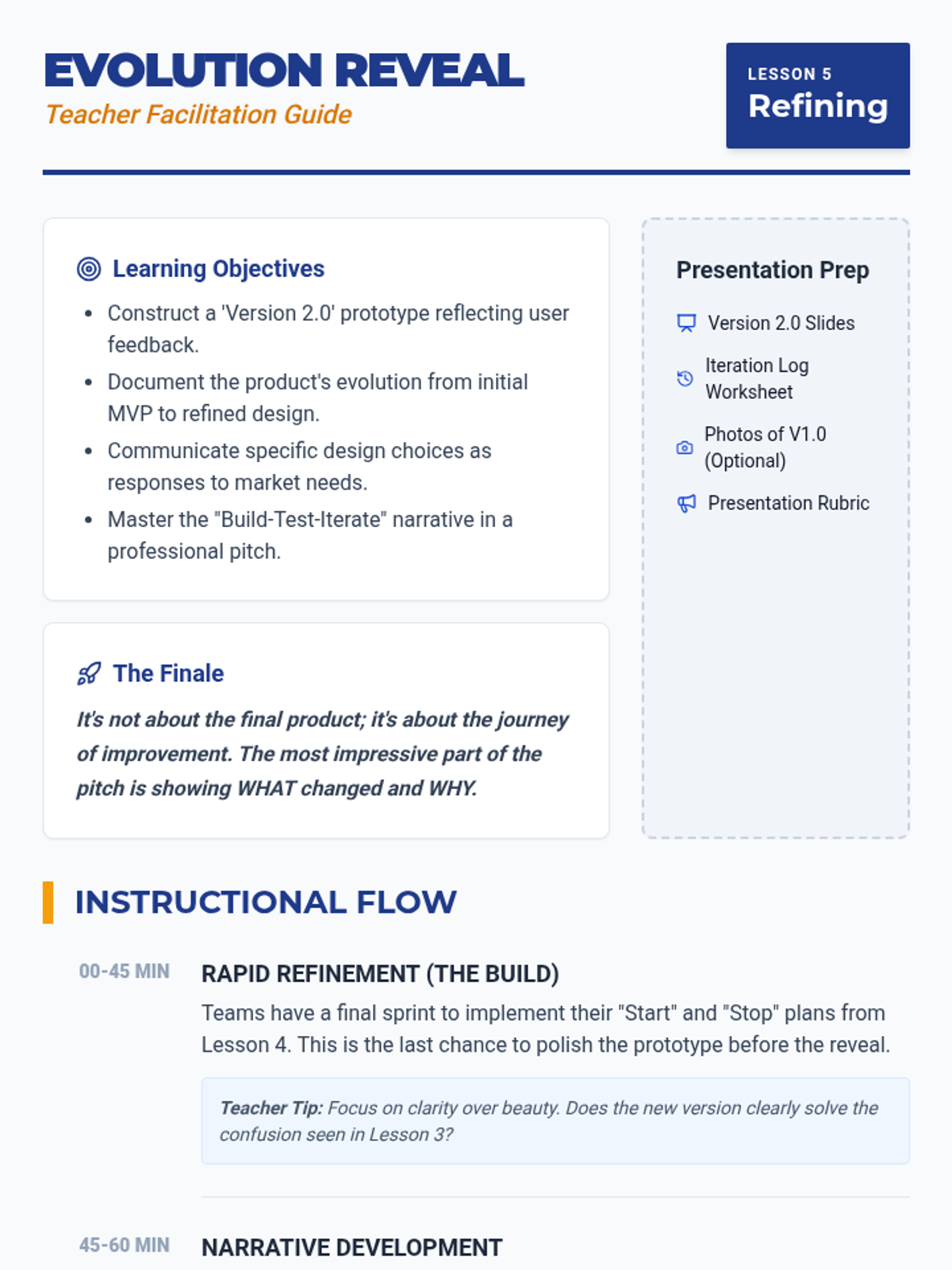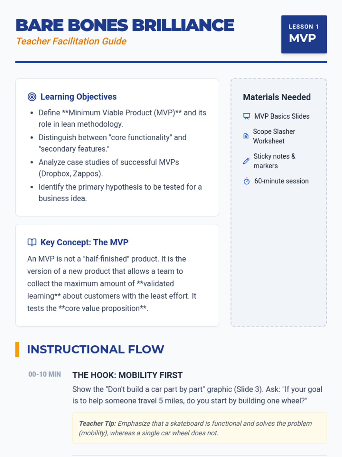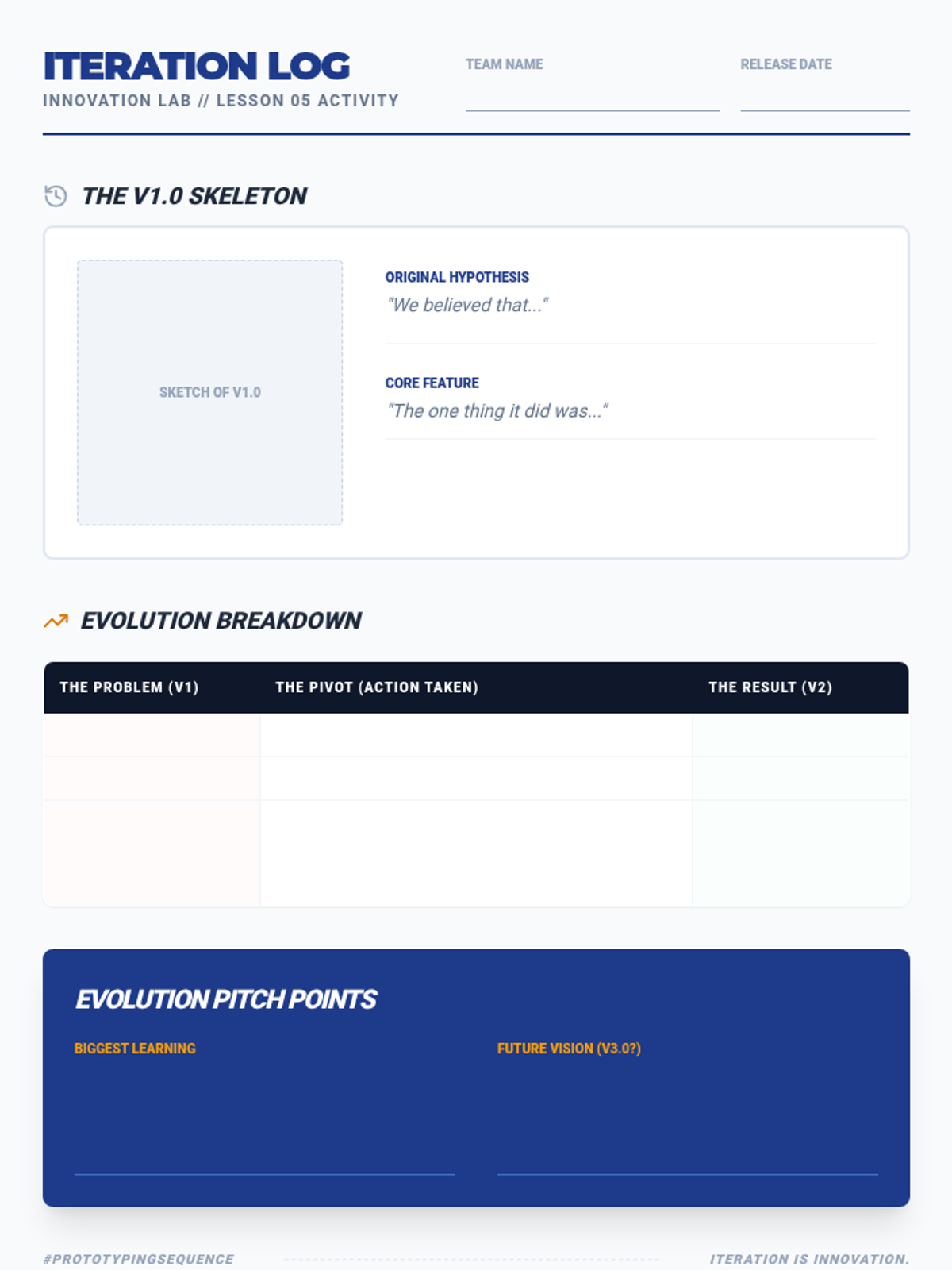 This hands-on sequence guides students through the cycle of building Minimum Viable Products (MVPs), testing them with users, and iterating based on feedback. Students move from theory to rapid prototyping, emphasizing the 'build-measure-learn' loop to develop tested products.