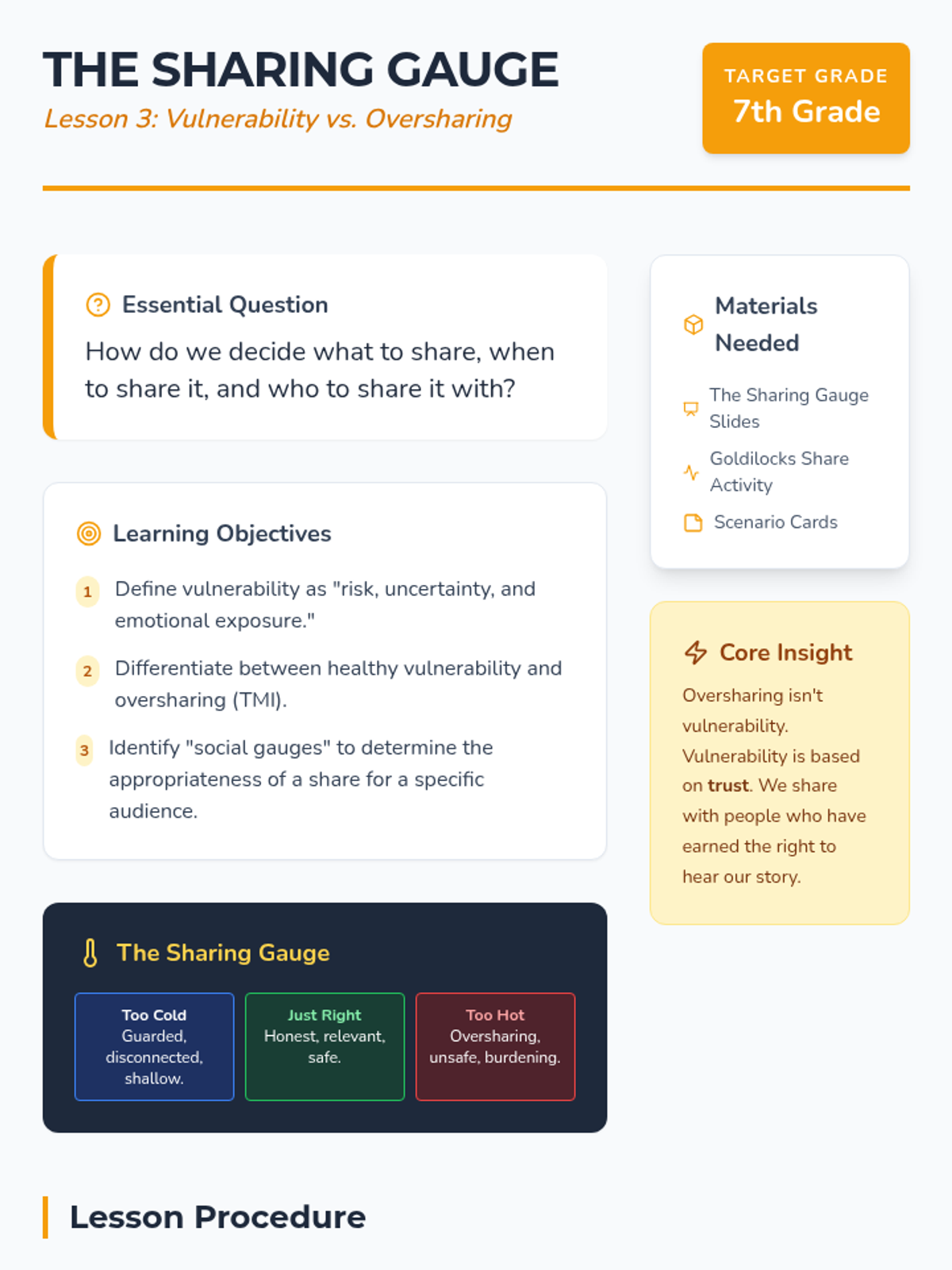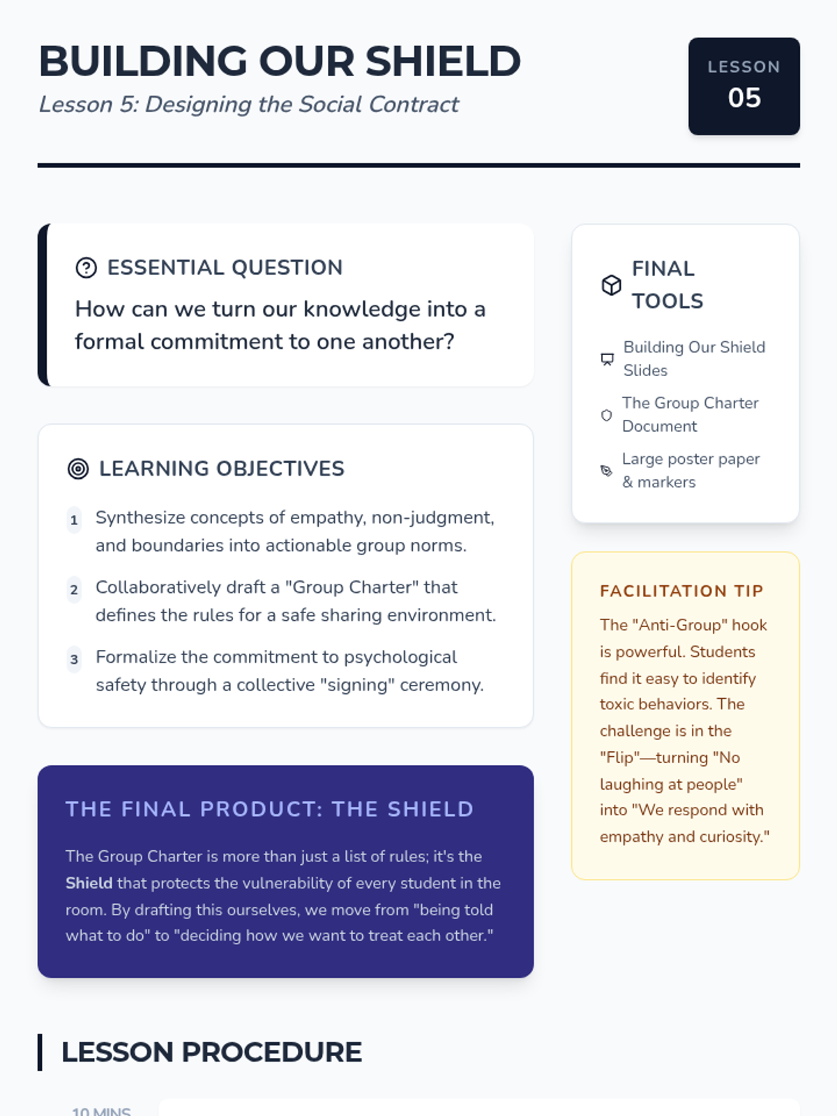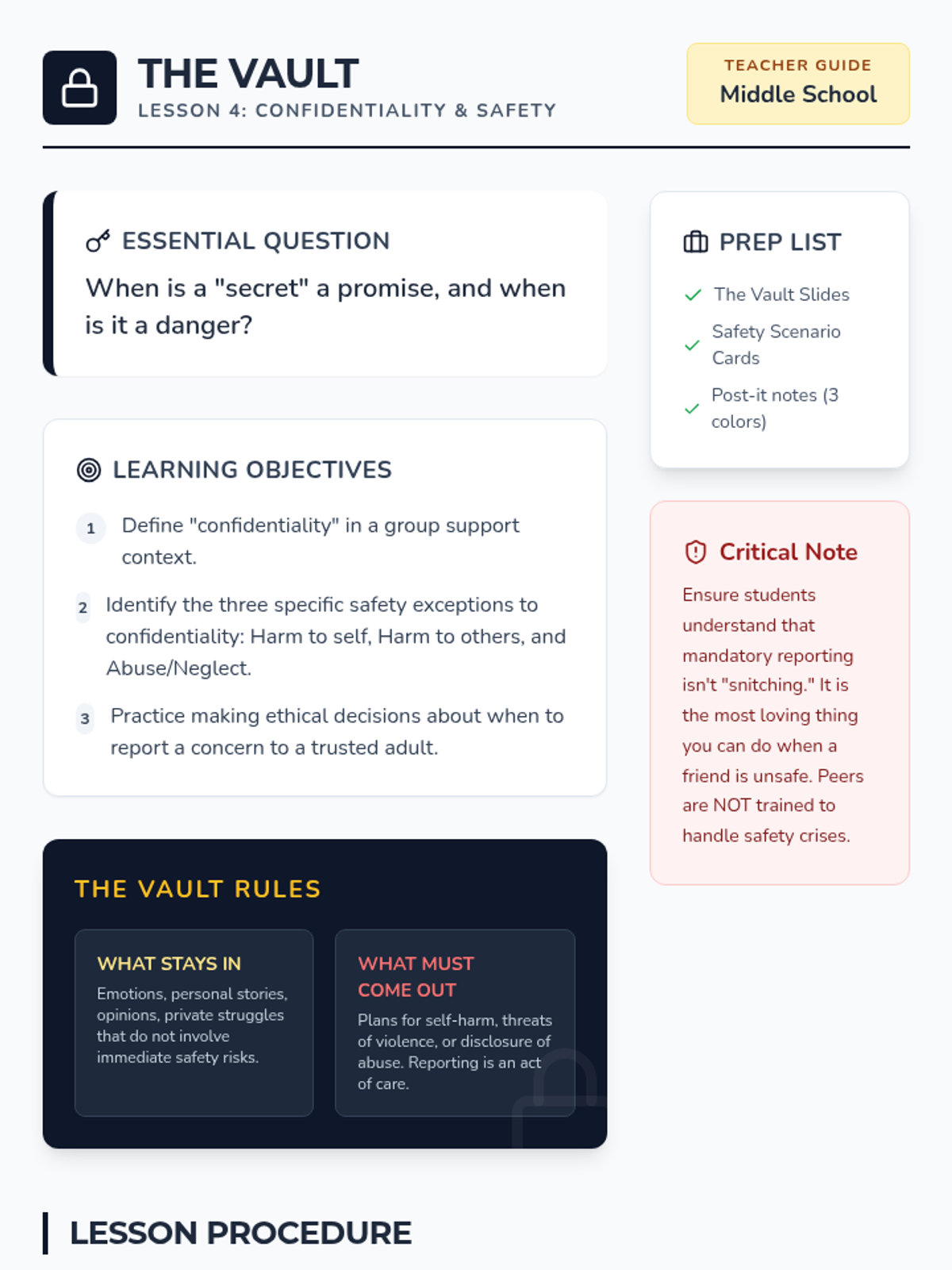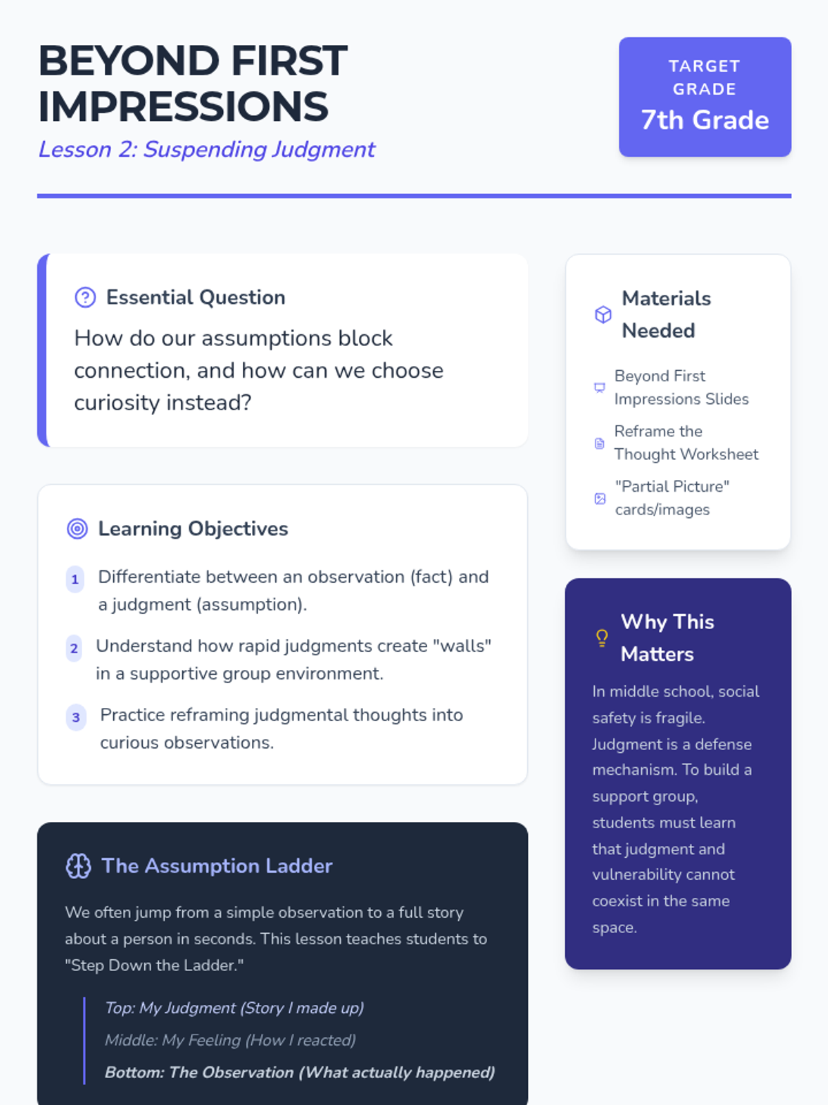 A 5-lesson sequence for 7th graders focused on creating a psychologically safe environment for group support. Students learn to distinguish empathy from sympathy, suspend judgment, set personal boundaries for sharing, and understand the ethical rules of confidentiality and mandatory reporting.