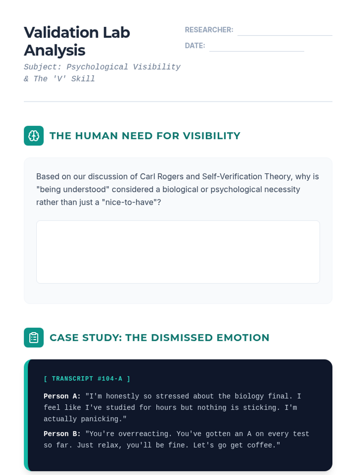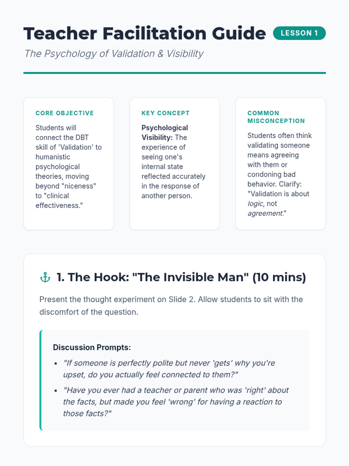 This 12th-grade sequence explores the psychological and neuroscientific foundations of the DBT 'GIVE' skills for interpersonal effectiveness. Students investigate validation, the neuroscience of threat and safety in communication, the sociology of humor, and the ethics of strategic connection.
