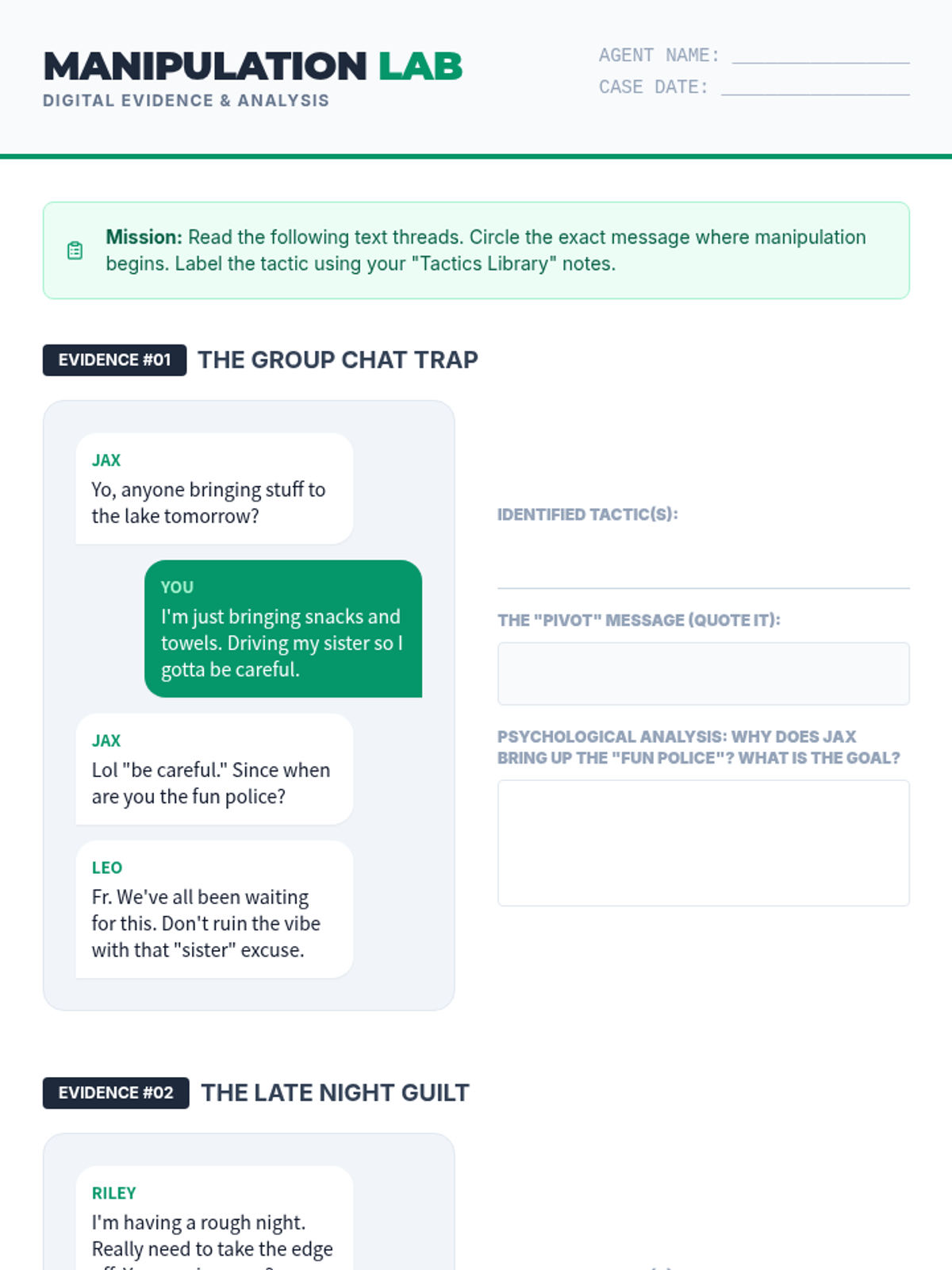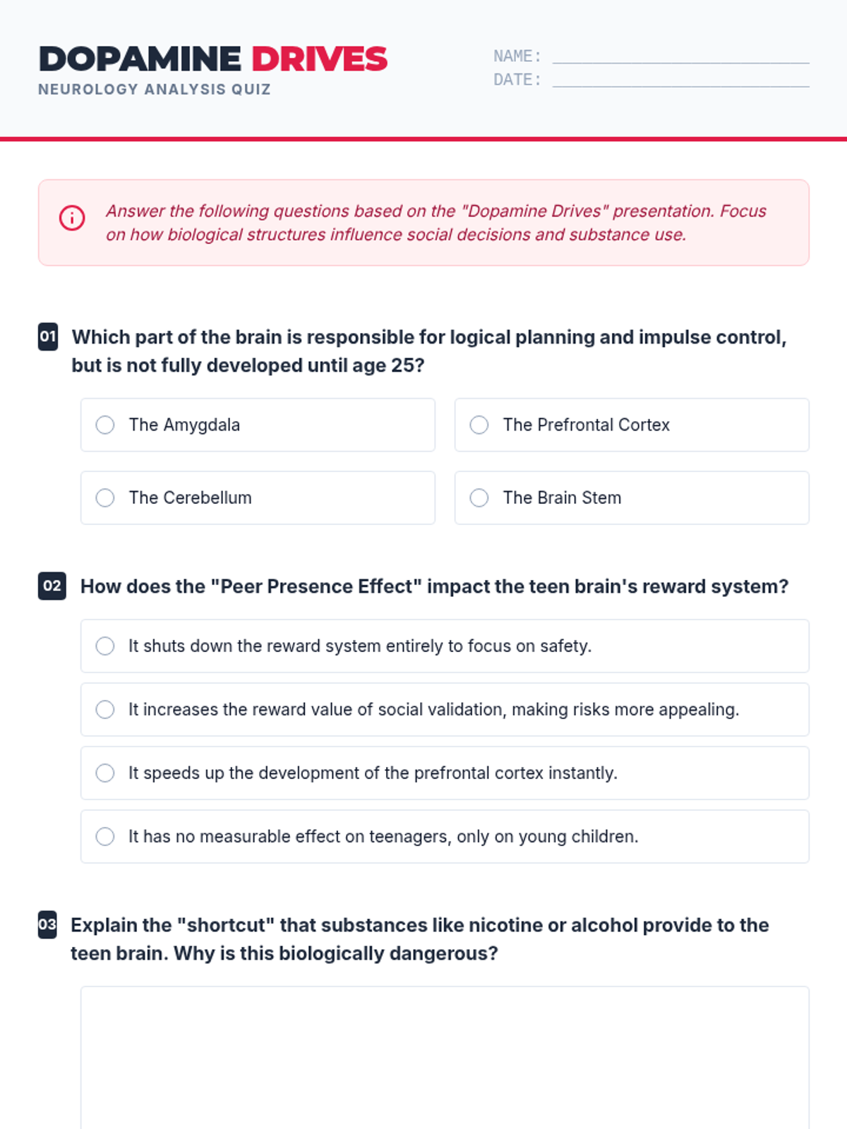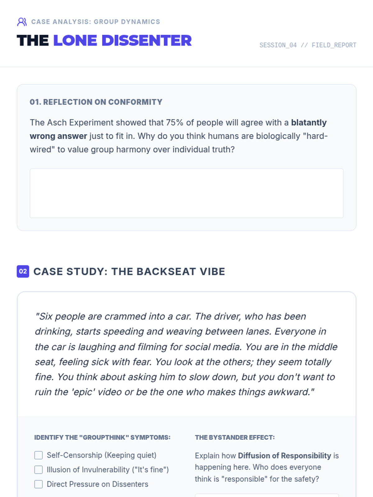 A high-level psychological and sociological exploration of peer influence, group dynamics, and the neuroscience of adolescent decision-making. Students move beyond refusal scripts to analyze the mechanics of manipulation and groupthink, culminating in a personalized resistance strategy.