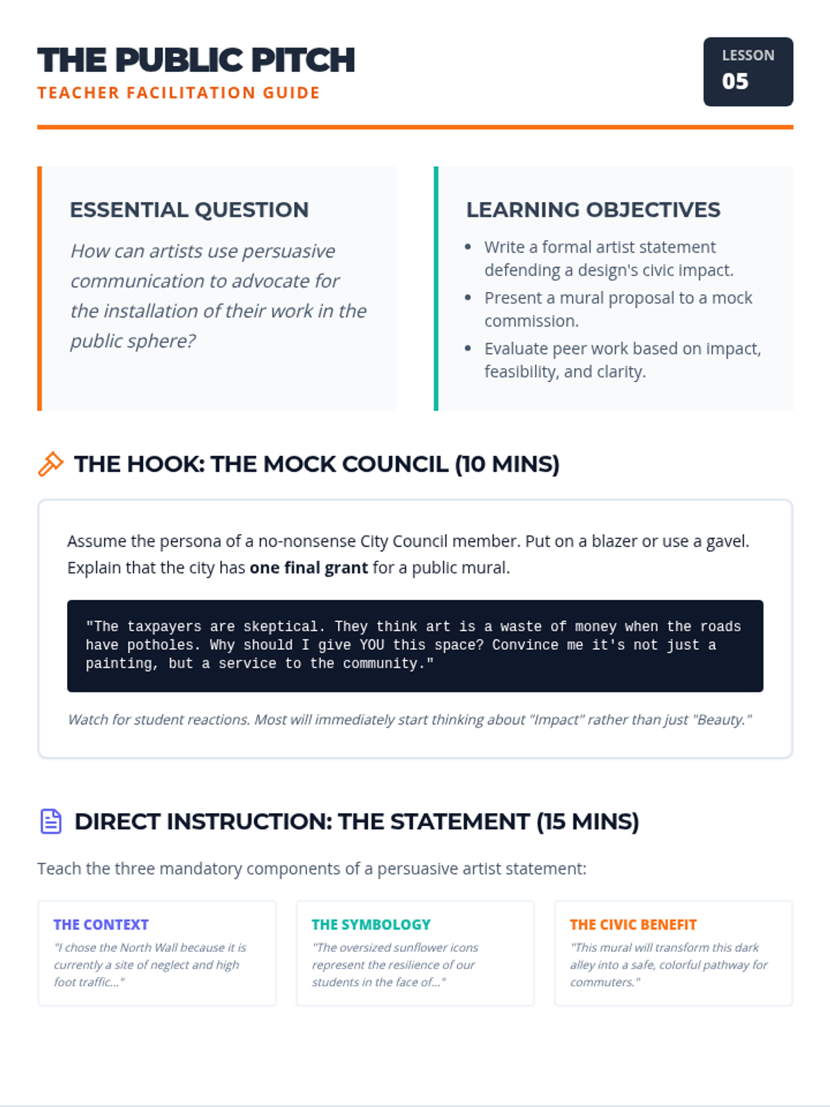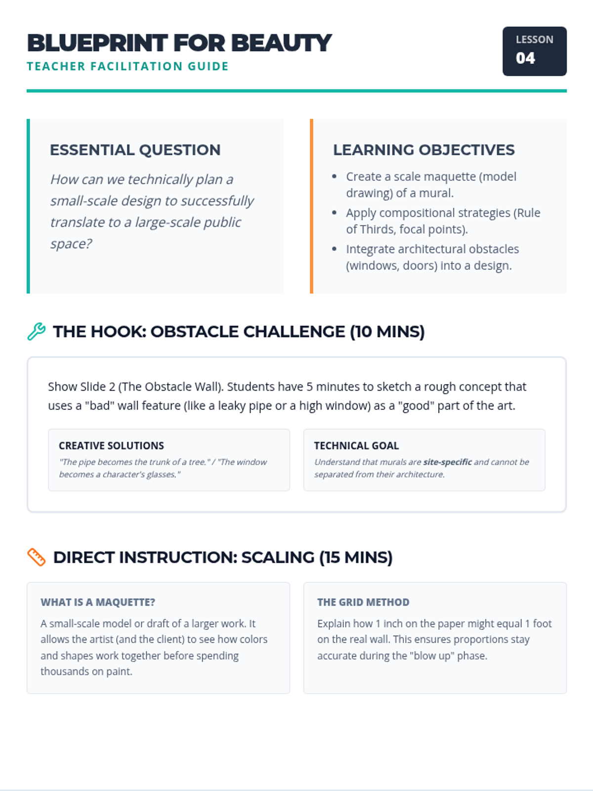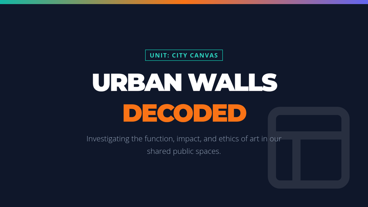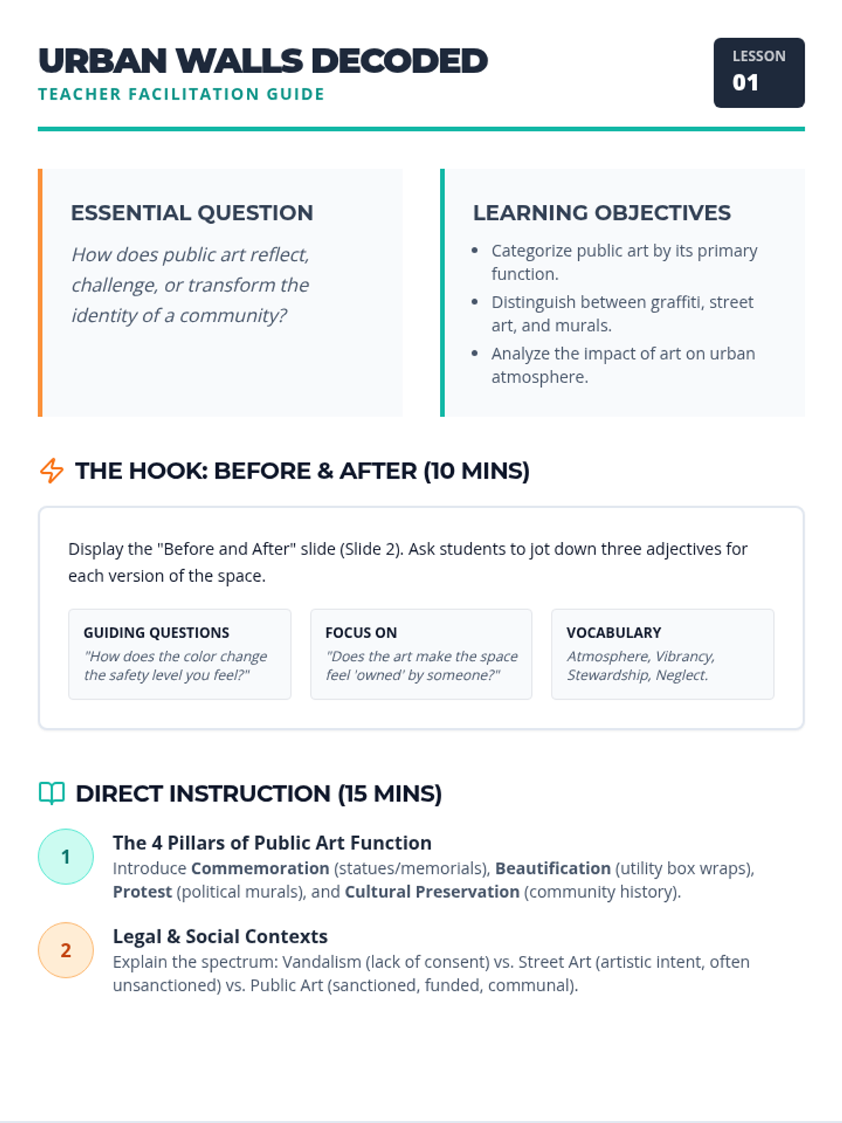 This sequence guides 8th-grade students through the world of public art, from analyzing its functions and cultural symbolism to designing their own scale mural proposals that address community social issues. Students will transition from art critics to civic-minded designers, learning how visual narratives can transform urban spaces.