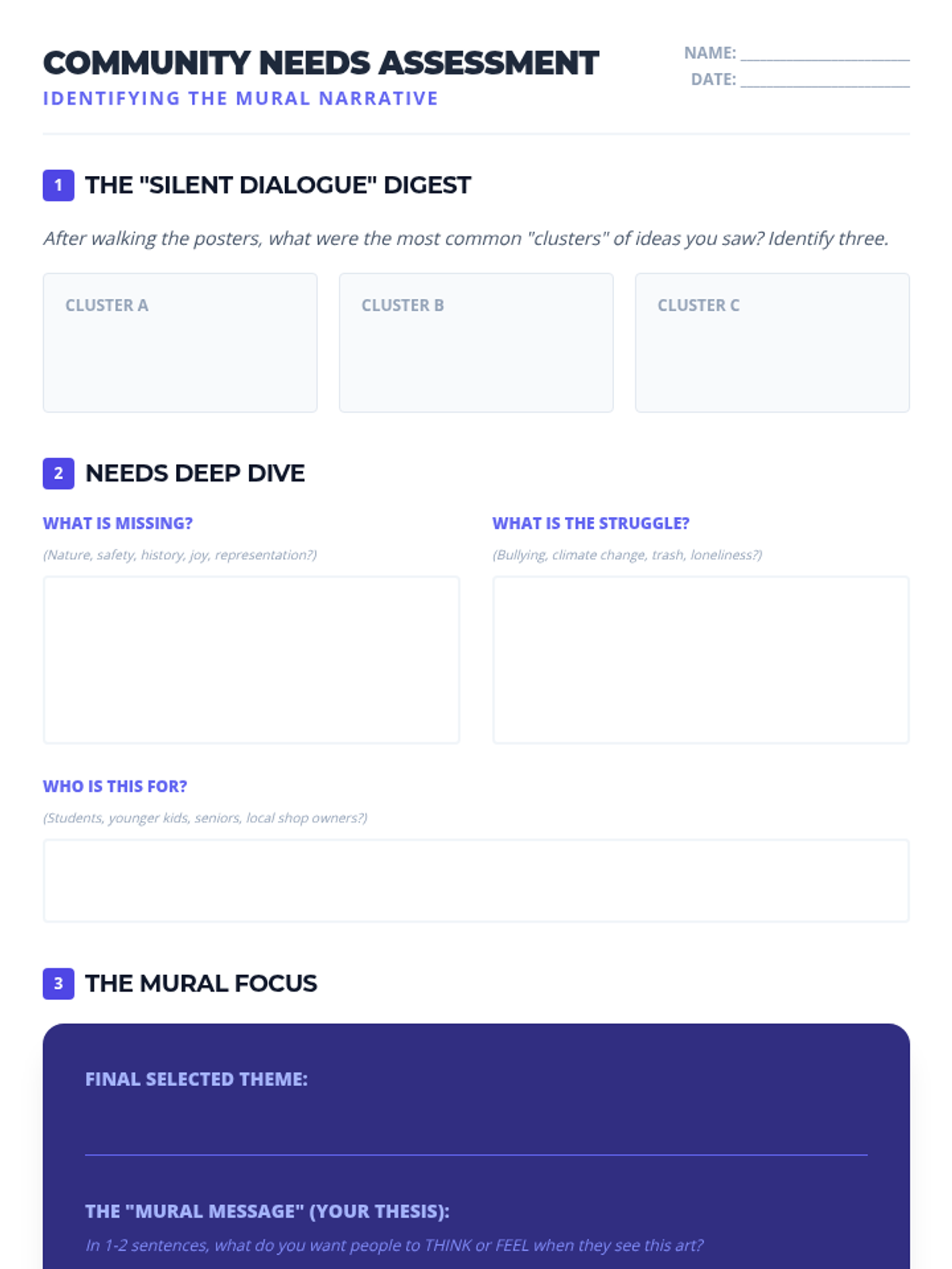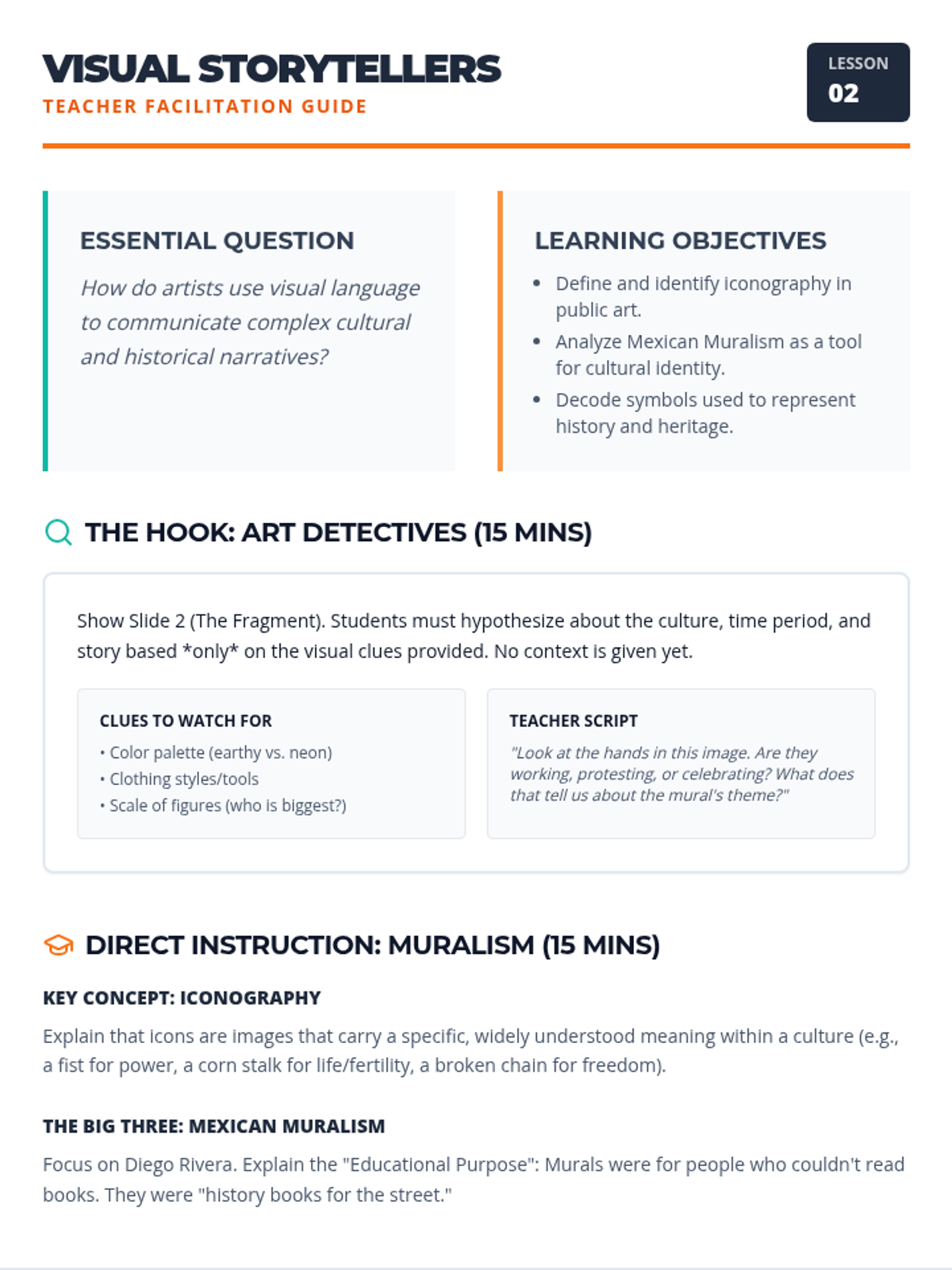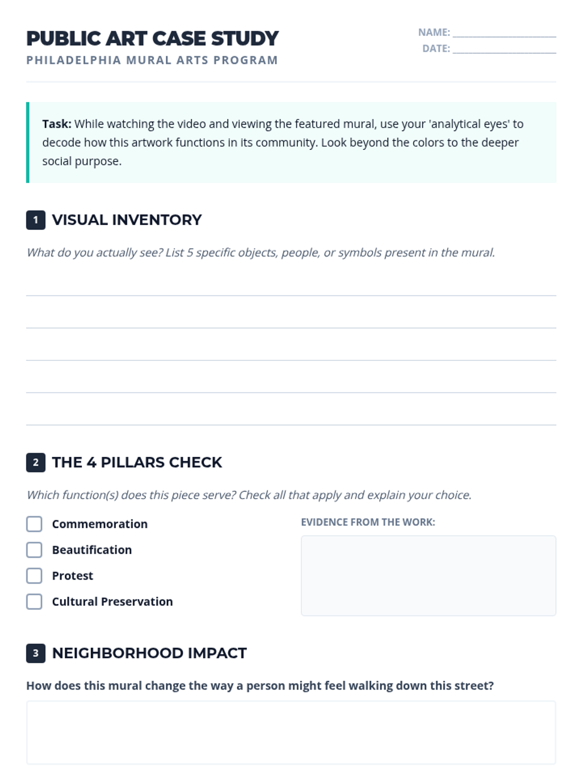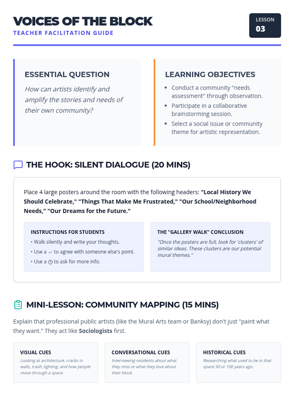 This sequence guides 8th-grade students through the world of public art, from analyzing its functions and cultural symbolism to designing their own scale mural proposals that address community social issues. Students will transition from art critics to civic-minded designers, learning how visual narratives can transform urban spaces.