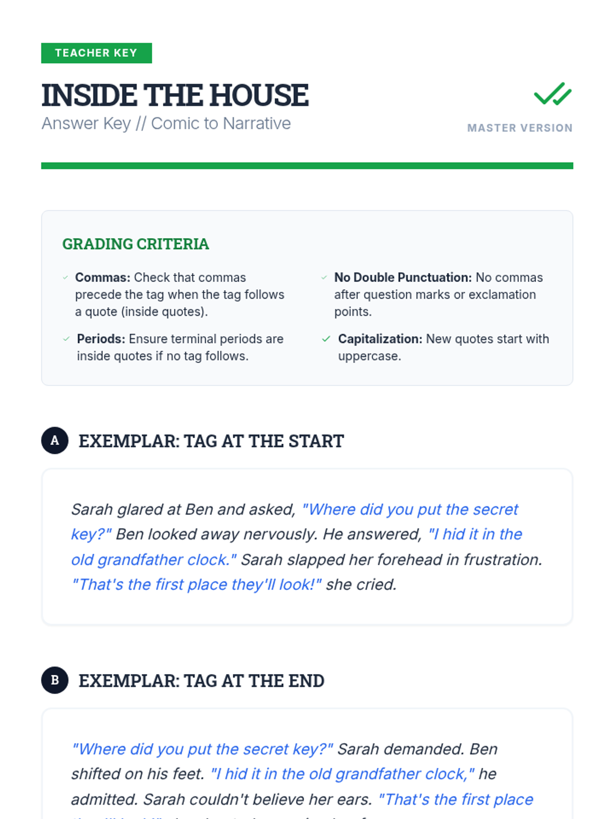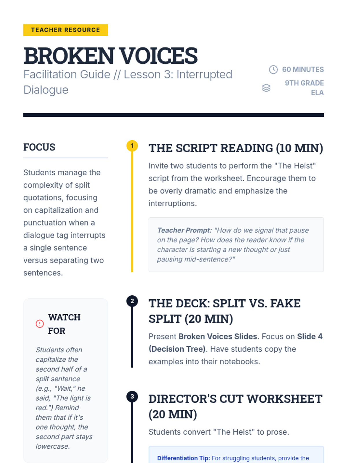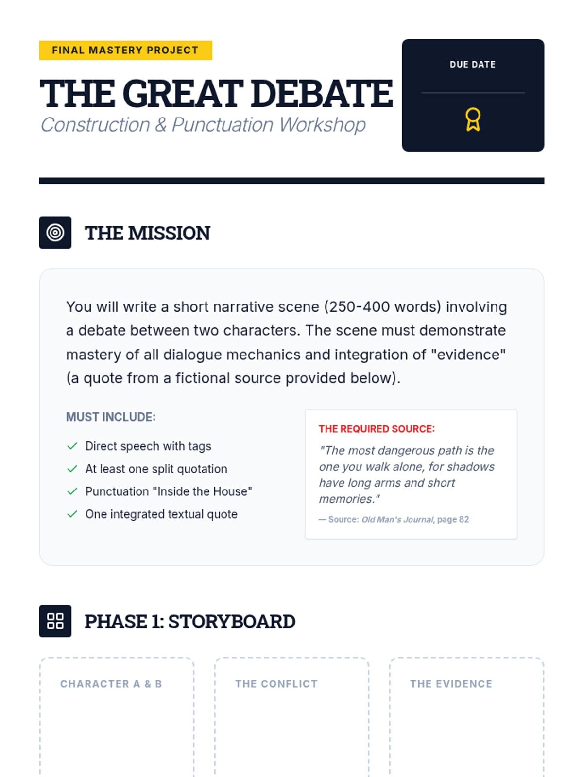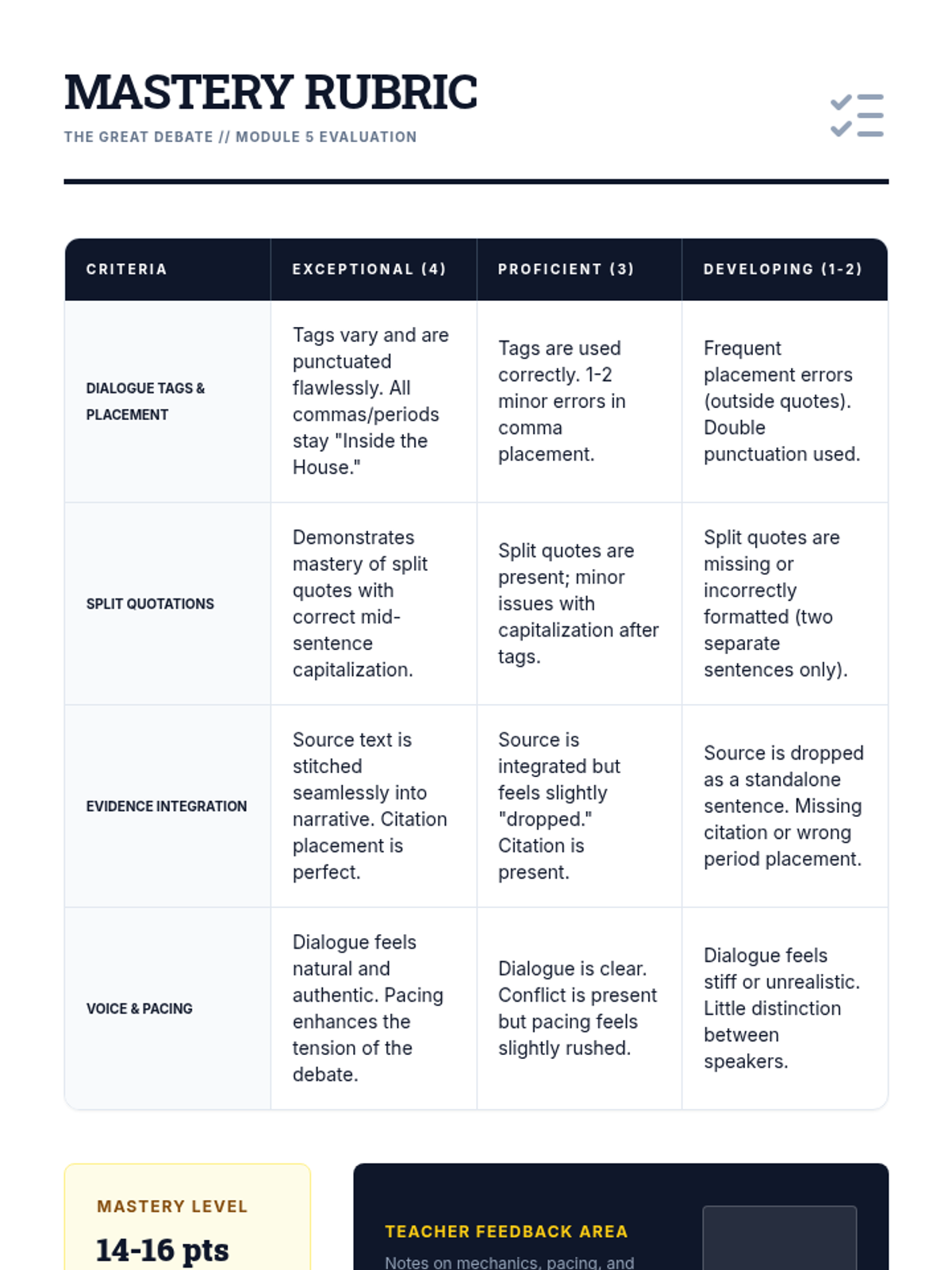 A comprehensive 9th-grade grammar unit focusing on the mechanics of dialogue and academic citations. Students move from basic direct speech to complex interrupted dialogue and formal evidence integration through creative writing and analytical exercises.