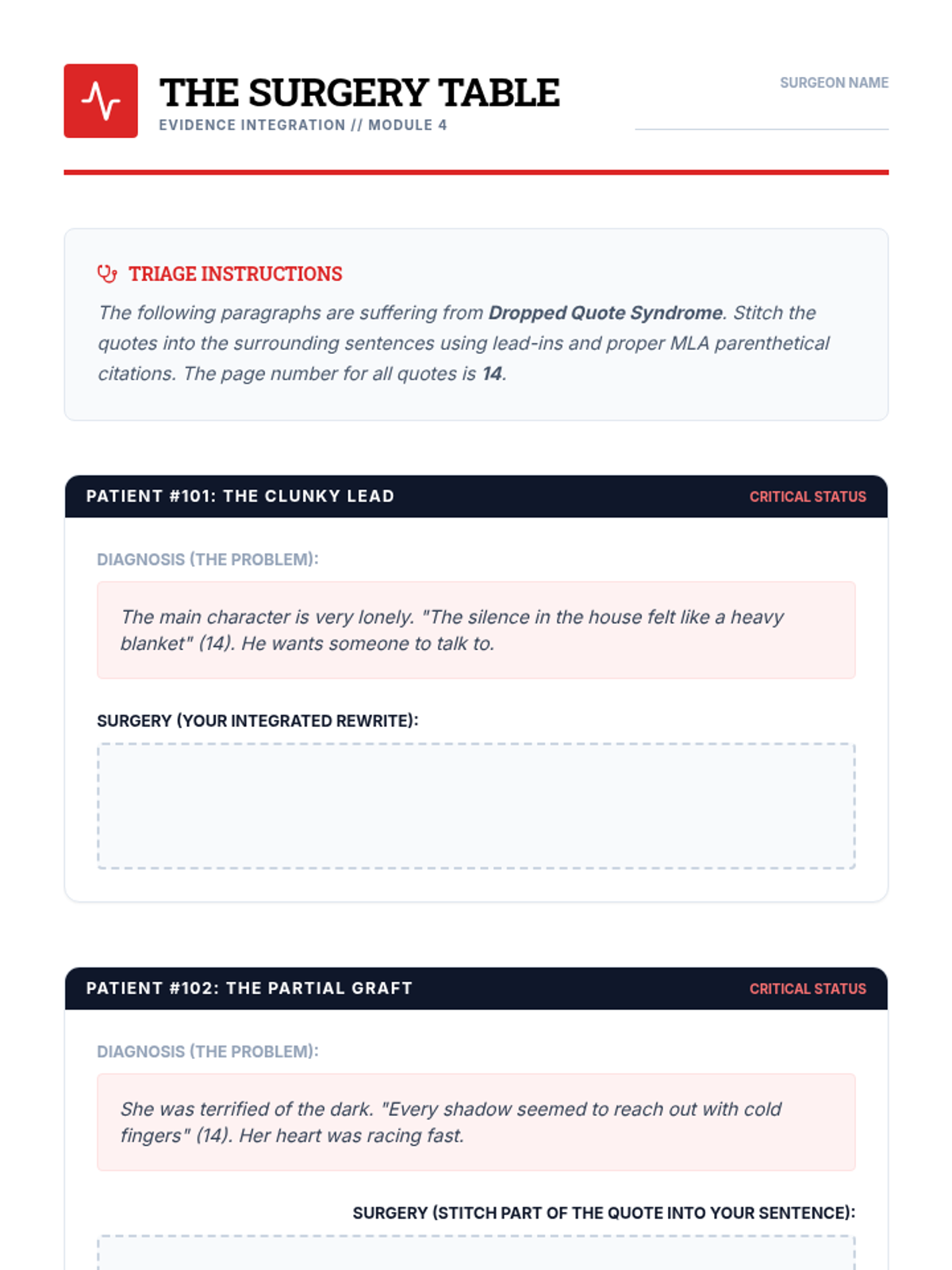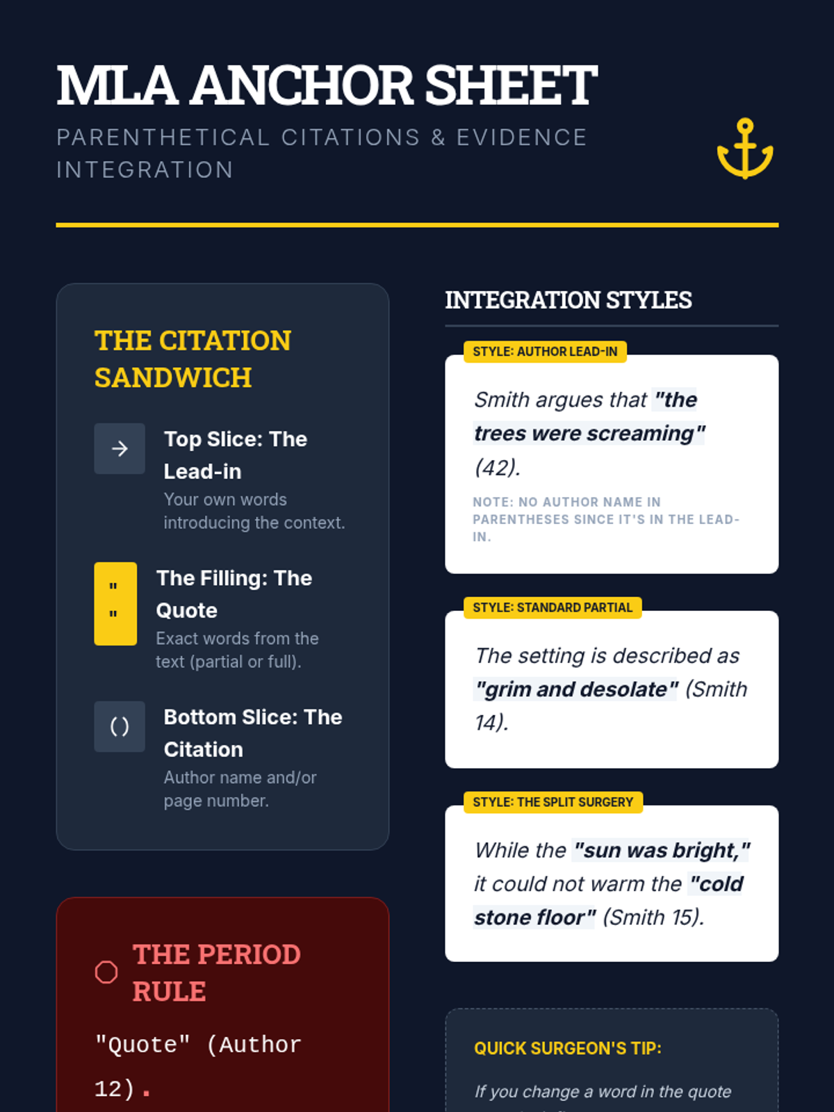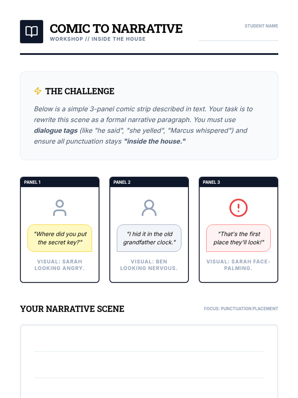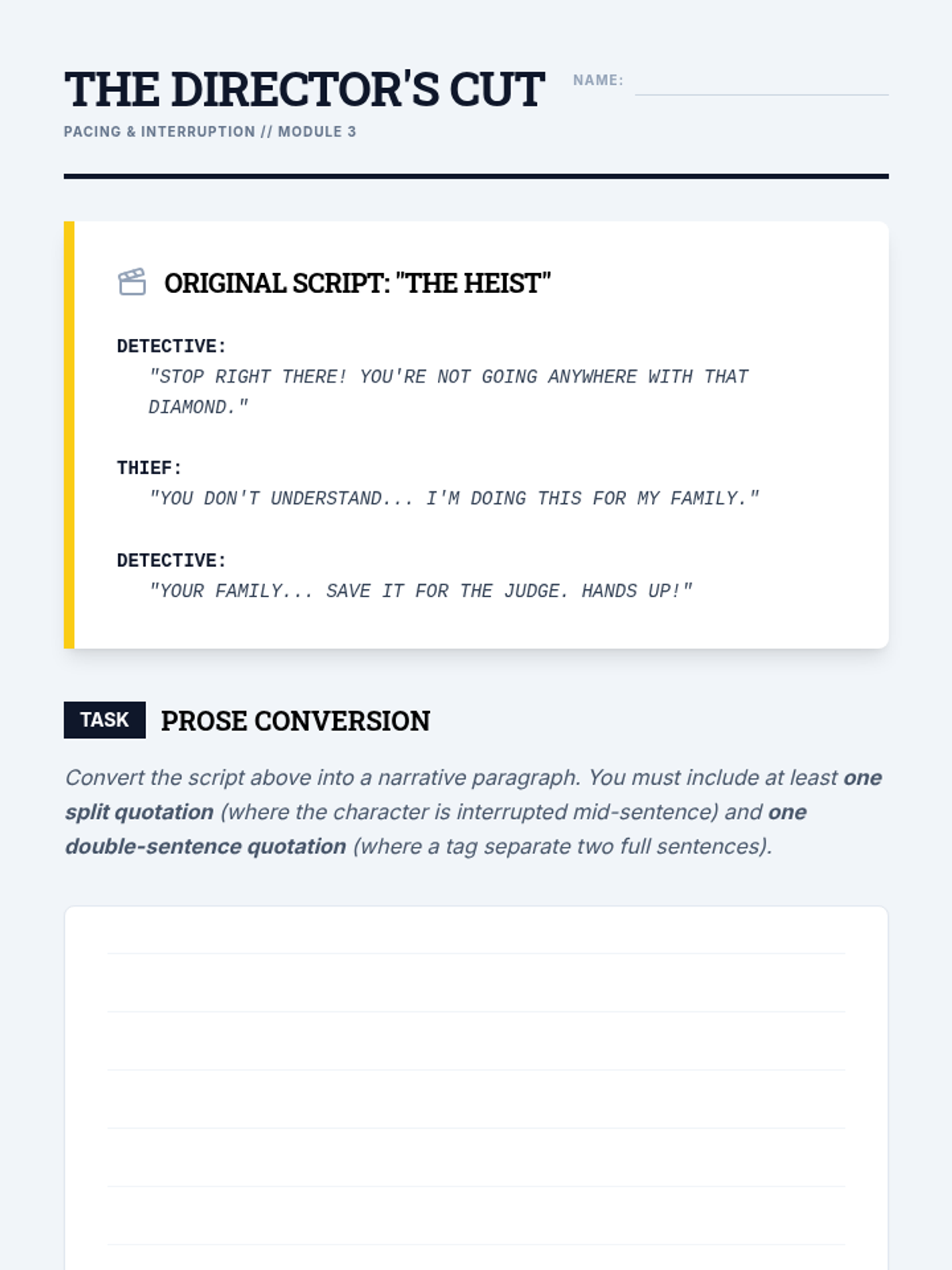 A comprehensive 9th-grade grammar unit focusing on the mechanics of dialogue and academic citations. Students move from basic direct speech to complex interrupted dialogue and formal evidence integration through creative writing and analytical exercises.