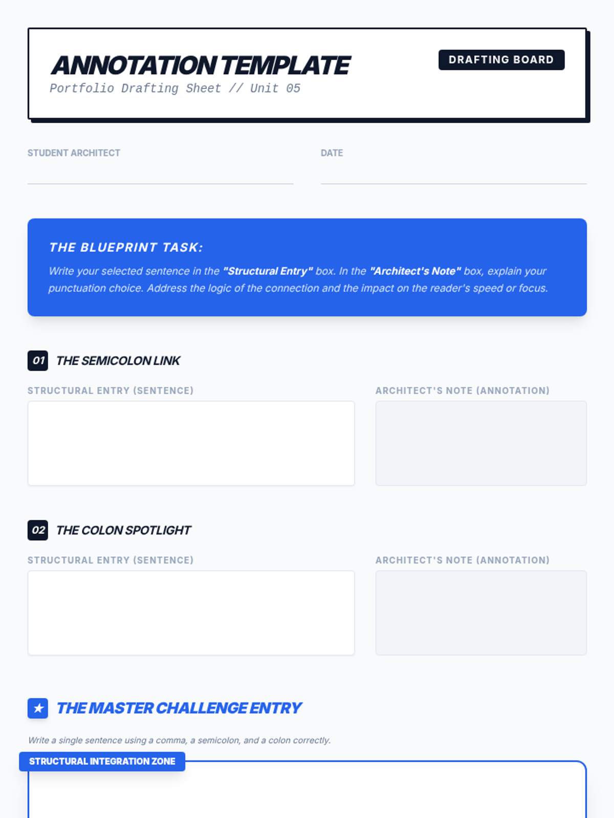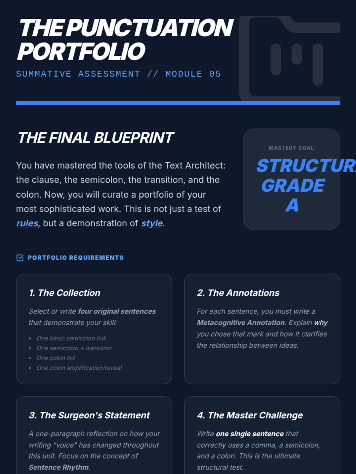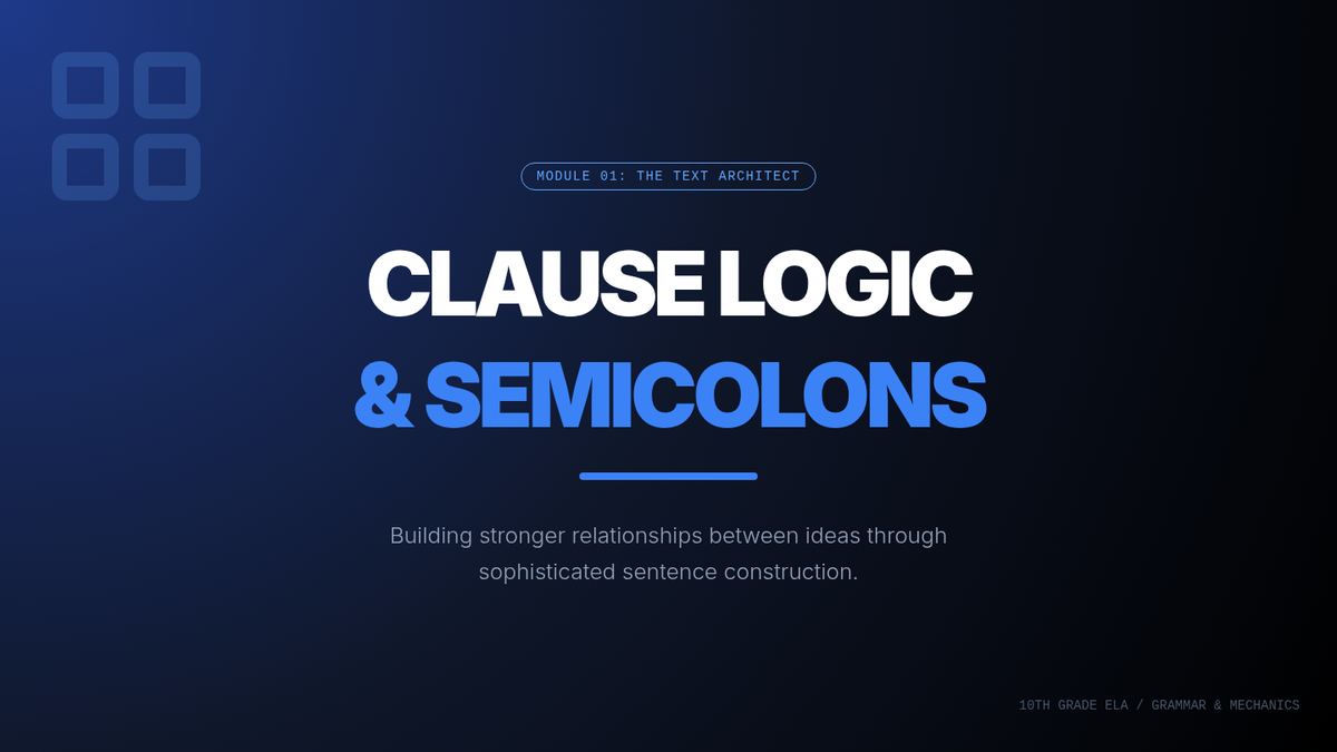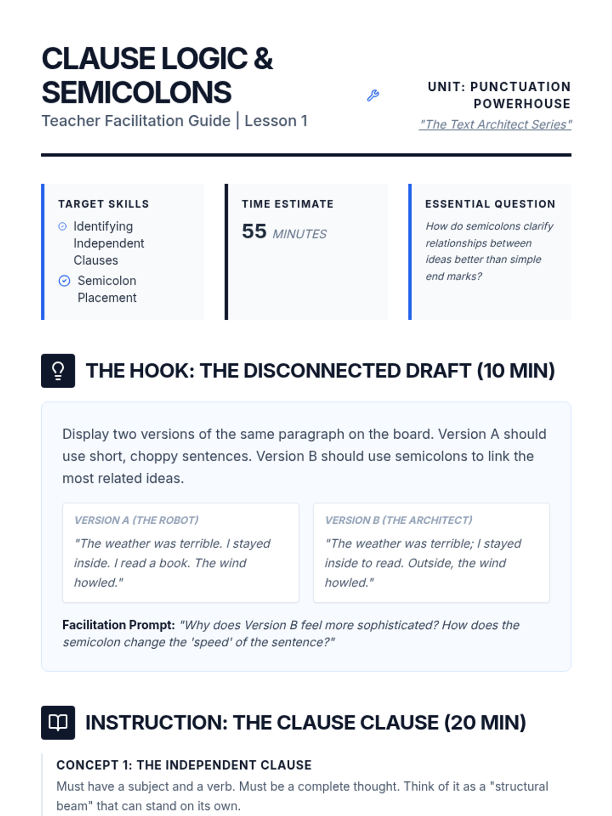 A comprehensive 10th-grade ELA unit focusing on the sophisticated use of semicolons and colons to enhance sentence variety and clarity. Students progress from clause basics to complex stylistic revision.
