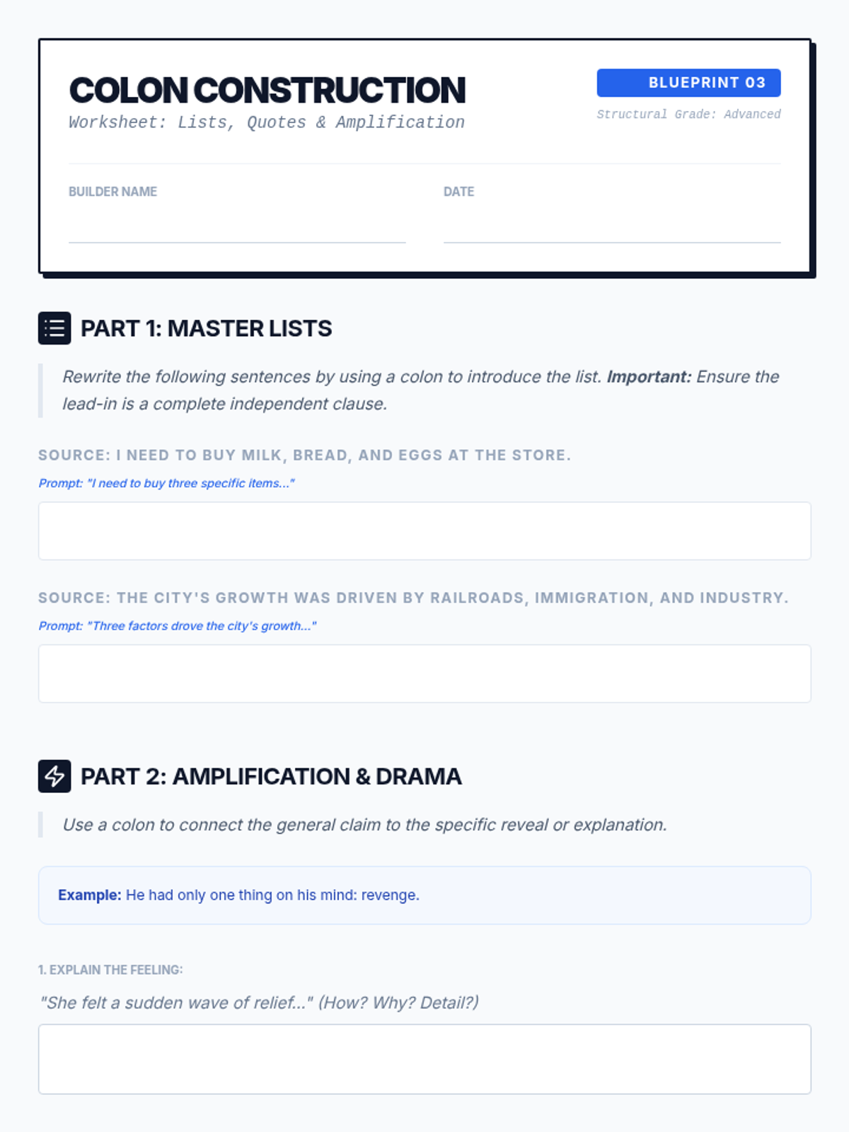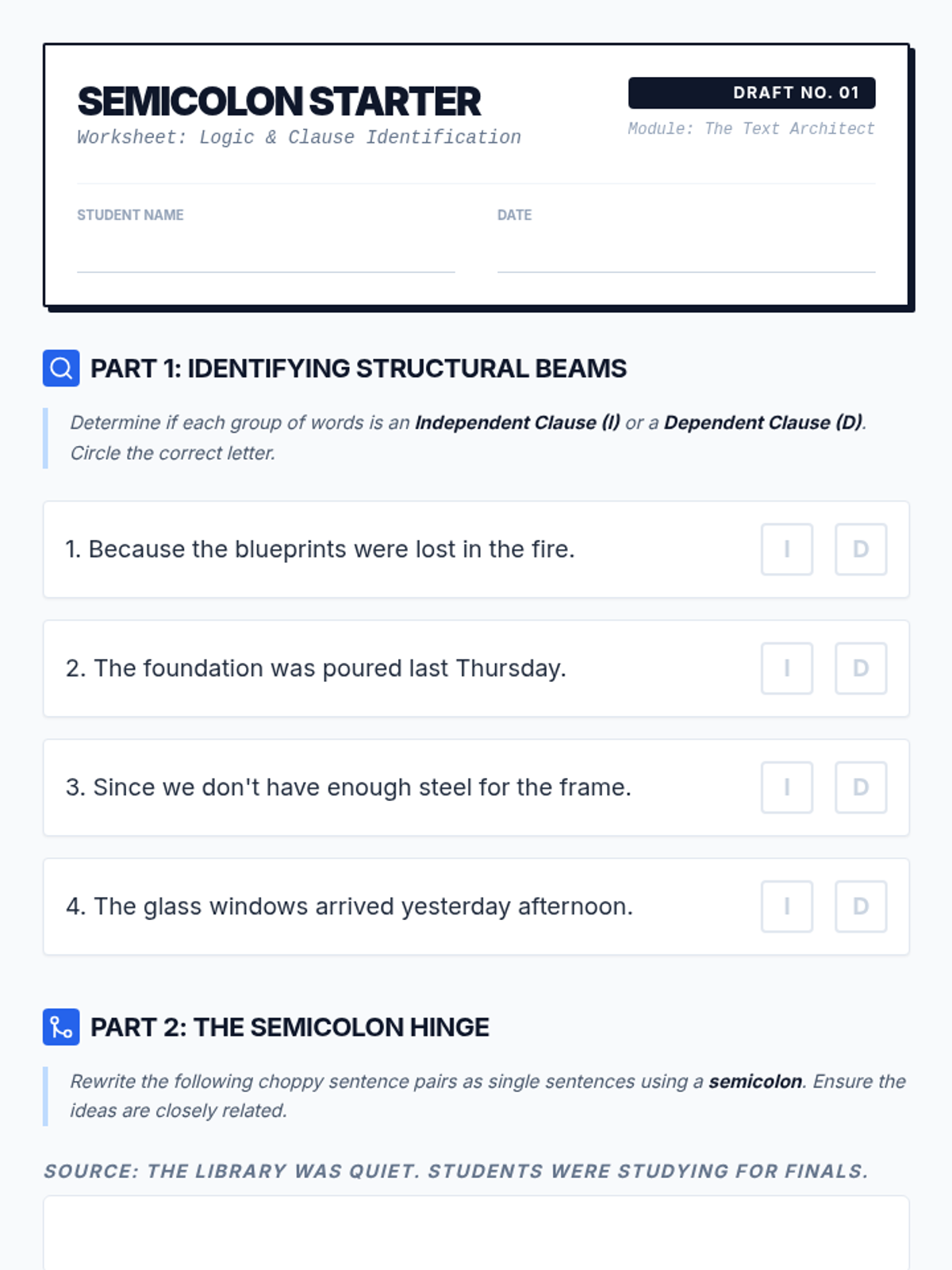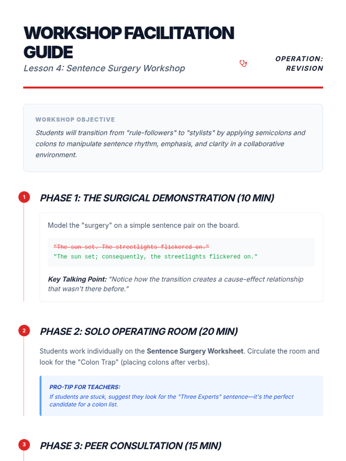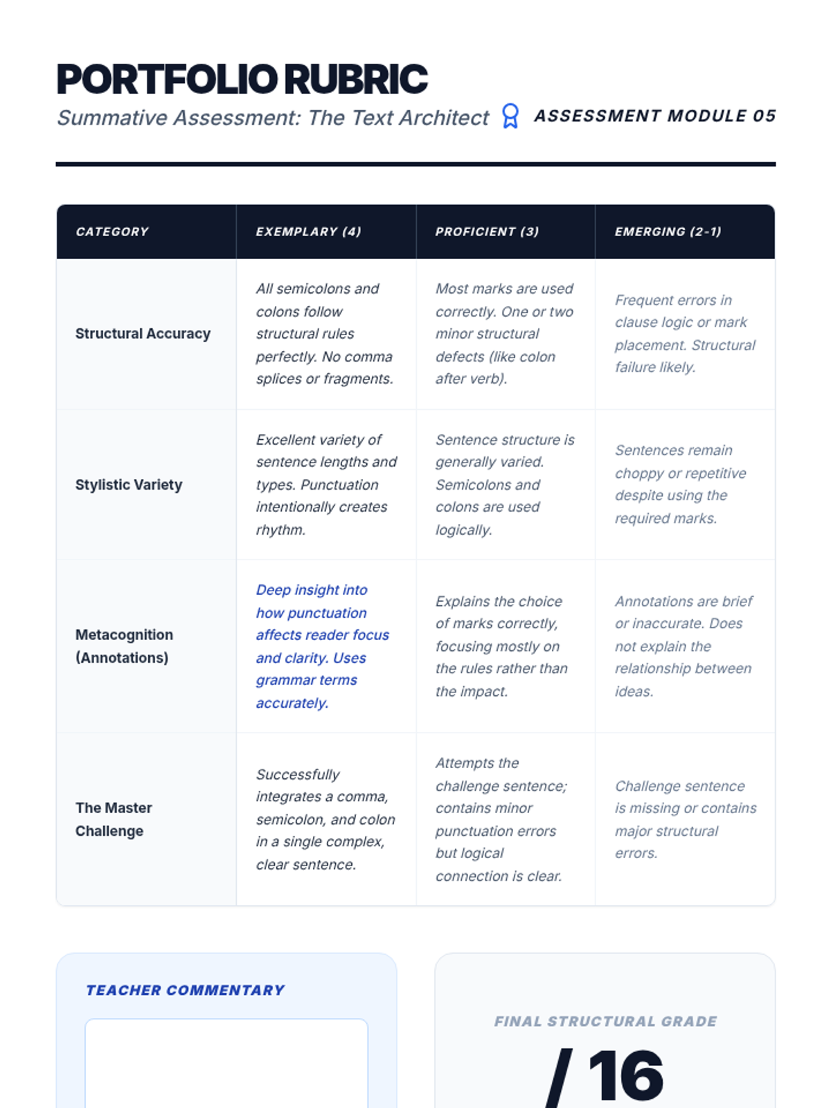 A comprehensive 10th-grade ELA unit focusing on the sophisticated use of semicolons and colons to enhance sentence variety and clarity. Students progress from clause basics to complex stylistic revision.