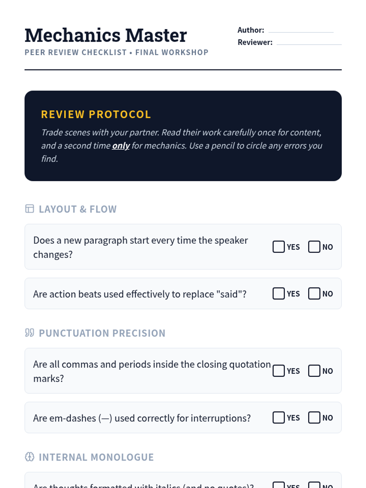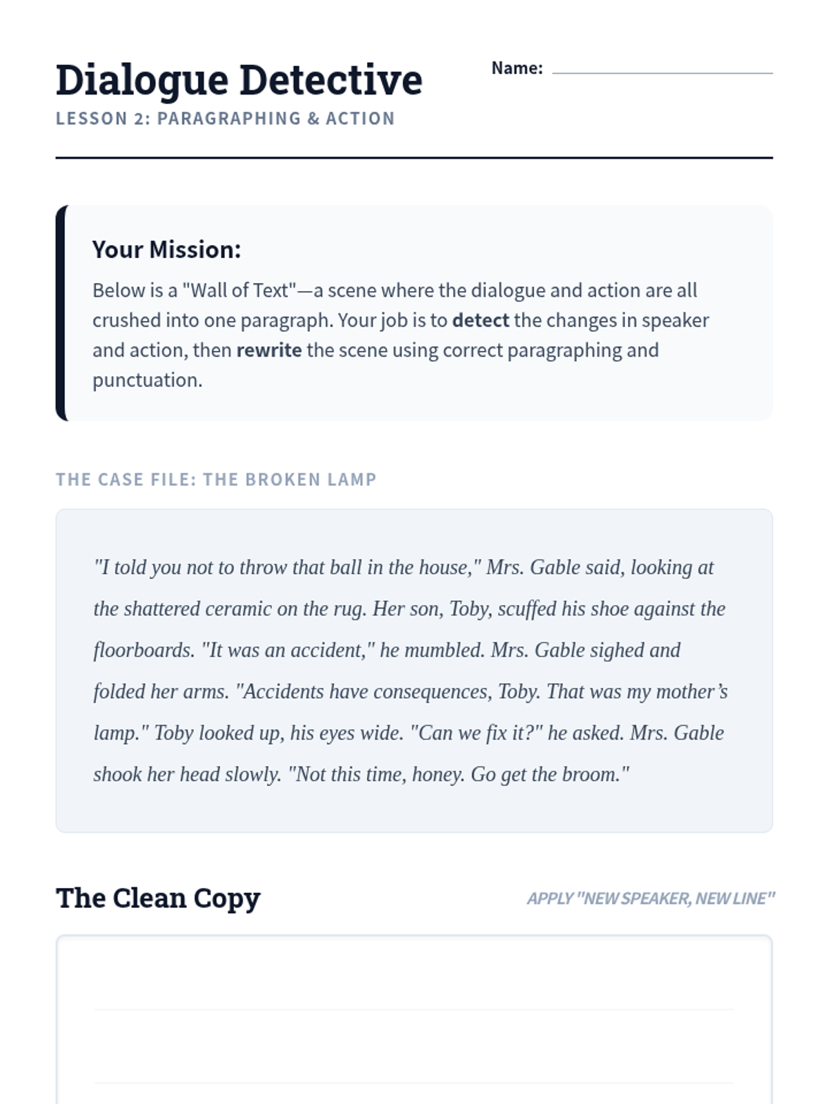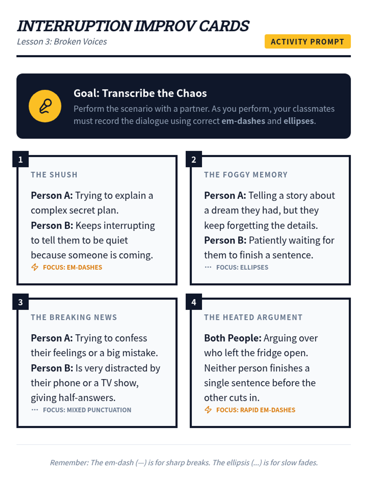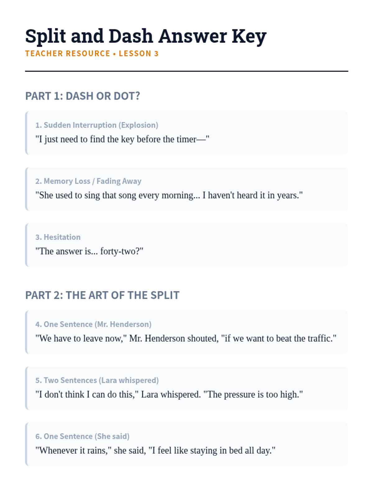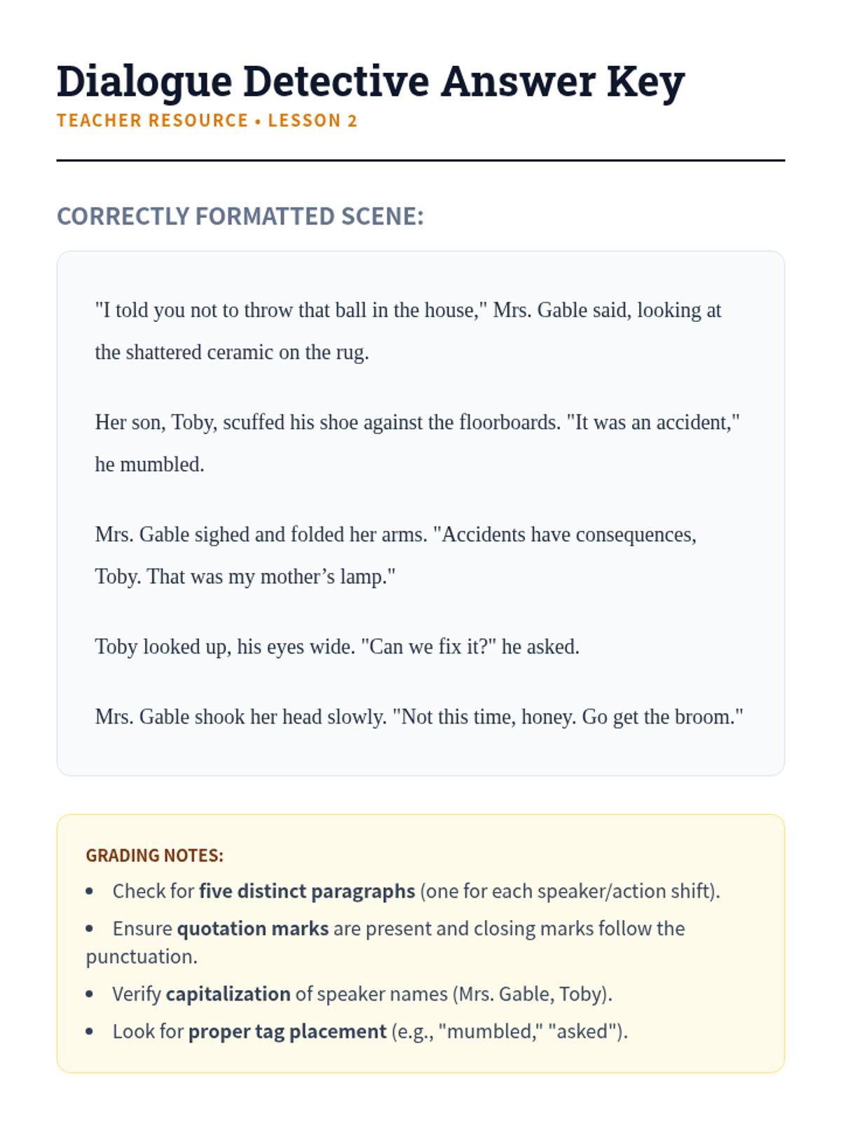 A comprehensive 10th-grade sequence on formatting dialogue and narrative mechanics. Students master quotation marks, paragraphing for multiple speakers, em-dashes for interruptions, and formatting internal thoughts to enhance clarity and pacing in creative writing.