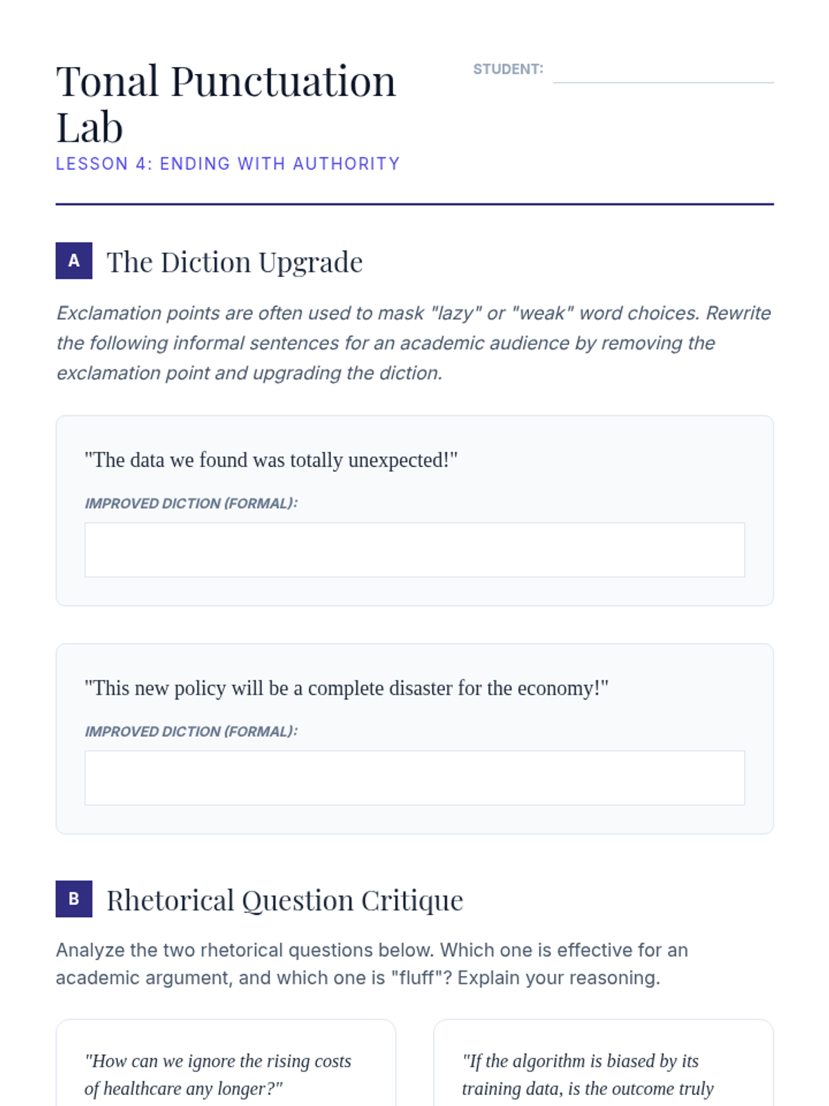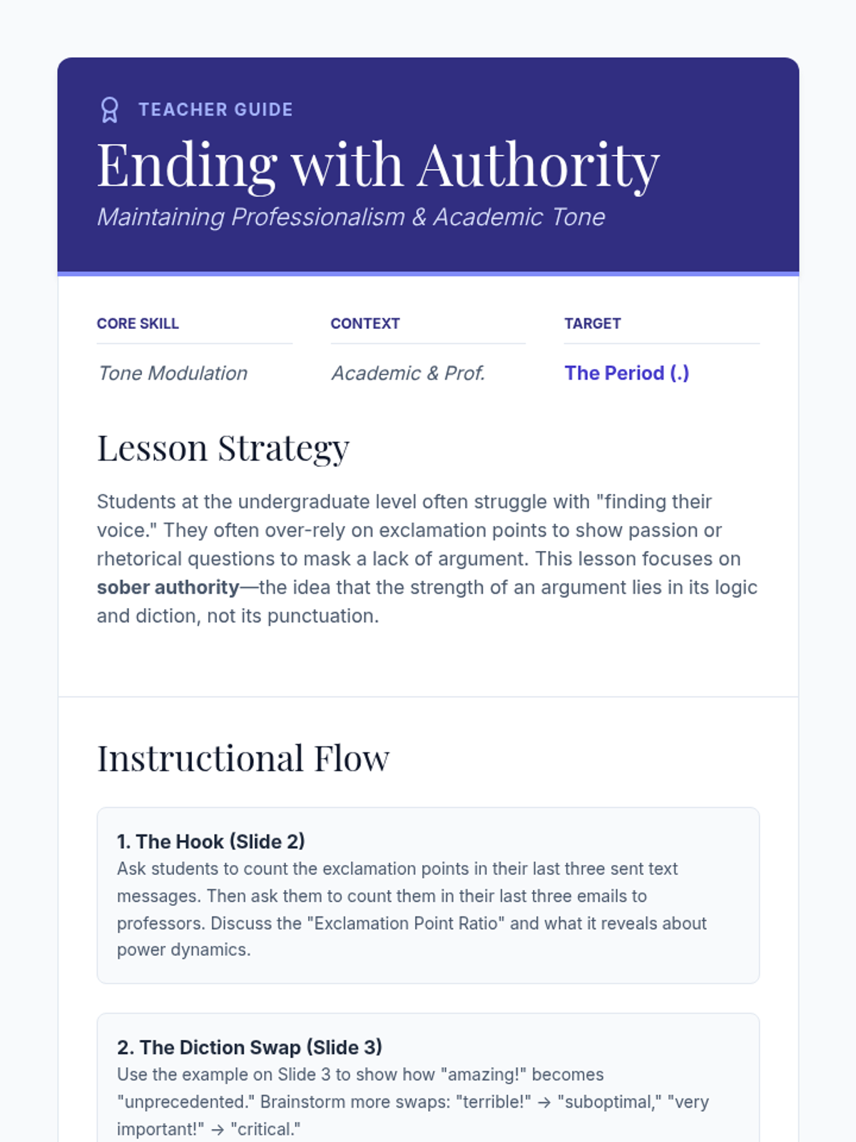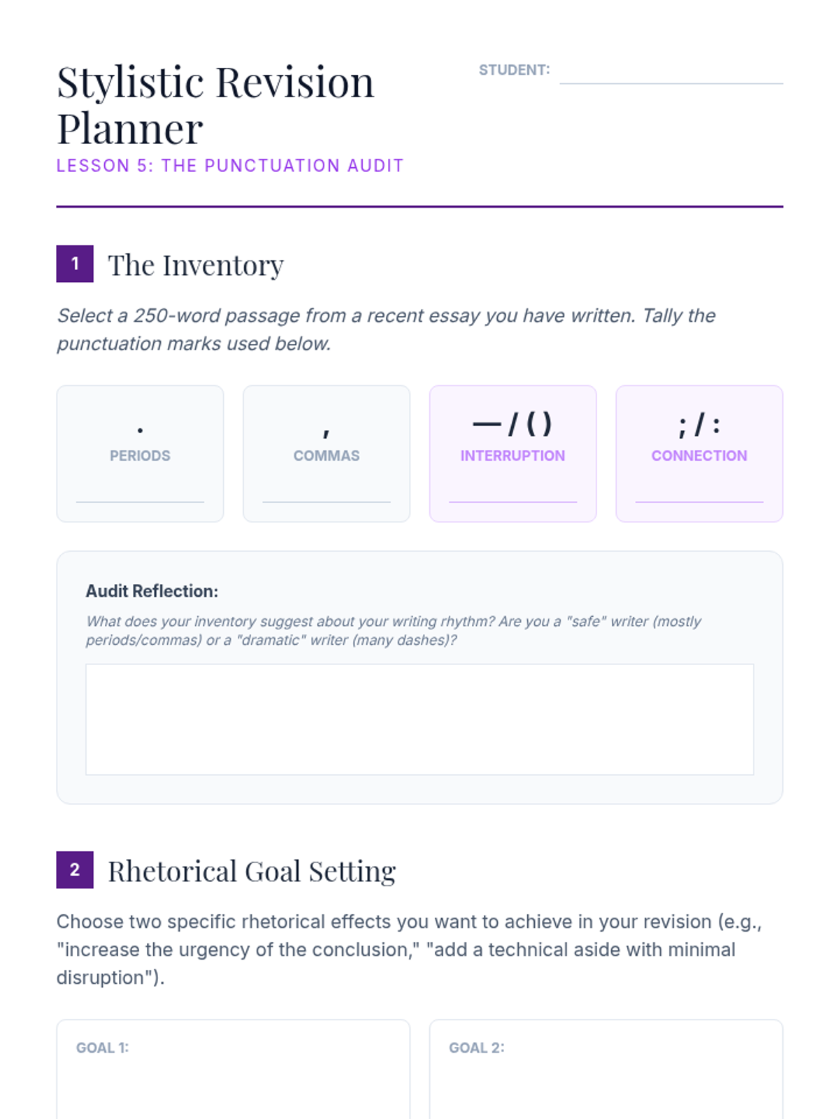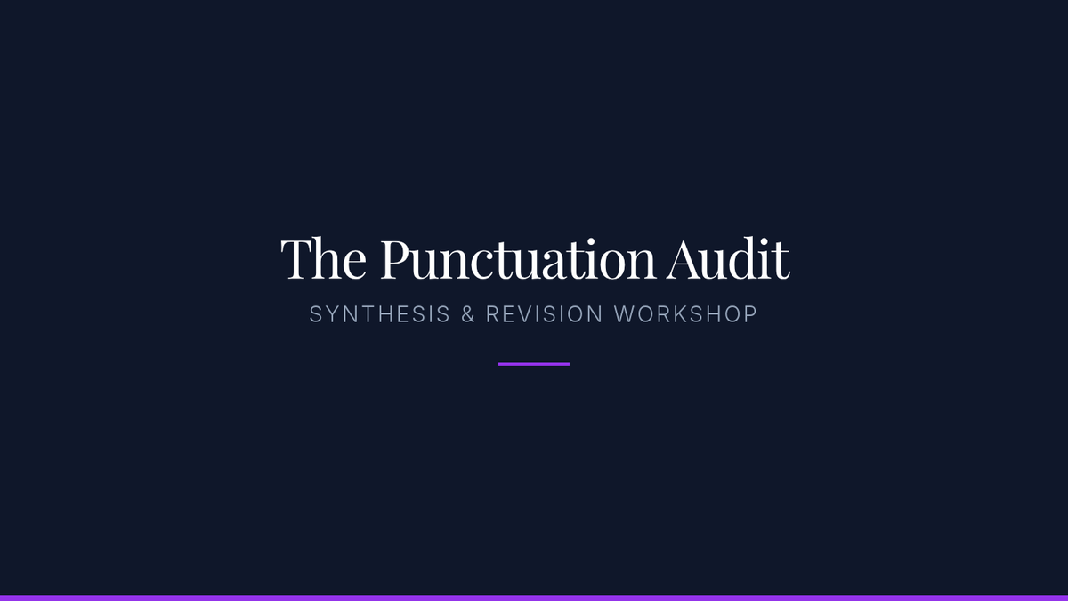 An advanced exploration of punctuation as a rhetorical tool, moving beyond basic rules to examine how dashes, fragments, and end marks shape authorial voice and rhythm. Designed for undergraduate students to master stylistic control.