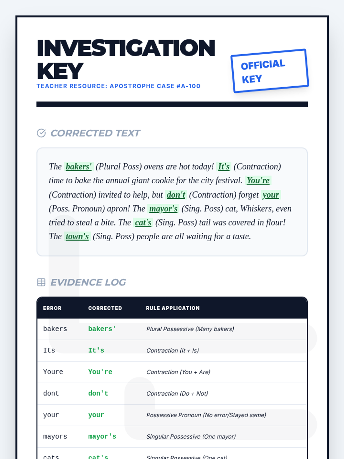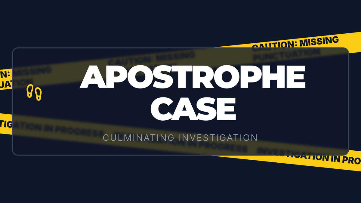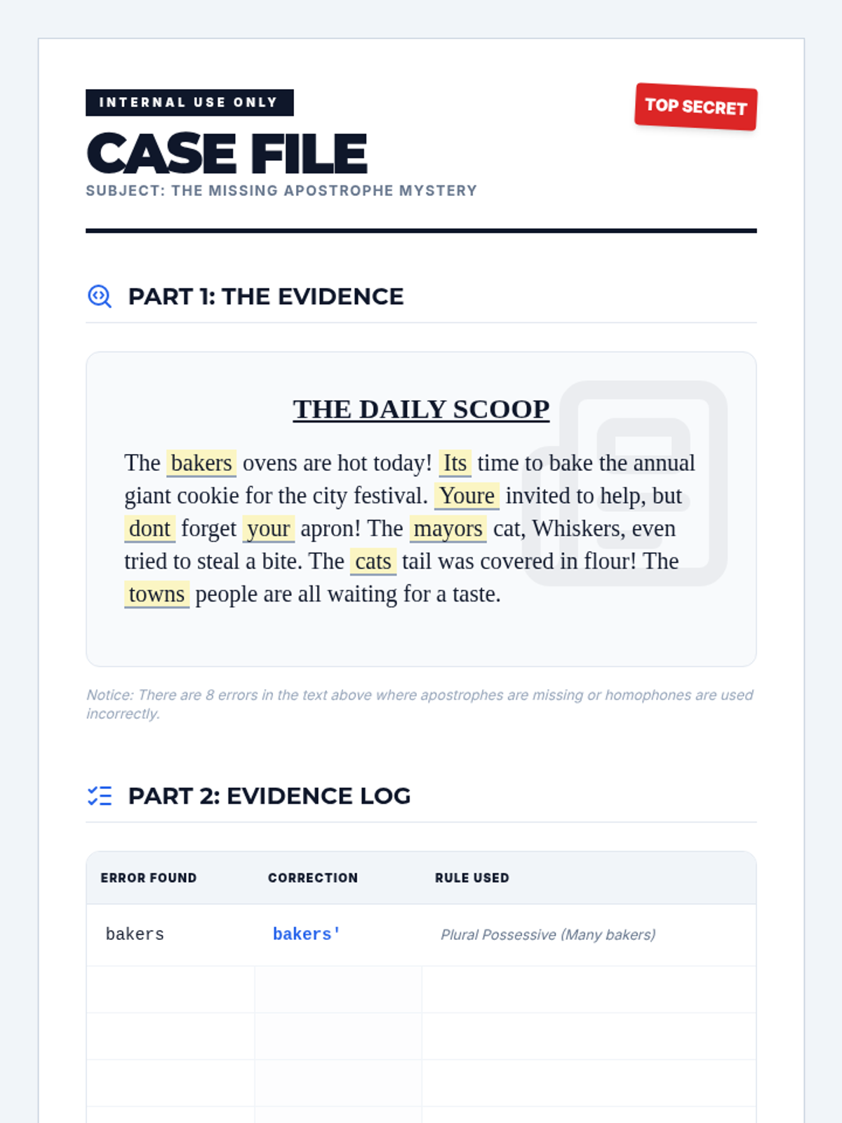 An inquiry-based exploration of apostrophes, covering singular and plural possessives, contractions, and tricky homophones through the lens of 'word surgery' and 'punctuation investigations.'